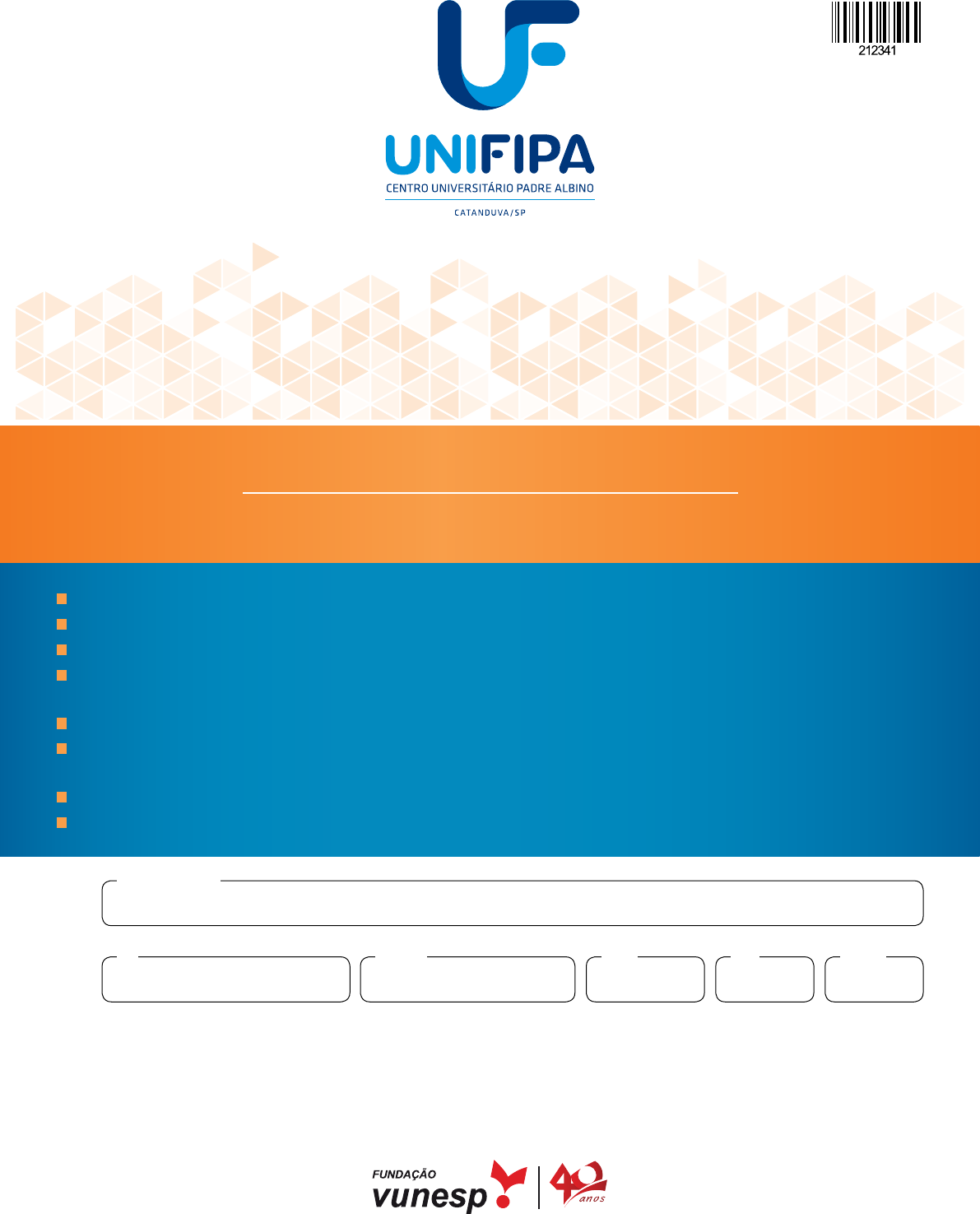 12.10.2019 Nome do candidato Prédio Sala CarteiraInscriçãoRG Confira seus dados impressos neste caderno. Assine com caneta de tinta preta a Folha de Respostas apenas no local indicado. Esta prova contém 86 questões objetivas. Para cada questão, o candidato deverá assinalar apenas uma alternativa na Folha de Respostas, utilizando caneta de tinta preta. Encontra-se neste caderno a Tabela Periódica, que poderá ser útil para a resolução de questões. Esta prova terá duração total de 4h e o candidato somente poderá sair do prédio depois de transcorridas 3h, con- tadas a partir do início da prova. Os últimos três candidatos deverão se retirar juntos da sala. Ao final da prova, antes de sair da sala, entregue ao fiscal a Folha de Respostas e o Caderno de Questões. PROCESSO SElETIvO vESTIbulAR | Medicina 2020 001. prova de conheciMentos gerais 2FMCA1803 | 001-ConhecGerais 3 FMCA1803 | 001-ConhecGerais QUestÃo 01 Segundo o site da Associação Brasileira da Indústria de Café (ABIC), estima-se que o brasileiro consome, em média, 817 xícaras de café no ano, o que resulta em aproximadamente 33 litros de café. Além disso, segundo dados da consultoria Euromonitor International, o Brasil consome 15% de todo o volume de café bebido no mundo. Considerando que a população brasileira é de aproximada- mente 208 milhões de habitantes, estima-se que o volume de café consumido no mundo, por ano, é da ordem de, aproxi- madamente, (A) 4,6 × 109 litros. (B) 1,0 × 109 litros. (C) 1,0 × 1010 litros. (D) 5,9 × 109 litros. (E) 4,6 × 1010 litros. QUestÃo 02 A quantidade de ancestrais de uma pessoa dobra a cada ge- ração. Cada pessoa tem 2 pais, 4 avós, 8 bisavós, 16 trisa- vós (comumente chamado de tataravós), e assim por diante. Considerando que em um total das primeiras 4 gerações uma pessoa tem 30 ancestrais, nas primeiras 11 gerações, o nú- mero de ancestrais dela é igual a (A) 4 094. (B) 4 064. (C) 8 190. (D) 2 018. (E) 2 048. QUestÃo 03 Uma pesquisa publicada em novembro de 2017 no perió- dico acadêmico Nicotine & Tobacco Research traz novos da- dos sobre o poder viciante ligado ao simples contato primário com o cigarro. O objetivo era esclarecer a dúvida: “Qual é a proporção de pessoas que fumam um cigarro e se tornam fumantes cotidianos?” Segundo a análise, 69% daqueles que fumaram um pri- meiro cigarro se tornaram fumantes cotidianos, mesmo que temporariamente. O tamanho da “taxa de conversão” reforça a importância de políticas públicas com o intuito de desincen- tivar jovens a experimentarem a droga. (André Cabette Fábio. “Qual a chance de alguém se tornar fumante após o primeiro cigarro?” www.nexojornal.com.br, 30.01.2019. Adaptado.) Considere um grupo de N jovens que nunca havia fumado e que decidiu fumar o primeiro cigarro. Segundo a matéria, após esse primeiro contato, a probabilidade de que nenhum deles se torne fumante cotidiano é igual a (A) (B) (C) (D) (E) QUestÃo 04 O ouro é uma das principais matérias-primas para a confec- ção de joias. No entanto, para que possa ser modelado, é necessário que outros metais sejam adicionados a ele, for- mando uma liga. Dependendo dos metais e da quantidade adicionada, obtém-se diferentes colorações de ouro. A seguir tem-se a matriz C, que detalha a composição das ligas utiliza- das por uma fábrica de joias para obtenção de 5 colorações de ouro (nas colunas constam os percentuais de cada metal e, nas linhas, os percentuais desses metais e a correspon- dente coloração obtida), e a matriz P, com o preço, em reais, estipulado por essa fábrica, do grama trabalhado de cada metal utilizado. Dado que o produto das matrizes C × P determina o preço do grama de ouro de cada coloração, uma joia feita com 4 g de ouro branco terá um custo entre (A) R$ 750,00 e R$ 775,00. (B) R$ 775,00 e R$ 800,00. (C) R$ 675,00 e R$ 700,00. (D) R$ 850,00 e R$ 875,00. (E) R$ 650,00 e R$ 675,00. 4FMCA1803 | 001-ConhecGerais QUestÃo 06 O setor de projetos de uma fábrica de chocolates está pro- pondo o lançamento de um novo produto, no formato de uma semiesfera maciça de chocolate recheada com outra semies- fera maciça de trufa, conforme esquema a seguir: Para fins de custos, decidiu-se que o volume do chocolate seria igual a 7 vezes o volume da trufa. Para isso, o raio r da semiesfera de trufa deve ser igual a (A) (B) (C) (D) (E) QUestÃo 07 Uma reportagem que apontou os benefícios da atividade fí- sica na diminuição da taxa de mortalidade apresentou, como recomendação, 30 minutos de caminhada pelo menos 3 ve- zes por semana. Um leitor, ao se dar conta de que não havia feito qualquer atividade física nos últimos 4 anos, decidiu acabar com seu sedentarismo. De início, pensou em compensar o tempo per- dido, fazendo uma única caminhada. Para isso, calculou o tempo que deveria ter passado caminhando nos últimos 4 anos, considerando 52 semanas por ano e a recomendação de 30 minutos de caminhada, 3 vezes por semana. Após finalizar corretamente os cálculos percebeu que seria inviável compensar o tempo perdido em uma única caminha- da, pois teria que caminhar ininterruptamente por (A) 3 dias. (B) 10 dias. (C) 13 dias. (D) 26 dias. (E) 4 dias. QUestÃo 05 A fim de produzir celulares mais estreitos, certos fabricantes deixaram de adotar modelos com a proporção 16 : 9 nas di- mensões de suas telas para adotar modelos com a proporção 18 : 9. A tela de um celular na proporção 16 : 9 e diagonal de 5 polegadas tem área aproximada de 10,7 polegadas quadradas. Considere a figura que representa a tela de um celular na proporção 18 : 9 e diagonal 5 polegadas. Em relação ao modelo na proporção 16 : 9, o modelo na pro- porção 18 : 9 terá área de tela (A) 2,0 polegadas quadradas menor. (B) 0,7 polegada quadrada menor. (C) 2,3 polegadas quadradas menor. (D) 2,5 polegadas quadradas maior. (E) 1,3 polegada quadrada maior. 5 FMCA1803 | 001-ConhecGerais QUestÃo 11 Uma em