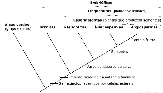 EVOLUÇAÕ E CLASSIFICAÇÃO DAS PLANTAS 1. Origem e classificação das plantas · Acredita-se que as plantas tenham surgido a partir de um grupo ancestral de algas verdes, pois existem várias características que as aproximam, como a presença de clorofila a e b nos cloroplastos e a presença de parede celular composta principalmente de celulose. · Por reterem os embriões em seus corpos, as plantas são chamadas embriófitas. · Cladograma da evolução das plantas: · Tradicionalmente as plantas são divididas em · Criptógamas: plantas que têm as estruturas reprodutoras pouco evidentes. Ex.: Musgos · Briofitas: não apresentam xilema e floema, tecidos verdadeiros e especializados, respectivamente, para o transporte de seiva bruta (água e sais minerais) e elaborada (água e substancias oprganicas derivadas da fotossíntese); são plantas de pequeno porte. Ex.: Musgos · Pteridófitas: têm xilema e floema. Ex.: Samambaia · Fanerógamas: plantas que possuem estruturas reprodutoras bem visíveis. Todas desenvolvem sementes e por isso também são denominadas espermatófitas. Ex.: Pinheiros · Gmnispermas: têm sementes, mas não formam frutos. Suas sementessão chamadas “nuas”, pois não estão abrigas no interior de frutos. Ex: Pinheiro · Angiosperma: apresentam sementes abrigadas no interior de frutos. Os frutos são resultantes do desenvolvimento do ovário da flor. Ex.: Mangueira Obs.: 1- Por apresentar xilema e floema as pteridófitas e todas as fanerógamas são chamadas plantas vasculares ou traqueófitas; já as briófitas, que não tem esse tecido, são atraqueófitas. 2- O corpo das plantas vasculares é constituído basicamente por raiz, caule e folhas, enquanto nas briófitas fala-se em rizóide, caulóide e filóide. · Todas as plantas apresentam ciclo de vida do tipo haplonte-diplonte: há alternância de gerações (metagênese), em que a geração gametofítica se alterna com a esporofitica. · Esquema das fases gametofítica (parte debaixo) e esporofítica (parte de cima ) comparando o desenvolvimento relativo dessas fases nos ciclos de vida dos diferentes grupos de plantas. · Na evolução das plantas verifica-se, uma redução da fase gametofítica e maior desenvolvimento da fase esporofítica. 2- Briófitas · Apresentam características de transição do ambiente aquático para o terrestre. · As briófitas não possuem raízes e a absorção de água do meio ocorre diretamente através da superfície do corpo gametófito em contato com o substrato, fico pelo meio de estruturas chamadas rizóides. · As briófitas não têm estruturas adequadas para evitar a transpiração intensa. · Revestindo as células da epiderme há uma fina cutícula com cera, o que colabora para reduzir a perda de água por transpiração. Elas também apresentam uma estrutura análoga ao estômato das plantas vasculares, essa estrutura apresenta um poro através do qual acontecem as trocas gasosas entre a planta e o meio e há o controle da saída de água por transpiração.. Entretanto a cutícula e o poro não são capazes de evitar uma transpiração intensa. · São plantas mais comuns em ambientes úmidos e sombreados. · Outra característica das briófitas que marca a dependência em relação a água è a presença de gametas masculinos flagelados (anterozóides), que deslocam-se de modo eficiente em meio liquido, como também ocorre nas algas (exceto nas vermelhas) e nas pteridófitas. No ambiente terrestre há necessidade de gotas de orvalho ou de chuva para que eles cheguem até os gametas femininos, que são imóveis. Obs.: Gametas não flagelados chamados de células espermáticas. · O termo briófitas se refere na verdade a três filos distintos HEPATICAS (Filo Hepatophyta) · Os gametófitos tem corpo achatado ou folhoso, e se fixam no solo por meio de rizóides. Esse gametófitos formam estruturas especiais chamadas gametóforos onde estão os gametângios. Após a fecundação, o ovo ou zigoto(2n) dá origem ao esporófito, muito reduzido; · Há espécies que retornaram secundariamente para o ambiente aquático. ANTÓCEROS (Filo Antocerophyta) · O gametófito apresenta corpo mutilado e o esperófito é alongado, ereto. MUSGOS · Além de rizóides, os gametófitos geralmente possuem um eixo principal – caulóide – de onde partem os filóides. · As trufas são desse filo. · O esporófito desenvolve-se sobre o gametófito e é formado pelo pé, seta e cápsula, no interior da qual está o esporângio, onde haverá a formação de esporos por meiose. · Em muitos musgos, no caulóide do gametófito e na seta do esporófito, existem células especializadas para o transporte de água e sais minerais. Essas células, quando diferenciadas, ficam apenas com a parede celular, à semelhança do que acontece com as traqueídes, células típicas do xilema. · Em alguns gêneros de musgos, há também células especializadas no transporte de substancias orgânicas. Quando diferenciadas, essas células perdem o núcleo, mas mantêm o citoplasma, a membrana plasmática e a parede celular, à semelhança do que acontece com células de mesma função no floema das plantas vasculares. 2.1 Ciclo de Vidas dos musgos · Os musgos são geralmente dióicos, o que significa que a planta ou é masculina ou é feminina, isto é, os sexos acham-se separados. Ao atingir a maturidade sexual, os gametófitos, produzem gametângios, em cujo interior são produzidos os gametas. Do musgo masculino os anterozóides podem alcançar o musgo feminino através dos borrifos de chuva; então "nadam" em direção ao arquegônio. A união entre o anterozóide e a oosfera, que configura a fecundação e ocorre no arquegônio, determina a formação do zigoto (2n). Este se desenvolve e origina oesporófito (2n), produtor de esporos, que cresce sobre o gametófito feminino (n), obtendo daí seu alimento. O esporófito é constituído de uma haste em cuja extremidade se forma uma capsula, qu