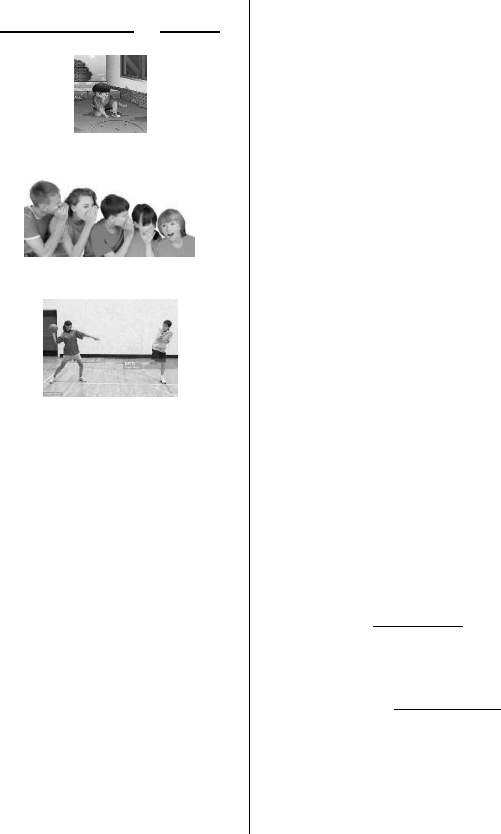ENGLISH TEST – 7TH GRADE Name: Date: / / 1- Marque a opção correta: a) Tag. c) Marbles. b) Tug of war. d) Hopscotch. 2- Marque a opção correta: a) Chinese whispers. c) Jumping rope. b) Tug of war. d) Hide and seek. 3- Marque a opção correta: a) Leapfrog c) Hide and seek. b) Basketball. d) Dodgball. . Read the text and answer the questions: My childhood My name is Rachel. I used to live in Fortaleza when I was a kid. I used to play tag, hopscotch and jumping rope with my friends. I had a happy childhood. 4- Rachel costumava brincar de … a) Pega-pega e esconde-esconde. b) Amarelinha e esconde – esconde. c) Pega-pega e amarelinha. d) Pega-pega e carimba. 5- Rachel não costumava brincar de ... a) Pega-pega. b) Amarelinha. c) Pular corda. d) Queimada. 6- Marque a opção na qual o verbo to be no passado está sendo utilizado de forma errada: a) We were on the beach yesterday. b) I was studying last night. c) They was playing cards. d) She was cooking dinner. 7- Marque a opção na qual o verbo to be no passado está sendo utilizado de forma errada: a) You was watching tv yesterday. b) I was studying last night. c) They were playing basketball. d) She was cooking dinner. Read the text and answer the questions NEW YORK IN 1900 What was New York like in 1900? It was very different to New York today. Let’s see! In 1900 New York city was a very big city. There were more than three million people. It was the biggest city in the USA. In 1900 in New York there weren’t any very tall buildings, called skycrapers, but there were some some big buildings. Skycrapers: arranha-céus Buildings: prédios 8- O assunto principal do texto é: a) As características de Nova Iorque do presente. b) As semelhanças entre Nova Iorque do passado e do presente. c) Os tipos de prédios que existiam. d) Como era a Nova Iorque do passado. 9- Segundo o texto, quantas pessoas moravam em Nova Iorque em 1900: a) 3 milhões de pessoas. b) 4 milhões de pessoas. c) 5 milhões de pessoas. d) 6 milhões de pessoas. Read the text and answer the questions Hello! My name is Vicky. I am a student. Yesterday was Sunday. It was a nice day. In the morning we were at the shopping centre. In the afternoon we were at the playground. Then we were at the fast-food restaurant. In the evening I was at the book shop. My friends were at the park. It was an interesting day. 10- Vicky foi para o no domingo de manhã: a) Restaurant. b) Book shop. c) Playground. d) Shopping centre. 11- Vicky foi para a no domingo a noite: a) Loja de livros. b) Restaurante. c) Playgound. d) School. 12- Diga o gênero correto do filme abaixo: a) Drama. b) Comedy. c) Adventure. d) Horror. 13- Diga o gênero correto do filme abaixo: a) Adventure. b) Sci-fi. c) Horror. d) Thriller. 14- Diga o gênero correto do filme abaixo: a) Romance. b) Drama. c) Thriller. d) Horror. 15- O filme acima pertence aos gêneros: a) Ação, suspense, ficção científica. b) Horror, aventura, ação c) Ação, aventura, ficção científica. d) Ação, drama, aventura. 16- A faixa etária do filme é: a) 13 anos. b) 14 anos. c) 15 anos. d) 16 anos. 17- A duração do filme é: a) 2hr 16 min. b) 2hr 14 min. c) 2hr 59 min. d) 2hr 20 min Read the text and answer the questions: Leia o texto abaixo. Hi! I’m Jane. Everyday I wake up at 8 o’clock, have breakfast with my family and I go to work. At noon, I have lunch and I read a book. I finish my work at 6 o’clock in the evening. I go home, cook dinner and I take a shower. Finally, I have dinner and I go to bed. Disponível em: https://bityli.com/JYJQw. Acesso em: 29 jun. 2022. Fragmento. 18- Nesse texto, no trecho “Hi! I’m Jane.”, a expressão em destaque foi utilizada para A) descrever uma ação. B) identificar uma pessoa. C) mostrar um sentimento. D) noticiar um acontecimento. 19- O que Jane faz quando chega em casa? ________________________________________________ ________________________________________________ 20- Que horas ela termina de trabalhar? ________________________________________________ ________________________________________________