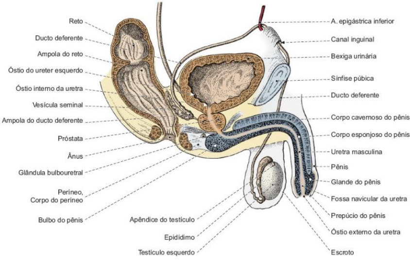 O sistema genital é o conjunto de órgãos responsáveis pela reprodução, que é a capacidade de os seres vivos gerarem outro indivíduo da mesma espécie e com as mesmas características. Sistema genital masculino É formado pelas gônadas (testículos), vias espermáticas (epidídimo, ducto deferente, ducto ejaculatório e uretra), glândulas acessórias (glândulas seminais, próstata e glândulas bulbouretrais), e ainda os órgãos genitais externos (pênis e escroto) Testículos Os testículos (direito e esquerdo) são as gônadas masculinas responsáveis pela produção dos gametas – os espermatozoides –, e também da testosterona, hormônio responsável pelas características sexuais secundárias do homem. Localizam-se no interior do escroto, separados por um septo fibroso mediano, e são revestidos externamente pela túnica albugínea. Epidídimo Órgão em forma de “C” que fica aderido à parte posterior do testículo, sendo facilmente palpável. Possui cabeça superior, corpo central e cauda inferior. É o local de armazenamento e maturação dos espermatozoides e forma a parte inicial da via espermática. Ducto deferente Longo tubo que liga a cauda do epidídimo ao ducto ejaculatório e tem seu trajeto ascendente pela parte superficial da região pélvica até passar pelo canal inguinal. Nesse trajeto, é acompanhado por artérias, veias, nervos e linfáticos em uma mesma bainha, formando o funículo espermático. Ao atravessar o canal inguinal, o ducto deferente segue lateral e superiormente à bexiga até sua região posterior, onde se alarga para formar a ampola e se encontra com o ducto excretor da glândula seminal, formando, então, o ducto ejaculatório. Formado a partir da união do ducto deferente com o ducto da glândula seminal, o ducto ejaculatório passa por dentro da próstata, desembocando na uretra. Glândulas seminais São duas bolsas localizadas lateralmente na parte posterior e inferior da bexiga, cuja secreção serve para ativar e nutrir os espermatozoides, colaborando na maior parte da formação do sêmen. A secreção é eliminada pelo ducto excretor, que se une ao ducto deferente, formando o ducto ejaculatório. Próstata É um órgão localizado inferiormente à bexiga e anteriormente ao reto e atravessado pela uretra e pelo ducto ejaculatório. Internamente, é formada por pequenas glândulas que lançam sua secreção diretamente na uretra, aumentando a quantidade do sêmen e dando seu odor característico. Uretra A uretra é um longo tubo de tamanho variável que, ao sair da bexiga, atravessa a próstata, o assoalho pélvico e o pênis. Por isso, apresenta três partes: prostática, membranácea e esponjosa, respectivamente. No homem, funciona como via urinária e espermática. Glândulas bulbouretrais São duas pequenas glândulas localizadas no assoalho pélvico, inferiormente à próstata, que secretam um líquido seroso que compõe o sêmen, liberado assim que ocorre a ereção com a finalidade de neutralizar o pH da uretra para a passagem dos espermatozoides e lubrificar a glande. Sua secreção é lançada diretamente na uretra esponjosa. Pênis É o órgão de cópula masculino, localizado na parte anteroinferior da pelve. Tem tamanho variável e é recoberto por uma pele fina e distendível. Internamente, é formado por dois corpos cavernosos superiores e um corpo esponjoso inferior, atravessado pela uretra. Esses órgãos constituem a parte erétil do pênis e, ao se encherem de sangue, fazem com que o pênis saia do estado de flacidez para o estado de rigidez, fenômeno chamado de ereção. O pênis apresenta uma raiz ligada à pelve e uma parte livre, o corpo do pênis. O corpo esponjoso tem uma dilatação inicial, o bulbo do pênis, e outra na parte livre, a glande do pênis, onde se abre o óstio externo da uretra. A glande é recoberta por uma pele, o prepúcio, que fica aderida ao órgão pelo frênulo do prepúcio. Na ereção, essa pele se retrai para expor a glande e facilitar a cópula. Escroto É uma bolsa localizada abaixo da sínfise púbica, externamente constituída de pele pigmentada e provida de pelos, onde se alojam os testículos. Internamente, apresenta uma camada muscular, a túnica dartos, e um septo mediano para a separação dos testículos. Além de alojar os testículos, o escroto tem a capacidade de aproximá-los ou afastá-los da cavidade pélvica, mantendo, assim, a temperatura ideal para a produção dos espermatozoides. Sistema genital feminino O sistema genital feminino pode ser dividido em órgãos genitais internos, compostos por ovários, tubas uterinas, útero e vagina; e órgãos genitais externos, também denominados pudendo (vulva), formados por monte do púbis, lábios maiores do pudendo, lábios menores do pudendo, clitóris, bulbo do vestíbulo e glândulas vestibulares maiores. Órgão genitais internos Ovários Os ovários (direito e esquerdo) são as gônadas femininas, onde são produzidos os gametas femininos, que são os ovócitos, e os estrógenos, hormônios responsáveis pelos caracteres sexuais secundários da mulher. Diferentemente do homem, a mulher já nasce com um número predeterminado de ovócitos e, ao alcançar certa idade, deixa de ovocitar, fenômeno conhecido como menopausa. Os ovários estão fixados ao ligamento largo do útero pelo mesovário (ligamento suspensor do ovário) e também ao útero pelo ligamento útero-ovárico. Tubas uterinas São dois tubos (direito e esquerdo) que servem para transportar o ovócito dos ovários até o útero e também como via de condução dos espermatozoides. As tubas uterinas apresentam as porções do istmo (próximo ao útero), ampola (porção mais dilatada onde ocorre a fecundação) e infundíbulo (próximo aos ovários), onde se encontra o óstio da tuba uterina, circundado por pequenas terminações franjeadas chamadas de fímbrias. As fímbrias captam o ovócito sobre os ovários, conduzindo-o para o interior da tuba u