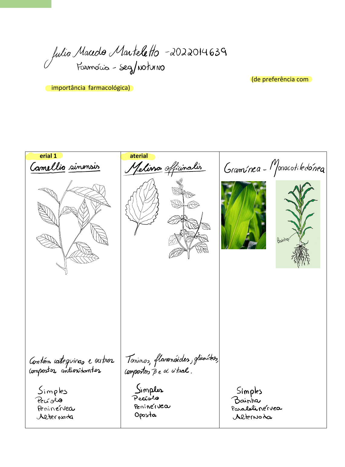BOTÂNICA APLICADA À FARMÁCIA: MORFOLOGIA EXTERNA E INTERNA 31 INÍCIO DE ATIVIDADES PRÁTICAS!!! (em dupla) Nome e número de matrícula: _____________________________________________________________________________ TURMA: __________________________ ATIVIDADE 1. Levar ramos contendo folhas de três plantas diferentes (de preferência com importância farmacológica) para a prática; Desenhe e caracterize os materiais vegetais quanto a: a) ORGANIZAÇÃO: folha simples ou folha composta; b) PRESENÇA DE: pecíolo e/ou bainha; c) NERVURAS: peninérvea ou paralelinérvea; d) FILOTAXIA: oposta, alterna, verticilada. Material 1 a) ________________________ b) ________________________ c) _________________________ d) ________________________ Material 2 a) ________________________ b) ________________________ c) _________________________ d) ________________________ Material 3 a) ________________________ b) ________________________ c) _________________________ d) ________________________ JuliaMacedoMarteletto -2022014639 Farmácia - Seg/Noturno Camelliainensis Gramínea - Monocotiledónea ↳- N Helia final it 9E-- /- I/-i - / M S-"I V47 * gl*, .. I SI - I" - *I- & ↳// S E-il *,".*-* IW Il W! " &E S / -e// / ->x)= I I e S - Bainhas I- I⑰a ---ovi- -#"III - E* C Int / I -I-W-I #S I 1. "I -, ti x Contercatequinas e outros Tanimo, flavonoides,glizider, compostos antioxidantes comportose a citual. Simples Simples Simples Pecido Pecíolo Bainha Peninérvea Peninérrea Paralelinérvea Deterwada Oposta deternada BOTÂNICA APLICADA À FARMÁCIA: MORFOLOGIA EXTERNA E INTERNA 32 ATIVIDADE 2. Observe e desenhe os cortes transversais das folhas de: I) Cymbopogon citratus (capim limão) e II) Ocimum basilicum (manjericão), identificando (com setas e nomes) as estruturas abaixo (quando presentes): a) Epiderme abaxial e adaxial (cutícula, células epidérmicas, estômatos, tricomas tectores, tricomas glandulares); b) Mesofilo (colênquima, esclerênquima, parênquima paliçádico, parênquima lacunoso); c) Feixes vasculares (floema, xilema, fibras). I) Nome científico: _________________________ II) Nome científico: _________________________ ATIVIDADE 3. Use características microscópicas para explicar como podemos classificar as duas espécies acima em Monocotiledônea ou Eudicotiledônea: __________________________________________________________________________ __________________________________________________________________________ __________________________________________________________________________ __________________________________________________________________________ __________________________________________________________________________ ManjericEO Capim limi imumum Ba Cymbopogon ratus-~- - ~ 3MONO - --F Estômato Epiderme adaxial A epiderme odaxice ↑ ⑨ ↑ Fibran h Nilma1 - ~ Mesofilo - -> Parênquima D 1.paligádica - ↳ Fu loema lacumoso 1 -> Parênquima FV =Feixe vascular ↓ Epiderme aboxiaeCB =clulas buliformes Epiderme abaxial PT=Protoxilema Ba=Bainha de Krany Obs: colênquima - Abaixo da epideme, em áreas me=Metaxilema que precisar de maior sustentasão. (Azul de Astra, F=Floema ↑reagais o que resulta a pigmentaçãoague interno Eschnquima Fibras testeredes (Sofraninal Eucotiledôneas monocotiledôneas Omerófilo édiferenciado em palisádico e lawnoso - Indiferenciado O feixes estão organizados de forma irregular - Paralelamente Não há clulas buliformes - Presentes na epiderme adaxial Muitos elementasde voo em - Lelementos devano do metaxilema Cada fin + 2 do protoxilema