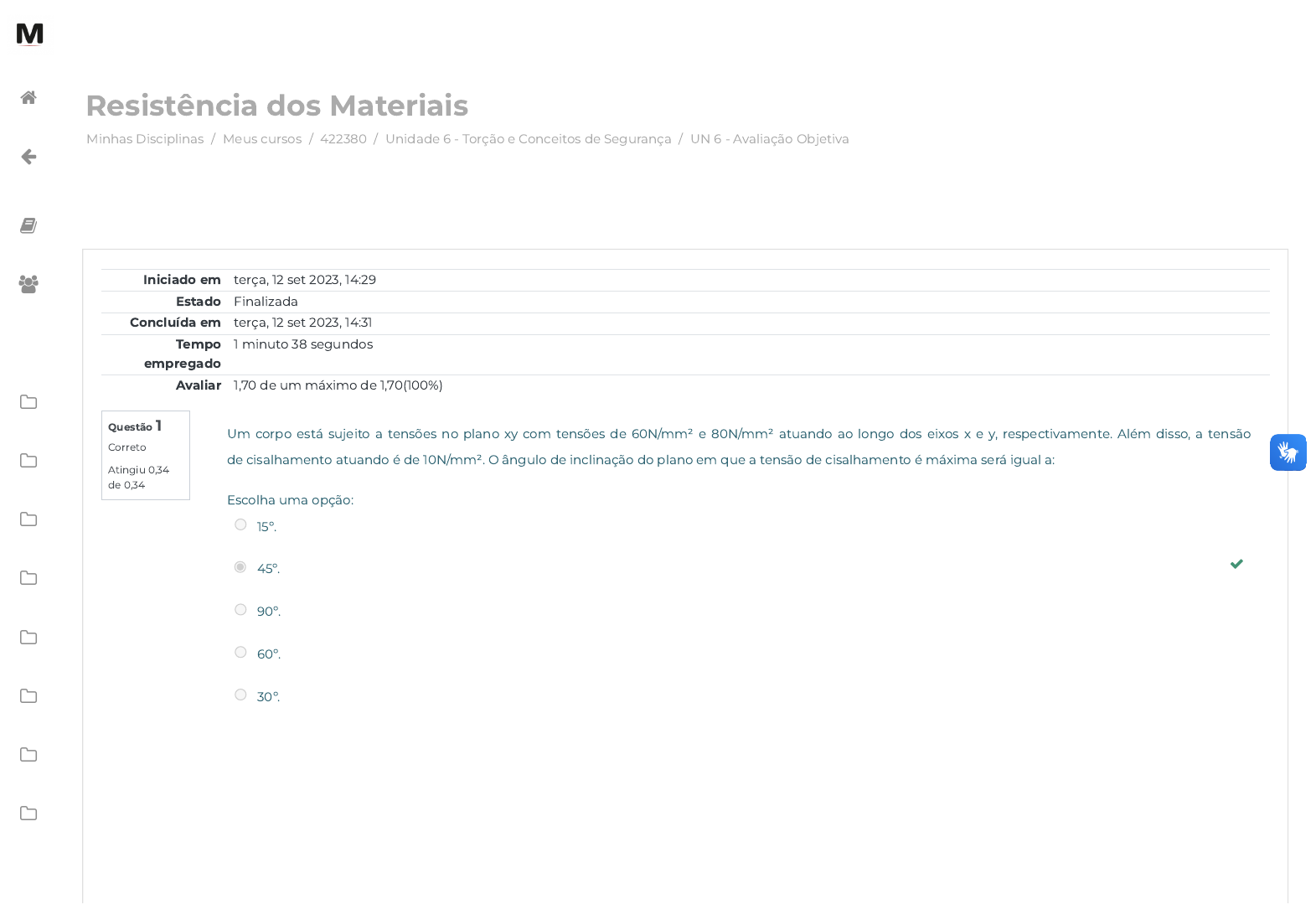 12/09/2023, 14:31 UN 6 - Avaliação Objetiva: Revisão da tentativa https://avap.multivix.edu.br/mod/quiz/review.php?attempt=3775876&cmid=1536183 1/3 Minhas Disciplinas / Meus cursos / 422380 / Unidade 6 - Torção e Conceitos de Segurança / UN 6 - Avaliação Objetiva Resistência dos Materiais Questão 1 Correto Atingiu 0,34 de 0,34 Iniciado em terça, 12 set 2023, 14:29 Estado Finalizada Concluída em terça, 12 set 2023, 14:31 Tempo empregado 1 minuto 38 segundos Avaliar 1,70 de um máximo de 1,70(100%) Um corpo está sujeito a tensões no plano xy com tensões de 60N/mm² e 80N/mm² atuando ao longo dos eixos x e y, respectivamente. Além disso, a tensão de cisalhamento atuando é de 10N/mm². O ângulo de inclinação do plano em que a tensão de cisalhamento é máxima será igual a: Escolha uma opção: 15º. 45º. 90º. 60º. 30º. https://avap.multivix.edu.br/my/ https://avap.multivix.edu.br/course/view.php?id=23694 https://avap.multivix.edu.br/course/view.php?id=23694§ion=7 https://avap.multivix.edu.br/mod/quiz/view.php?id=1536183 https://avap.multivix.edu.br/my/ https://avap.multivix.edu.br/course/view.php?id=23694 https://avap.multivix.edu.br/user/index.php?id=23694 https://avap.multivix.edu.br/course/view.php?id=23694§ion=1 https://avap.multivix.edu.br/course/view.php?id=23694§ion=2 https://avap.multivix.edu.br/course/view.php?id=23694§ion=3 https://avap.multivix.edu.br/course/view.php?id=23694§ion=4 https://avap.multivix.edu.br/course/view.php?id=23694§ion=5 https://avap.multivix.edu.br/course/view.php?id=23694§ion=6 https://avap.multivix.edu.br/course/view.php?id=23694§ion=7 https://avap.multivix.edu.br/course/view.php?id=23694§ion=8 https://avap.multivix.edu.br/course/view.php?id=23694§ion=9 https://avap.multivix.edu.br/ 12/09/2023, 14:31 UN 6 - Avaliação Objetiva: Revisão da tentativa https://avap.multivix.edu.br/mod/quiz/review.php?attempt=3775876&cmid=1536183 2/3 Questão 2 Correto Atingiu 0,34 de 0,34 Questão 3 Correto Atingiu 0,34 de 0,34 A ________é um mecanismo de falha que envolve a rachadura de materiais e componentes estruturais devido a tensões cíclicas (ou �utuantes). Embora as tensões aplicadas possam ser de tração, compressão ou torção, o início e a propagação de trincas são devidos ao componente de tração. Assinale a alternativa que mostre a palavra que deve ser colocada na lacuna do trecho acima: Escolha uma opção: Resiliência. Resistência. Viscosidade. Fadiga. Porosidade. Se a tensão de escoamento compressiva e a tensão de escoamento de tração são equivalentes, então a região de segurança da teoria da tensão principal máxima tem qual formato? Escolha uma opção: Hexagonal. Pentagonal. Quadrada. Esférica. Triangular. https://avap.multivix.edu.br/ 12/09/2023, 14:31 UN 6 - Avaliação Objetiva: Revisão da tentativa https://avap.multivix.edu.br/mod/quiz/review.php?attempt=3775876&cmid=1536183 3/3 Questão 4 Correto Atingiu 0,34 de 0,34 Questão 5 Correto Atingiu 0,34 de 0,34 Quando um pré-esforço é transferido para o concreto por meio de ancoragens externas, a pressão desenvolvida neste material é chamada de: Escolha uma opção: Tensão de Cisalhamento. Tensão de Rolamento. Tensão de Flexão. Tensão Térmica. Tensão Compreensiva. Julgue os itens a seguir e indique a alternativa correta: A tensão de �exão em um feixe reto varia linearmente com a distância do eixo neural, como em uma viga. ( ) Todos os tipos de tensões desaparecem assim que a carga aplicada for removida. ( ) Tensões residuais são sempre adicionadas às tensões de carga e, portanto, são sempre prejudiciais. Escolha uma opção: I – V; II – F; III – V. I – V; II – V; III – V. I – F; II – F; III – F. I – F; II – V; III – F. I – V; II – F; III – F. ◄ Conteúdo online Seguir para... Exercícios de Fixação ► https://avap.multivix.edu.br/mod/scorm/view.php?id=1536182&forceview=1 https://avap.multivix.edu.br/mod/quiz/view.php?id=1536184&forceview=1 https://avap.multivix.edu.br/