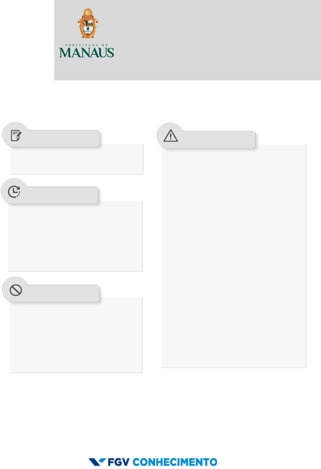 PREFEITURA DE MANAUS SECRETARIA MUNICIPAL DE ADMINISTRAÇÃO, PLANEJAMENTO E GESTÃO – SEMAD TARDE AS-TÉCNICO EM ENFERMAGEM NÍVEL MÉDIO TIPO 4 – AZUL Além deste caderno contendo sessenta questões objetivas, você receberá do fiscal de prova a folha de respostas. Verifique se seu caderno está completo, sem repetição de questões ou falhas. Caso contrário, notifique imediatamente o fiscal da sala, para que sejam tomadas as devidas providências. Confira seus dados pessoais, especialmente nome, número de inscrição e documento de identidade e leia atentamente as instruções para preencher a folha de respostas. Use somente caneta esferográfica, fabricada em material transparente, com tinta preta ou azul. Assine seu nome apenas no(s) espaço(s) reservado(s). Confira seu cargo, cor e tipo do caderno de questões. Caso tenha recebido caderno de cargo ou cor ou tipo diferente do impresso em sua folha de respostas, o fiscal deve ser obrigatoriamente informado para o devido registro na ata da sala. Reserve tempo suficiente para o preenchimento da sua folha de respostas. O preenchimento é de sua responsabilidade e não será permitida a troca da folha de respostas em caso de erro do candidato. Para fins de avaliação, serão levadas em consideração apenas as marcações realizadas na folha de respostas. A FGV coletará as impressões digitais dos candidatos na lista de presença da sala. Os candidatos, quando do ingresso e da saída de sanitários durante a realização das provas, serão submetidos ao sistema de detecção de metais. Boa sorte! Você dispõe de 4 horas para a realização da prova, já incluído o tempo para a marcação da folha de respostas. 2 horas após o início da prova é possível retirar- se da sala, sem levar o caderno de prova. A partir dos 60 minutos anteriores ao término da prova é possível retirar-se da sala levando o caderno de questões. Qualquer tipo de comunicação entre os candidatos durante a aplicação da prova. Anotar informações relativas às respostas em qualquer outro meio que não seja o caderno de prova. Levantar da cadeira sem autorização do fiscal de sala. Usar o sanitário ao término da prova, após deixar a sala. SUA PROVA TEMPO NÃO SERÁ PERMITIDO INFORMAÇÕES GERAIS SEMSA - SECRETARIA MUNICIPAL DE SAÚDE DE MANAUS (ESPECIALISTA EM SAÚDE) FGV AS-TÉCNICO EM ENFERMAGEM Tipo Azul – Página 3 Língua Portuguesa 1 Assinale a opção em que o pronome você aparece identificado. (A) Quando você rouba de um autor é plágio, se rouba de vários é pesquisa. (B) Se você tem alguma crença, siga-a. (C) Se você não for melhor que hoje no dia de amanhã, então para que você precisa do amanhã? (D) Não basta você chegar ao cume. É preciso também voltar vivo. (E) Você, que não paga impostos, como vai cobrar do governo? 2 Observe o seguinte raciocínio: A empresa, pela primeira vez, atrasou o pagamento dos funcionários; os funcionários dessa empresa devem decretar greve. Nesse caso, recusamos a conclusão tirada da premissa, porque (A) a premissa não é verdadeira. (B) a conclusão não decorre logicamente da premissa. (C) a premissa não é suficiente para a conclusão. (D) premissa e conclusão não mostram o mesmo tema. (E) a premissa não tem caráter universal. 3 Assinale a opção que exemplifica o tipo de texto informativo. (A) Um país se faz com homens e livros. (B) Ontem, as bolsas sofreram quedas imensas, em virtude da guerra entre a Rússia e a Ucrânia. (C) Nada é tão inútil como uma máxima de ordem geral. (D) Pensar é dizer não. (E) A natureza e os livros pertencem aos olhos de quem os veem. 4 Nas frases abaixo, as locuções em destaque foram substituídas por um único vocábulo de valor equivalente. Assinale a opção em que essa substituição foi feita de forma adequada. (A) As montanhas com neve são atraentes / nubladas. (B) Os trajes de verão são leves e coloridos / varonis. (C) O ministro usa roupa fora da moda / velha. (D) O estudante era um rapaz de bons modos / polido. (E) O quarto estava de pernas para o ar / empoeirado. 5 Em todas as opções abaixo há exemplos de metáforas. Assinale a opção em que a metáfora se encontra explicitada. (A) O moço que não chorou é um selvagem, e o velho que não quer rir é um tolo. (B) O suicídio é um roubo ao gênero humano. (C) Nossa morte é nossa boda com a eternidade. (D) O povo é como uma cera mole, tudo depende da mão que o modele. (E) A verdadeira pátria do homem é a infância. 6 Abaixo há locuções adjetivas introduzidas, respectivamente, pelas preposições com e sem. Assinale a opção em que a substituição dessas locuções por adjetivos é feita de forma incorreta. (A) carne com sal / sem sal = salgada e insossa. (B) campo com água / sem água = úmido e seco. (C) líquido com açúcar / sem açúcar = doce e salgado. (D) fruta com sabor / sem sabor = saborosa e insípida. (E) flores com perfume / sem perfume = perfumadas e inodoras. 7 Todas as frases abaixo são argumentativas. Assinale a opção em que a premissa do argumento é do tipo de testemunho de autoridade. (A) Um estudo demonstrou que as mulheres são mais resistentes à dor que os homens, por isso os marmanjos devem imitá-las. (B) É muito melhor gastar euros na França que na Espanha, por isso acho aconselhável viajarmos para Paris. (C) Muitas pessoas são assaltadas nos grandes centros, por isso acho que o policiamento deve concentrar-se aí. (D) Os ladrões têm por alvo principal os celulares, daí ser prudente não mostrá-los em público. (E) A língua portuguesa tem uma ortografia complicada, daí ser urgente uma reforma ortográfica. 8 Todas as frases abaixo mostram uma forma sublinhada, composta de não + verbo. Assinale a opção em que a substituição dessa forma por um só verbo, de sentido equivalente, está correta. (A) Não apreciamos o som de vocês, Beatles. Além disso, conjuntos de guitarristas não têm futuro. / Odiamos. (B) Nã