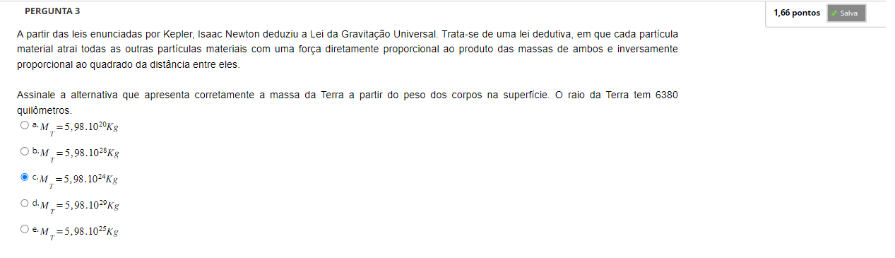 A partir das leis enunciadas por Kepler, Newton deduziu a Lei da Gravitação Universal. Trata-se de uma lei em que cada partícula material atrai todas as outras materiais com uma força diretamente proporcional ao produto das massas de ambos e inversamente proporcional ao quadrado da distância entre. Assinale a alternativa que apresenta corretamente a massa da Terra a partir do peso dos corpos na raio da Terra tem 6380.