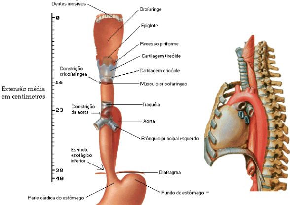 Anatomia – 3º semestre Medicina Unimes Priscilla Brogni XXII A Anatomia do esôfago Músculo constrictor inferior da faringe ou músculo cricofaríngeo (esfíncter esofágico superior) marca o começo do esôfago. Considerado o último músculo voluntário que participa da deglutição. O esôfago é um tubo muscular com revestimento mucosa. A mucosa não é própria para ficar em contato com ácidos. Estende-se desde a faringe até o estômago. Ele passa por regiões do corpo, tendo três partes: parte cervical (C6), parte torácica e parte abdominal. Cruza o diafragma, o esfíncter esofágico inferior, o mediastino superior e passa posterior ao coração. A parte torácica é a maior parte e acaba na região diafragmática. Parte cervical: • Faringe • Traqueia - acesso do esôfago sempre pelo lado esquerdo pois a traqueia está deslocada levemente para a direita Parte torácica: • Traqueia – a traqueia só existe no mediastino superior, depois ela se bifurca • Aorta – o arco da aorta deixa uma impressão no esôfago; o esôfago passa pela direita da aorta, pelo mediastino posterior. • Coração - o esôfago passa posteriormente ao coração. • Pleura – o esôfago passa entre as pleuras • Brônquios – o brônquio que entra em contato com o esôfago é o brônquio principal esquerdo • Diafragma – o esôfago cruza o diafragma no esfíncter esofágico inferior. Hiato esofágico é o lugar no qual o esôfago cruza o diafragma. Luz esofágica: estreitamentos. Primeira constrição: nos 16 cm, é o esfíncter esofágico superior. Segunda constrição: entre 23 e 24 cm, aorta. Terceira constrição: 27 a 28 cm, brônquio principal esquerdo. Quarta constrição: 40 cm, esfíncter esofágico inferior. Esses comprimentos são medidos desde os dentes incisivos superiores. A luz do esôfago aumenta durante a passagem a passagem do bolo alimentar, o qual é impulsionado por contrações da musculatura de sua parede. Esses movimentos, que são próprios de todo o restante do canal alimentar, são denominados peristálticos e à capacidade de realiza-los chamamos de peristaltismo. Anatomia – 3º semestre Medicina Unimes Priscilla Brogni XXII A Diferenças na musculatura: • Anatômica o Fibras longitudinais – são as mais superficiais o Fibras circulares – são mais internas o Ambas as fibras estão em todo o esôfago • Histológicas o Músculo voluntário: terço superior o Músculo involuntário: terço inferior o Ambos: terço médio Parte abdominal • Junção gastroesofágica: linha Z, encontro das duas mucosas. • Hérnia de hiato: hérnia é uma parte do órgão que está invadindo um espaço que não deveria; hérnia de hiato é uma parte do estômago atravessando o hiato e vai para a região torácica. Inervação do esôfago • Nervos laríngeos recorrentes (sulco traqueoesofágico) – é o vago que passou pela laringe que continuou para o abdômen. Esse nervo é parassimpático. • Plexo esofágico – quando fibras simpáticas se misturas com os nervos Vascularização • O esôfago tem 3 irrigações, cada uma vindo de uma parte. • A primeira parte recebe irrigação das artérias tireóideas inferiores • A segunda parte recebe irrigação dos ramos esofágicos da aorta • A terceira parte recebe irrigação da artéria gástrica esquerda Drenagem • Linfonodos frênicos • Linfonodos mediastinais posteriores • Linfonodos traqueais Anatomia – 3º semestre Medicina Unimes Priscilla Brogni XXII A Anatomia do estômago O estômago é uma dilatação do canal alimentar. A maior parte da digestão é o estômago que faz, só de lipídeo e proteína. O estômago também tem papel de absorção. Localizado no quadrante superior esquerdo. Ele forma, junto com o omento menor, a bolsa omental. Essa bolsa localiza-se posteriormente ao estômago. O estômago tem uma curvatura gástrica maior e uma curvatura gástrica menor. A curvatura menor está ligada ao fígado pelo omento menor. A curvatura maior está ligada ao omento maior até o colo transverso. Leito do estômago: o estômago está anteriormente ao pâncreas, uma parte do duodeno, uma parte do rim e uma parte do colo transverso. O baço está à esquerda do estômago. Curvaturas: • Incisura cárdica: incisura superior, pois está perto da parte cárdica do estômago • Incisura angular: curvatura menor, está perto da parte pilórica do estômago. A parte pilórica do estômago é a parte final. Partes do estômago: • Parte cárdica: parte inicial e corresponde à junção com o esôfago • Fundo gástrico: parte mais alta do estômago • Corpo gástrico: parte maior • Parte pilórica: parte final continuada no duodeno o Antro pilórico o Canal pilórico • Piloro (esfíncter): transição entre o estômago e o duodeno O estômago apresenta dois orifícios: um, proximal, de comunicação com o esôfago, o óstio cárdico, e outro distal, o óstio pilórico, que se comunica com a porção inicial do intestino delgado denominado duodeno. A condensação de feixes musculares longitudinais e circulares constituem o mecanismo de abertura e fechamento do óstio pilórico para regular o trânsito do bolo alimentar na sua passagem do estômago para o duodeno. Esse dispositivo chama-se piloro. Anatomia – 3º semestre Medicina Unimes Priscilla Brogni XXII A Camadas musculares • Longitudinal: camada mais externa • Circular: camada média • Oblíqua: camada interna Irrigação do estômago Tronco celíaco ramifica-se em: • Artéria gástrica esquerda • Artéria esplênica o Artéria gastromental esquerda o Artérias gástricas curtas (irriga o fundo do estômago e a parte cárdica) • Artéria hepática comum o Artéria hepática própria § Artéria gástrica direita (faz anastomose com a artéria gástrica esquerda e irriga a curvatura menor) o Artéria gastroduodenal § Artéria gastromental direita (faz anastomose com a artéria gastromental esquerda e irriga a curvatura m