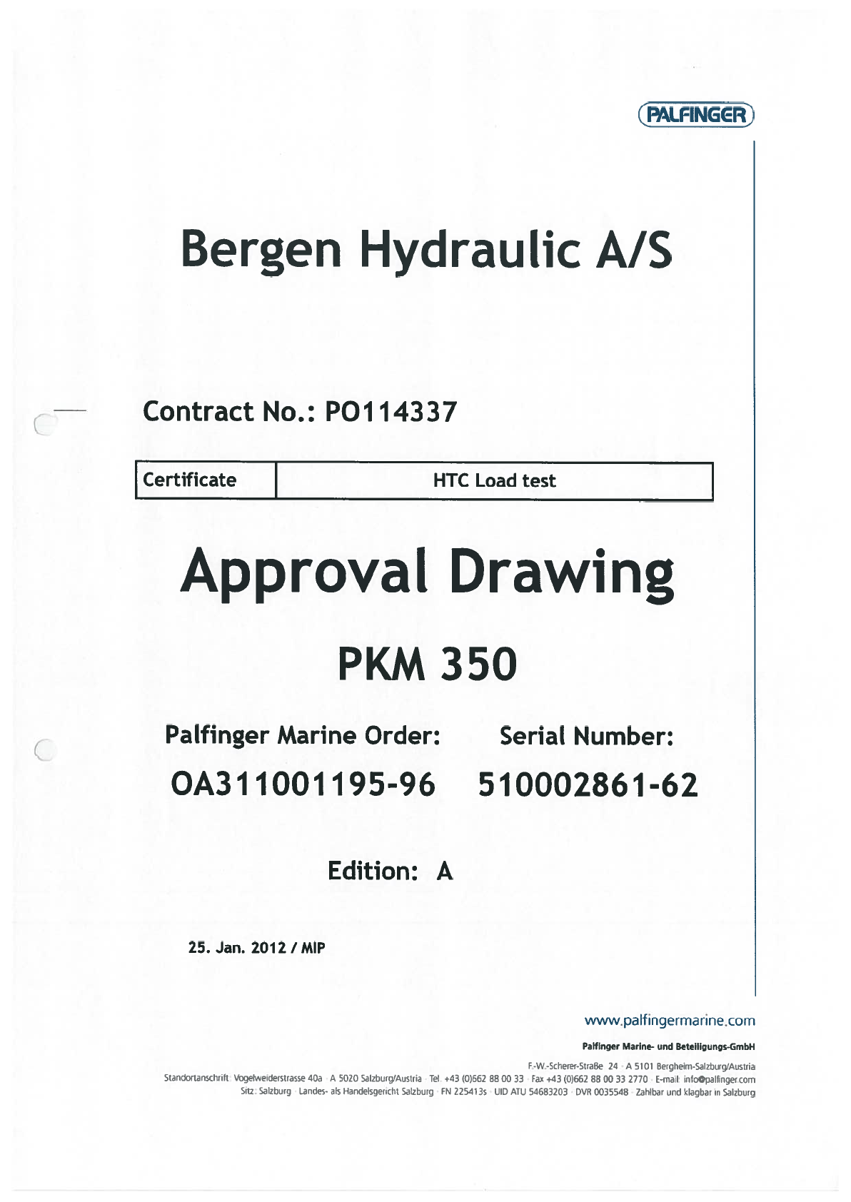 CPALFINGER) Bergen Hydrautic AIS Contract No.: P0114337 Certificate HTC Load test Approvat Drawing PKM 350 Patfinger Marine Order: Serial Number: 0A31 1001 195-96 510002861-62 Edition: A 25.Jan. 2012/MIP www.palfingermarine.com Palfinger Marine- und Beteiligungs-GmbH -w -Scheter-StraBe 24 A 5101 Bergheim-SaIzburgIAusria Standortanschritt Vogelweiderstrasse 40a A 5020 Salzburg/Austria Tel .43 tO)662 88 00 33 Faa +43 (01662 88 00 33 2770 E-rna:i nlo@paIiinger ccm 56z. Salzburg Landes- ais HandeIs€richt Salzburg FN 22541 3s UID ATU 54683203 DVR 0035548 Zahlba’ und klagbar in Salzburg 5 B er ge n H yd ra ul ic A IS PK M 35 O II B m K A O O 1 19 5/ K A O O 1 19 6 W E IG H T (A P P R O X .) 58 00 kg U nl es s w e re ci ev e an y co m m en ts to su bm it ed d ra w n g w ith in 14 da ys (8 2 2 0 1 2 ) w e tr ea t th e sa rn e on e’ s as co nf ir rn ed ! - - Z ei ch nn g nu r in G u - 1 3 0 V er bi nd un g rT it - W er kn or m G p r - - — PN O R M 0 1 .0 8 0 1 gu lh g - _ _ _ _ _ _ _ _ _ _ _ _ _ _ _ _ _ _ _ _ _ _ _ — C L J G ) K * u k ., 31 1 K A O O 1 19 5- 1 (jÃ1FINGE) Technische Dat DTCPO95IO3 e n Kapltel Chapter P KM 350 Specifications 1100 Solte Page 0112011 Ausgabe Edition Max. Hubmoment: Lifting moment: PKM 350— 12m PKM 350— 14m PKM 350— 16m Max. Reichweite: Max. outreach: PKM 350— 12m PKM 350— 14m PKM 350—16m 15 14 13 12 11 10 9 8 7 6 5 4 ::z::: ---v -—- --— ---- -- \ ——--— \ 20 40 60 80 100 430 kNm 398 kNm 370 kNm 12m 14m 1 6m Schwenkbereich: endios S!ewing angle: endless Schwenkmoment: Slewing torque: 140 kNm Max. Betriebsdruck: 25.0 MPa (250 bar) Operating pressure: Empfohlene Fcirdermenge der Pumpe: 65....100 IImin Recommended pump capacity: [o] Neigung lnclination Last halten HoId Ioad Last schwenken SIew Ioad Lastmoment Lifting moment Konot,oktiono5ndoron0oo oooboh.II.n, lotdgont.ohn. Toterao.n nã.s.n b.,ook5iohtl5t worden. Subjoot lo ohOngO. podttobon tobooooos 000o lobo lobo, loto 0000001 CPALFINGER) Befestig u ngsschraub DTCP095103 en PKM 350 Mounting bolts 1300 Selte Page 0112011 Ausgabe Edition Mb. A B 12 01 25 Mb. max. Kranmoment — statisch Mb. max. crane moment— static _______ 643,9 kNm Fv. max. Kraft vertikal — statisch Fv. max. force vertically — static_________ 94,2 kN. Mt. max. Torsionsmoment — statisch Mt. max. torsional torque — static _______ 90,5 kNm Mb. max. Kranmoment mit Beiwerten — dynamisch Mb. max. crane moment — dynamic _______________ Fv. max. Kraft mit Beiwerten — dynamisch Fv. max. force — dynamic ________________ 728,2 kNm 101,9 kN Mt. max. Torsionsmoment mit Beiwerten — dynamisch Mt. max. torsional torque — dynamic _____________________ 98,2 kNm BEFESTIGUNG: 48 Schrauben M 20 korrosionsgeschützt. Werkstoff 10.9; Zugfestigkeit 1000 Nlmm2; Streckgrenze 900 Nlmm2 Anziehmoment = 505 Nm (nicht gefeftet); Schraubenoberflàche DACROMET SOOA SCHWEISSNAHTANSCHLUSS: Rohrsockel — Stahlrohr 1095x12 S355 J2 EN 10025; SchweiBverfahren MAG, Zusatzwerkstoff SG 3 DIN 8559 SchweiBverfahren E, Zusatzwerkstoff EV 50 DIN 1913 MOUNTING: 48 bolts M 20 protectet against corrosion. Material 10.9; tensile strength 1000 N/mm2; yield point 900 N/mm2 Tightening moment = 505 Nm (not oiied); surface of screw DACROMET 500A WELDING: Mounting base — pipe 1095x12 S355 J2 EN 10025; welding procedure MAG, fliler metal SG 3 DIN 8559 welding procedure E, filIer metal EV 50 DIN 7973 Detail “A” Detail ‘A” v-t- KRÂFTE — MOMENTE — GEWICHTE FORCES - MOMENTS - WEIGHT$ E5 685 812M Konstruktjon,Cnd,rungenvorbeftalten, ferUgung,tachn. Toleranzen nüesen berOCksIchtlgt werden. SubjeeL to change, pruductlon talerances have lobo Wkefl mio account CPALFINGER) Traglastdiagramm DTCP095104 Kapltel Chapter PKM 350 Lifting capacity diagram 1102Selte Page 0112011 Ausgabe Editian 16m 14m 12m lOm 8m 6m 4m 2m Om -2m PKM 350— 16m 22m 20m -4m -6m Om 2m 4m 6m 8m lOm 12m 14m 16m 20m e rEr r1e e o M a ai ai ai —1 •—1 ai M 7’Ç -7 o -3 -3 -7 o o o 03 ai M II II - (C -o -o :z CAi ul o-) c 01 (O O o O o o M o o w o o 01 9’ 01 9’ ai M ;rjM -: e 2 EA2168 5 EV093 4 EA7 16 3 6 CPUSO527A-EV EV654 Hochdruckfilter high pressure filter filtre haute pression Steuerschieber control valve distributeur de commande Prufanschluss test connection raccordament dessei Wechselventil shuttle valve selecteur de circuit EV1 826 Doppeltes Lasthalteventil twin load holding valve double clapets anti retour pilotes 1 1 1 1 1 IHYDRAULIK_-_GERAETELISTE Schema oa311001195,96-6 By :NEK Date : 1 6-JAN-1 2. Pos. E-Nummer Bezeichnung Stk. 1 CPEPOO39 Õlpumpe oil pump rompe a huil 13 EV2315 Überlastblock overload block 11 7 CPEPOI47 8 PMEP0004-- ---00001 Getribe-Swenckmotor gear box-slewing hydraulic motor boite a vitesse-hydraulic moteur Lasthalteventil Ioad holding valve clapets anti retour pilotes 9 10 CPUPO2O1 CPUPO21 5 12 UV1 97AM Hubzylinder main boom cvlinder verin de bras principal Knickzylinder outer boom ram verin deuxieme bras Seilwinde cable winch treuli a cable Folgesteuerungsventil sequence valve soupape a suivre 2 3 1 1 1 1 14 15 16 EV1 74 H LA793M EV3388 Druckspitzentaster 1 pressure peak bottun touche pour pointes Drosselventil 1 throftle vaive soupape detranqlement Sammelblock 1 storage block accumulateur bloc de sucharge 17 18 HLA462 EA1476 Sammelblock 1 storage block accumulateur Not-Aus Ventil 1 emergency stop valve vanne darret Vorgespanntes Rückschlagventil 2 pre stressed check valve soupape de retenue 20 EVI 51 21 EA1 604 Schlauchbruchventil 1 hose break valve clapet parachute Manometer 1 Manometer manometre 22 23 24 UV388M EV1882 EV 113 Vorgespanntesventil 2 pretension valve soupape pre tension Drückmindeventil 1 pressure relief valve soupape de detante Drosselventil throttle valve soupape d’etraglement 1 25 CPEPO162 iOelkueler ou cooler 1 radiator d’huile 2/2 Weqeventil 1 2/2 directional valve 2/2distributeur de command Thermodruckventil 1 thermostat thermostat 19 EVI 522 26 CPEVO146 27 EV4 174 31 EA119O 30 HLA792M Drosselventil thrott