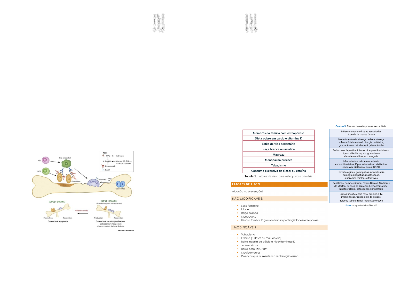 Osteoporose Metabolismo do Osso: Esse processo tem base na ação conjunta de células ósseas de reabsorção (osteoclastos) e de formação (osteoblastos). A perda óssea na osteoporose resulta de um desequilíbrio deste processo. Citocinas/vias de sinalização importantes: • RANK / RANK-L / OPG • BMP/Wnt • DKK1 / esclerostina Os osteoblastos produzem RANKL e M-CSF, que se ligam em receptores específicos em células progenitoras dos osteoclastos e produzem osteoclastos. A osteoprotegerina, também conhecida como uma proteína de proteção óssea, é secretada por células osteoblásticas e age como um receptor competitivo que ao ligar-se so RANKL, impede a ligação deste ao RANK, inibindo a osteoclastogênese e favorecendo a formação óssea. Introdução: Osteoporose é um distúrbio ósseo sistêmico que se caracteriza por redução da massa óssea, desorganização da microarquitetura do osso e da diminuição da resistência óssea, com aumento do risco de fratura. A osteoporose pode ser classificada como primária (pós menopausa e senil), quando associada ao envelhecimento natural de homens e mulheres, ou secundária, quando associada a doenças sistêmicas ou condições que aceleram a perda de massa óssea. O uso de glicocorticoide é a principal causa de osteoporose secundária. • Tipo I (pós-menopausa): mulheres na pós menopausa, perda óssea acelerada, acomete osso trabecular, fraturas mais comuns são vertebrais e de punho (Colles). • Tipo II (senil): homens e mulheres após 70 anos, perda óssea lenta e progressiva, acomete osso trabecular e cortical, fraturas mais comuns são vertebrais e de quadril. Fisiopatologia: A osteoporose é decorrente de um processo multifatorial em que há um desbalanço entre a produção e reabsorção óssea. São fatores associados à diminuição de formação óssea: idade e deficiência de hormônio do crescimento. Já as deficiências de estrogênio, cálcio, vitamina D, hipertireoidismo, hiperparatireoidismo e doenças inflamatórias causam osteoporose, principalmente, pelo aumento da reabsorção óssea. O pico da massa óssea ocorre em homens e mulheres em torno dos 30 anos. Os homens têm maior massa óssea que mulheres. A perda óssea osteoporótica afeta osso cortical e trabecular (cancellous). A espessura cortical e o tamanho das trabéculas diminuem, resultando em porosidade aumentada. A trabécula pode estar interrompida ou inteiramente ausente. A perda óssea trabecular ocorre mais rapidamente do que o osso cortical porque o osso trabecular é mais poroso e a recuperação óssea é mais alta. Contudo, a perda dos dois tipos contribui para a fragilidade do esqueleto. O principal mecanismo da osteoporose primária é o aumento da reabsorção óssea, que resulta em diminuição da massa óssea e deterioração microarquitetural, mas às vezes a formação óssea é prejudicada. Os mecanismos de perda óssea podem envolver: • Alterações locais na produção de citocinas, particularmente envolvendo citocinas como o ligante do receptor ativador do fator nuclear kapa B (RANKL), que aumenta a reabsorção óssea ao promover a diferenciação e a maturação dos osteoclastos • Resposta de formação óssea prejudicada durante a remodelação óssea, provavelmente causada pelo declínio relacionado à idade no número e atividade dos osteoblastos, parcialmente decorrente do aumento mediado pelas citocinas na proteína esclerostina • Outros fatores que afetam a reabsorção óssea como hormônio da paratireoide (PTH) e vitamina D. Quadro Clínico: Trata-se de uma doença silenciosa, em que os sintomas e os sinais clínicos são decorrentes já do desfecho da doença, que são fraturas de fragilidade (colo do fêmur, úmero proximal, rádio distal e vertebral). A fratura vertebral é a manifestação clinica mais comum da osteoporose e, na maioria das vezes, é assintomática, com suspeita na presença de perda progressiva de altura ou cifose importante. Já as fraturas de colo do fêmur e de rádio distal são sintomáticas e decorrentes de queda. Classificação da Fratura Vertebral: A fratura vertebral pode ser diagnosticada através da radiografia simples de coluna. É classificada de acordo com o local de fratura do corpo vertebral em anterior, posterior ou bicôncava (em “peixe”), e com grau de redução em grau I (20% a 25%), grau II (25% a 40%), grau III (>40%). Rastreio e Diagnóstico: O diagnóstico de osteoporose pode ser densitométrico, a partir do uso da densitometria óssea, e/ou na existência de fratura de fragilidade (diagnóstico clínico). O diagnóstico clinico da osteoporose é feito em indivíduos que tem fraturas tipicamente osteoporóticas de baixo impacto em rádio distal, úmero proximal, colo do fêmur e vertebral. O rastreamento de osteoporose on densitometria óssea deve ser solicitado, de modo geral, em mulheres acima de 65 anos e homens acima de 70 anos. Repetida de 1 a 2 anos. Existem outras indicações para o exame. Pela OMS a definição de osteoporose densitométrica é T-score < ou = - 2,5 DP. Outros valores de T-score: • Normal: > -1 • Osteopenia: > -2,5 É utilizado para mulheres na pós menopausa ou homens acima de 50 anos e compara os desvios padrão com uma população jovem saudável. Já o Z-score é utilizado em mulheres não menopausadas e homens abaixo os 50 anos, compara em desvios padrão com uma população da mesma idade e sexo. Nesta população se estabelece o diagnóstico de “baixa massa óssea para idade” quando Z-score < -2,0 DP. Os sítios avaliados na densitometria óssea são coluna total e fêmur. Exames Complementares: RX Simples: Os ossos mostram radiodensidade diminuída e perda da estrutura trabecular, porém não até que cerca de 30% do osso tenha sido perdido. Entretanto, as radiografias simples são importantes para documentar as fraturas decorrentes da perda óssea. Perda da altura corporal vertebral e maior biconcavidade caracteriz