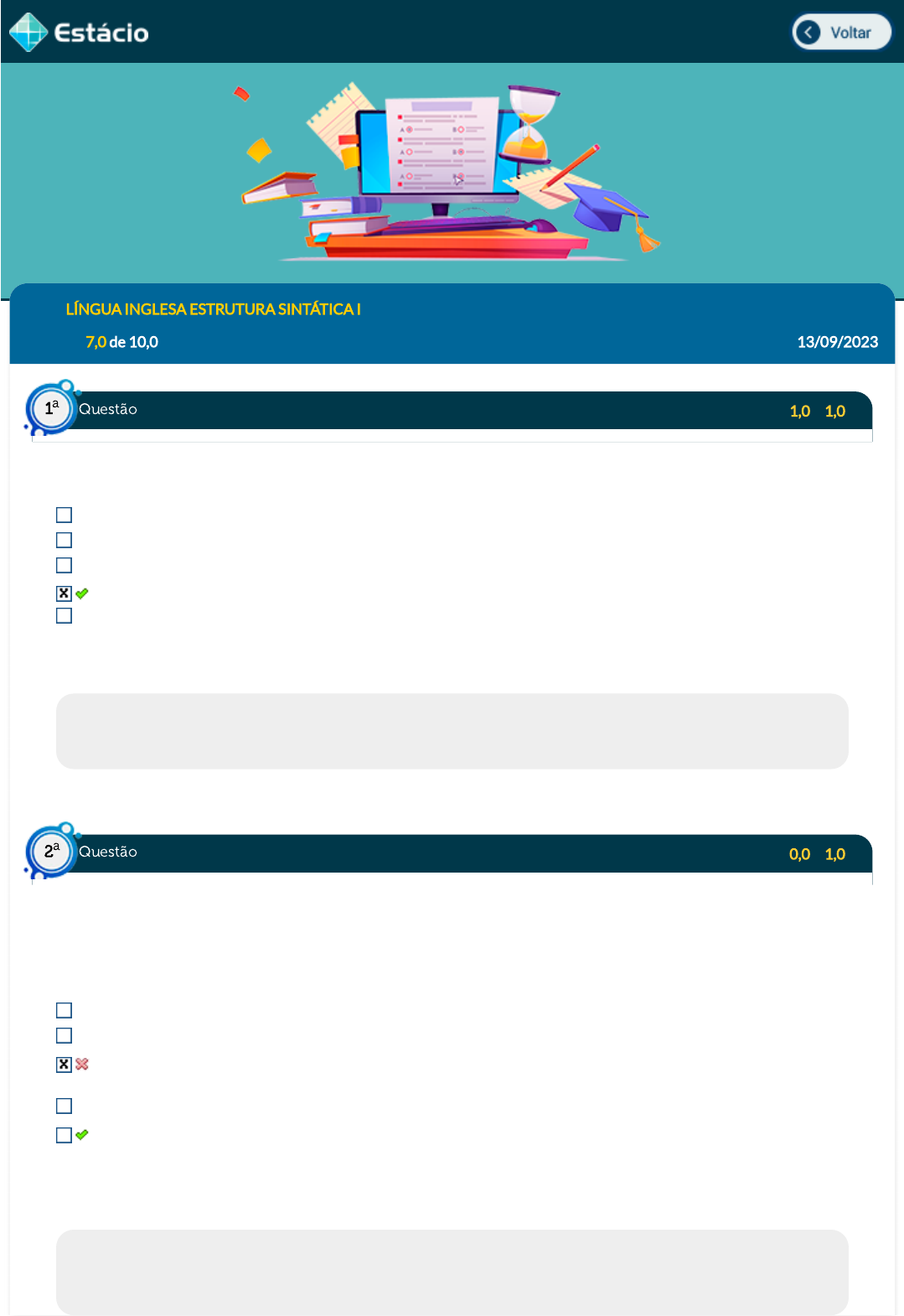 Disc.: LÍNGUA INGLESA ESTRUTURA SINTÁTICA I Acertos: 7,0 de 10,0 13/09/2023 Acerto: 1,0 / 1,0 Choose the option which contains the verb forms that better complete the gaps in the following sentence: When they arrived at the meeting, the reports (1) ___________ already (2) ___________ (3) ___________ by the CEO. (1) has/ (2) been/ (3) discussing (1) were/ (2) been/ (3) discussed (1) have/ (2) been/ (3) discussed (1) had/ (2) been/ (3) discussed (1) have/ (2) been/ (3) discussing Respondido em 13/09/2023 18:06:01 Explicação: A resposta certa é: (1) had/ (2) been/ (3) discussed Acerto: 0,0 / 1,0 Choose the option that better explains the difference between sentences (1) and (2) below: (1) The senator has been accused of corruption. (2) The opposition has accused the senator of corruption. In sentence (2), the agent is universal or too broad. Only sentence (2) omits the agent of the action. Sentence (1) focuses on the undergoer of the action (the opposition), while sentence (2) highlights the agent (the senator). Sentence (1) is in the active voice, while sentence (2) is in the passive. Sentence (1) focuses on the undergoer of the action (the senator), while sentence (2) highlights the agent (the opposition). Respondido em 13/09/2023 18:08:36 Explicação: A resposta certa é: Sentence (1) focuses on the undergoer of the action (the senator), while sentence (2) highlights the agent (the opposition). Questão1 a Questão2 a https://simulado.estacio.br/alunos/inicio.asp javascript:voltar(); Acerto: 1,0 / 1,0 Choose the option which better explains the meaning of the following sentence: Hopefully, by the end of the decade this virus will have been eliminated by vaccines and scienti�c research. It refers to one single moment in the future. It refers to a potential event in the future that will occur at the same time of another one in the future. It conveys a possibility in the present. It means that vaccines will and research will be developed when the virus is eliminated. It refers to a potential event in the future that might become a reality before another point in the future. Respondido em 13/09/2023 18:10:14 Explicação: A resposta certa é: It refers to a potential event in the future that might become a reality before another point in the future. Acerto: 1,0 / 1,0 What is the difference between coordinators and subordinators? They are both prepositional phrases. Coordinators link words of the same kind and subordinators introduce a new clause. They are both prepositional phrases. Subordinators link words of the same kind and coordinators introduce a new clause. There is no difference. They are both grammatical words. They are both conjunctions. Subordinators link words of the same kind and coordinators introduce a new clause. They are both conjunctions. Coordinators link words of the same kind and subordinators introduce a new clause. Respondido em 13/09/2023 18:12:42 Explicação: A resposta correta é: They are both conjunctions. Coordinators link words of the same kind and subordinators introduce a new clause. Acerto: 1,0 / 1,0 Choose the sentence in which a coordinator is being used: After I got home I took a shower. Not only was she a great dancer, but also a great singer If I had known, I would have called you Tell me if you can come It didn¿t go to the party because it rained. Respondido em 13/09/2023 18:13:48 Questão3 a Questão4 a Questão5 a Explicação: A resposta correta é: Not only was she a great dancer, but also a great singer Acerto: 0,0 / 1,0 Synecdoche, as metonymy, is a �gure of speech that explores substitutions. This substitution is based on the relationship between the entities. Which is the only alternative that contains a synecdoche? He's such an angel. Nice ride! I'll have a Coke, please. He is as stubborn as a mule. Better said than done. Respondido em 13/09/2023 18:15:14 Explicação: A resposta correta é: Nice ride! Acerto: 1,0 / 1,0 The prepositional phrases can perform four syntactic functions in the sentence. Based on it, what is the syntactic function of the prepositional phrase in the following sentence? "The boy on the train was staring at you" Prepositional Adverbial Verb complement Adjective complement Postmodi�er of a noun phrase Adverbial Adjunct Respondido em 13/09/2023 18:17:14 Explicação: A resposta correta é: Postmodi�er of a noun phrase Acerto: 0,0 / 1,0 The preposition with can convey the meanings of instrument, accompaniment, manner, and ingredient. Choose the option in which it indicates the meaning of manner: I want to lunch with a spoon, not with a fork and a knife. He looked at us with anger and envy. Questão6 a Questão7 a Questão8 a I want paint this with a crayon, not with a pencil. Are you going to the party with your new friend? I have baked this cake with orange juice, instead of milk. Respondido em 13/09/2023 18:20:01 Explicação: A resposta correta é: He looked at us with anger and envy. Acerto: 1,0 / 1,0 What is the syntactic function (type) of the underlined verb in "Clarice Lispector is a Brazilian novelist"? Linking verb. Verb predicator. Predicate. Ditransitive verb. Passive voice. Respondido em 13/09/2023 18:21:00 Explicação: A resposta correta é: Linking verb. Acerto: 1,0 / 1,0 What is the syntactic function (type) of the verb in "the man carried my suitcases"? Complex transitive verb. Ditransitive verb. Transitive verb. Linking verb. Intransitive verb. Respondido em 13/09/2023 18:22:15 Explicação: A resposta correta é: Transitive verb. Questão9 a Questão10 a