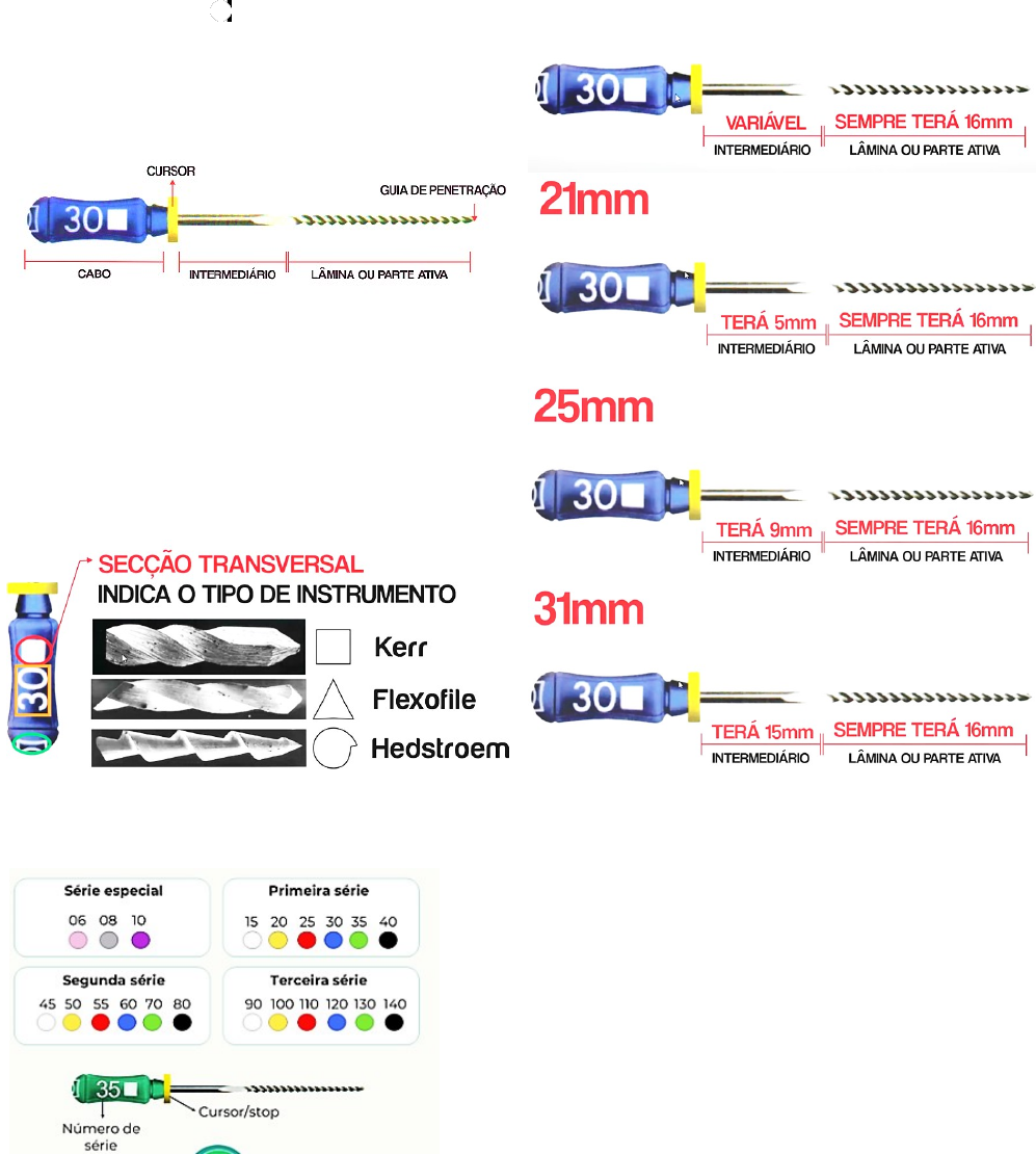 INSTRUMENTOS ENDODONTICOS · LIMAS ENDODONTICAS: As limas são instrumentos destinados para o alisamento e retificação de curvatura e irregularidades dos canais radiculares, contribuindo também para seu alargamento. A limagem é definida como o movimento de introdução no canal radicular, pressão na parede do canal e sua remoção. A limagem amplia o canal radicular de forma menos regular quanto comparada0 aos movimentos giratórios (EM-DO-DON-TIA). · Partes da lima 1. Guia de penetração: Além de servir de guia, auxiliar a penetração do instrumento. 2. Cabo: O cabo da lima nos da várias informações sobre ela, como: · Secção transversal: Indica o tipo de instrumento. · Número de serie e cores de cabo: As cores do cabo sempre seguem um padrão. · 1° serie: os números variam de 5 em 5 · 2° serie: variam de 5 em 5 até o 60, depois disso varia de 10 em 10. · 3° serie: varia de 10 em 10. 3. Tamanho das limas: A parte ativa da lima sempre terá 16mm, porém a porção intermediaria é variável. Existem 3 comprimentos de lima, são eles: 21mm,25mm e 31mm. A escolha dos tamanhos varia de acordo com o comprimento radicular de cada dente. 4. Diâmetro das limas: A parte ativa das limas é dotada de conicidade ou taper, ou seja, o aumento de diâmetro da parte ativa de mm em mm. Temos o D0 e D16. O D0 varia de lima para lima, porém de D1 ao D16 sempre vai aumentando de 0,02mm em 0,02mm a cada diâmetro. Formando um cone · D0: A numeração da lima corresponde ao diâmetro. · FÓRMULA PARA ACHAR O DIAMETRO DA LIMA: Dx= D0 + (0,02 x o Dx) TIPOS DE LIMA · Lima tipo K ou Kerr: São fabricadas a partir de aço inoxidável. Possui secção transversal quadrangular de haste. Independente do fabricante os instrumentos tipo K apresentam geometria semelhantes. Possui ângulo de corte de 9° e tem uma maior resistência. · Lima Flexofile: São mais flexíveis que as limas tipo K, sendo mais indicada para canais curvilíneos. Possuem haste de secção transversal triangular, em aço especial que garante essa flexibilidade. Apresentam poder de corte maior que as limas tipo K. Possui ângulo de corte de 60°, tem uma maior flexibilidade, porém possui menor resistência. · Lima Hedstroen: Possui haste de secção transversal circular torneadas em forma de virgula, tem ângulo de corte de 42°. É indicada para canais retos e amplos de material obturador (retratamento) e remoção de resíduos. · Lima Ni-Ti (nitiflex): Feita de Niquel-Titanio, o que proporciona uma grande elasticidade, resistência a torção, resistência a fratura e resistência a corrosão. · ESPAÇADORES DIGITAIS: São fabricados em aço inoxidável ou em Ni-Ti, são indicados para promover espaço para a introdução de cones acessórios durante a obturação de canais durante a técnica de condensação. SISTEMA PROTAPER O sistema protaper são fabricados com ligas de Ni-Ti, material que confere maior resistência, flexibilidade e durabilidade. São constituídos de dois tipos de instrumentos especiais denominados modeladores (shaping fiiles) e de acabamento (finishing files). Apresentam conicidades variadas ao longo da haste de corte helicoidal cônica, permitindo que o instrumento trabalhe me áreas especificas do anal durante a instrumentação. Essa técnica consiste em se desenvolver, de início, o preparo do canal em sua maior extensão no sentido coroa ápice. As limas shaping files (SX.S1 e S2) são utilizadas nas modelagens do terço cervical e médio, tendo as duas últimas a característica de alargar o teco apical e as finishing files (F1,F2 e F3), para a finalização do preparo apical. Todas essas limas possuem cabo de silicone proporcionando maior conformo, sensibilidade tátil e menor fadiga. O uso da técnica do Protaper manual dispensa o uso de instrumentos foraminais e escalonamento, devido ao desenho das limas que apresentam conicidades diferentes no mesmo instrumento, produzindo dessa forma o escalonamento. · Lima SX (laranja): possui comprimento de 19mm com 14mm de parte ativa com cabo alaranjado. É denominado modelador auxiliar e deve trabalhar nos terços cervical e médio do canal. Possui 9 conicidades constantes crescentes entre D0 e D14. É utilizada na medida CTP (Comprimento de trabalho provisório), em movimento rotatório oscilatório (horário e anti-horário), até conseguir realizar o giro completo de 360°. · Lima S1 (roxa): A shaping file S1 trabalha np teço coronário do canal radicular, com cabo roxo, possui três comprimentos: 21,25,31mm. · Lima S2 (branca): Prepara o terço médio e possui cabo branco. · Limas de acabamento (finishing files): As limas de acabamento são empregadas para dilatar o diâmetro do preparo apical e para obter uma capacidade adequada e progressiva dos terços apicais e médio do canal radicular. As limas F1(cabo amarelo), F2 (cabo vermelho) e F3 ( cabo azul) são usados na altura do forame e as limas F4 (preto) e F5 (amarela) são indicadas para realizar o preparo apical de canais amplos na altura do forame.