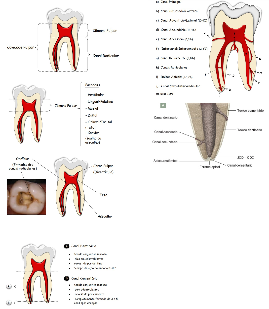 ANATOMIA E ACESSO ENDODONTICO O acesso endodôntico é o procedimento do qual expomos a câmara pulpar e removemos todo o seu teto. · Anatomia da cavidade pulpar · Divisão biológica do canal radicular · Nomenclatura do sistema de canais: O canal ou canais radiculares são mais bem denominados como sistema de canais. pois possuem uma complexa rede de ramificações. * A junção cemento-dentinária (JCD), também denominada limite cemento-dentinário, ou limite CDC (canal dentino-cementário), é definida como a região de transição onde os canais dentinário e cementário se unem. É, teoricamente, o local de maior constrição (menor diâmetro) do canal radicular onde a polpa termina e o periodonto começa. OBS: término da instrumentação de um canal radicular (batente apical) é proposto entre 0,5 e 1 mm do forame apical detectado por um localizador apical eletrônico e confirmado por uma radiografia periapical, tanto no tratamento de dentes não infectados (biopulpectomia), quanto nos infectados (necropulpectomia e retratamento). · Características de cada elemento dentário para auxiliar nas etapas do tratamento endodôntico. 1. INCISIVO CENTRAL SUPERIOR 2. INCISIVO LATERAL SUPERIOR 3. CANINO SUPERIOR 4. 1° PRÉ SUPERIOR 5. 2° PRÉ SUPERIOR 6. 1° MOLAR SUPERIOR 7. 2° MOLAR SUPERIOR 8. INCISIVO SENTRAL INFERIOR 9. INCISIVO LATERAL INFERIOR 10. CANINO INFERIOR 11. 1° PRÉ INFERIOR 12. 2° PRÉ INFERIOR 13. 1° MOLAR 14. 2° MOLAR · NOÇÕES GERAIS DE ACESSO ENDODONTICO · Juntamente com o exame clínico, tomadas radiográficas periapicais, são uma boa ferramenta para auxiliar no planejamento da realização do acesso. · Em algumas situações uma radiografia interproximal poderá complementar e auxiliar na visualização de caries interproximais, na verificação de recidiva de carie abaixo de restaurações, analisar a profundidade da carie, a relação do dente com o nível da cista óssea e sua relação com os dentes vizinhos. · Algumas medidas preliminares básicas devem ser tomadas antes de iniciar o acesso propriamente dito: a. Verificar a inclinação do dente e das raízes no arco dentário. b. Remoção de toda dentina cariada e das restaurações que impeçam o adequado acesso aos canais radiculares. c. Alisar as superfícies pontiagudas dos dentes, que possam interferir na colocação do lençol de borracha e facilitar a realização do isolamento absoluto d. Remover todos os planos inclinados da coroa, que possam interferir no estabelecimento correto de referencias externas, para a futura instrumentação e obturação dos canais radiculares. e. Estabelecer a área de eleição adequada de acordo com as características anatômicas do elemento dentário. · PRINCIPIOS: · Deve-se fazer a remoção do teto e os cornos pulpares · Não deve tocar no assoalho da câmara pulpar · Dar expulsividade a certas paredes pulpares · BROCAS: · Esféricas (1012,1014): o tamanho deve ser compatível com a coroa do dente a ser acessado. Utilizada nos incisivos. · Tronco cônicas diamantadas sem ponta ativa (3082): utilizadas em molar. · Endo Z: utilizada em molares. Para acessar a acamara pulpar deve-se começar utilizando a broca esférica para atravessar o esmalte e dentina, afim de acessar o teto da câmara pulpar, a broca 3082 e endo Z são utilizadas para terminar de remover o teto da câmara. · ETAPAS OPERATORIAS: Essas etapas se iniciam com o estabelecimento de: 1. Área de eleição: É o ponto escolhido para ser iniciado o desgaste do dente. Sendo determinado por um ponto localizado na superfície lingual dos dentes anteriores e oclusal nos posteriores. · Nos incisivos e caninos superiores: Face palatina, 1 a 2 mm abaixo do cíngulo. · Incisivos e caninos inferiores: Face lingual, 1 a 2mm acima do cíngulo. · Pré-molares e molares: Face oclusal, junto a fossa central em ambos os arcos. 2. Direção de trepanação: É a angulagem que se deve dar a broca para que esta atinja a câmara pulpar, devendo-se respeitar a angulagem dos dentes na arcada. É preferível que essa etapa seja feita antes do isolamento absoluto, pois a sua presença poderia induzir a um erro de direção e inclinação dos cortes. Uma vez atingida a trepanação o isolamento absoluto deve ser realizado para poder dar inicio ao preparo da câmara pulpar. 3. Forma de contorno inicial: É a forma obtida a partir do ponto de eleição, normalmente utilizando brocas, operando em motor de alta rotação, sob refrigeração adequada com a uma velocidade lenta, dando uma conformação apropriada a cavidade e procurando respeitar a anatomia interna do dente. Essa penetração inicial deve ser estendida para o interior do dente, em direção a câmara pulpar, reduzindo a espessura da dentina, contudo, sem atingir a remoção do seu teto, respeitando a forma de contorno padrão de cada grupo dental.. Uma medida preventiva importante é que antes da remoção do teto da câmara pulpar, deve-se remover toda dentina cariada, mesmo que envolva outras faces do dente. 4. Desgaste compensatório ou forma de conveniência: É o desgaste adicional que se realiza para que se consiga um acesso direto aos canais radiculares sem interferência de projeções dentinarias. · Ombro palatino: é representado pela projeção da dentina da parede lingual/palatina na entrada do canal radicular. Deve ser removido com a utilização de pontas diamantadas 308 ou 3082 ou endo Z. Em movimentos de tração e lateralidade. · Teto da câmara pulpar: remover todo remanescente de teto da câmara pulpar com brocas esféricas de alta ou baixa rotação até que a aponta da sonda exploradora não enrosque em nada. · ETAPAS OPERATORIAS: · Acesso a câmara pulpar: Esta etapa se inicia com o estabelecimento do ponto de eleição, confecção de uma forma de contorno e direção de trepanação. · Preparo da câmara pulpar: Após a a colocação do isolamento absoluto, inicia-se a preparação da câmara pulpar. Essa etapa 