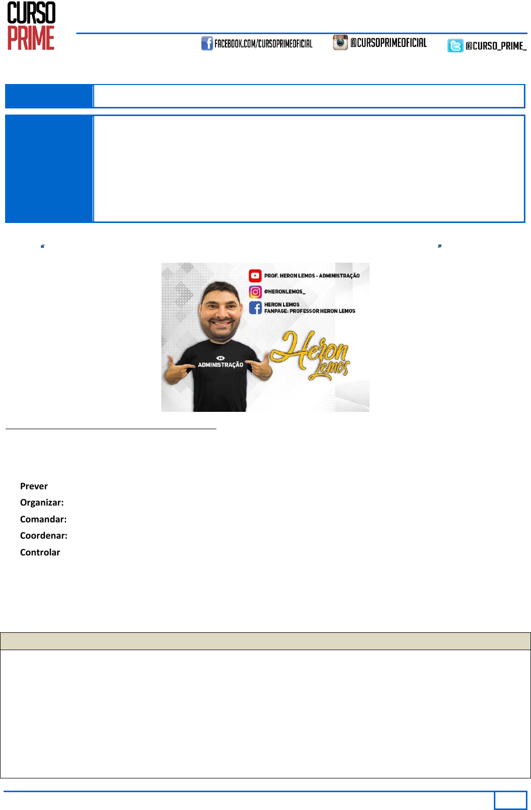 ADMINISTRAÇÃO PÚBLICA PARA CONCURSOS | Módulo Completo – Prof. Heron Lemos CURSO PRIME ALDEOTA – Rua Maria Tomásia, 22 – Aldeota – Fortaleza/CE – Fone: (85) 3208. 2222 1 OS: 0055/11/22-Gil CONCURSO: PM/CE - PÓS-EDITAL ASSUNTO: - Processo organizacional: planejamento, direção, comunicação, controle e avaliação. - Planejamento estratégico. - Características básicas das organizações formais modernas: tipos de estrutura organizacional, natureza, finalidades e critérios de departamentalização. - Gestão de processos. - Relações humanas no trabalho. Frase: Sua luta não termina quando sentir cansaço, mas sim quando atingir o sucesso tão merecido. PROCESSO ADMINISTRATIVO NA VISÃO DE FAYOL Conceito de administração Fayol define o ato de administrar como: prever, organizar, comandar, coordenar e controlar. As funções administrativas envolvem os elementos da administração, isto é, as funções do administrador: 1. Prever: visualizar o futuro e traçar o programa de ação. 2. Organizar: constituir o duplo organismo material e social da empresa. 3. Comandar: dirigir e orientar o pessoal. 4. Coordenar: ligar, unir, harmonizar todos os atos e esforços coletivos. 5. Controlar: verificar que tudo ocorra de acordo com as regras estabelecidas e as ordens dadas. Esses são os elementos da administração que constituem o chamado processo administrativo – são localizáveis no trabalho do administrador em qualquer nível ou área de atividade da empresa. Em outros termos, tanto o diretor, o gerente, o chefe, como o supervisor – cada qual em seu respectivo nível – desempenham atividades de previsão, organização, comando, coordenação e controle, como atividades administrativas essenciais. QUESTÕES DE CONCURSOS 14 - Indique a opção que completa corretamente a frase a seguir: “Fayol define o ato de administrar e que constituem o chamado processo administrativo e que são aplicáveis em qualquer trabalho do administrador em qualquer nível ou área de atividade da organização, como sendo: prever........” a) organizar, comandar, coordenar e controlar. b) organizar, coordenar, comandar e controlar. c) coordenar, organizar, controlar e comandar. d) controlar, organizar, coordenar e comandar. e) coordenar, controlar, organizar e comandar. OS: 0055/11/22-Gil Marcos Campos Destacar Marcos Campos Destacar Marcos Campos Destacar Marcos Campos Destacar Marcos Campos Destacar Marcos Campos Máquina de escrever P O C C C Marcos Campos Lápis ADMINISTRAÇÃO PÚBLICA PARA CONCURSOS | Módulo Completo – Prof. Heron Lemos CURSO PRIME ALDEOTA – Rua Maria Tomásia, 22 – Aldeota – Fortaleza/CE – Fone: (85) 3208. 2222 2 OS: 0055/11/22-Gil GABARITO: A PROCESSO ADMINISTRATIVO NA VISÃO MODERNA Processo significa uma sequência de ações que se sucedem para chegar a um determinado ponto. Uma maneira sistemática de fazer as coisas. É um meio, método ou maneira de conduzir certas atividades. A administração é um processo, posto que todos os administradores, independentemente de seus níveis ou funções, se engajam continuamente em certas atividades inter-relacionadas – como planejar, organizar, dirigir e controlar – para alcançar os objetivos desejados. Assim, o processo administrativo é o conjunto e sequência das funções administrativas. Segundo descreve Chiavenato (2003), quando consideradas em um todo integrado, as funções administrativas formam o processo administrativo. Quando consideradas isoladamente, o planejamento, a organização, a direção e o controle constituem funções administrativas. PLANEJAMENTO Planejamento é o processo administrativo que determina antecipadamente o que um grupo de pessoas deve fazer e quais as metas que devem ser atingidas. O planejamento administrativo significa decidir adiantado o que deve ser feito para alcançar determinado objetivo ou metas. Ele apresenta algumas características de como estabelecer um processo permanente e contínuo, que se preocupa com a racionalidade de tomada de decisões, sendo voltado para o futuro selecionando entre várias alternativas disponíveis um curso de ação onde é sistêmico e interativo. ORGANIZAÇÃO Segundo Chiavenato (2000), “a palavra organização denota todo empreendimento humano moldado intencionalmente para atingir determinados objetivos”. De acordo com Chiavenato (2000), “a importância da organização entre outras é basicamente a de agrupar pessoas e estruturar todos os recursos organizacionais para atingir os objetivos predeterminados”. Com a organização a empresa reúne e integra os recursos, define a estrutura de órgãos que deverão administra-los. Estabelecendo então a divisão do trabalho por diferenciação, possibilita os meios de coordenar as diferentes atividades pela integração de seus setores e define os níveis de autoridade e de responsabilidade. Verifica-se então que as empresas definem os seus domínios, objetivos que pretendem alcançar e seu ambiente de atuação onde procuram a sobrevivência e o crescimento, ou seja, “estabelecem estratégias para melhor aproveitamento e aplicação de seus recursos”. (Chiavenato, 2000). DIREÇÃO Para Hampton (1990) direção designa o processo pelo qual os gerentes procuram lidar com seus subordinados, liderando-os e comunicando-se com eles. Os outros processos administrativos – planejamento, organização e controle – podem ser vistos como interpessoais. Um gerente poderia praticá-los sozinho em seu escritório. Porém, liderar, ou a liderança, é diferente. A liderança refere-se ao processo interpessoal por meio do qual um gerente procura influenciar os empregados para que eles cumpram as tarefas. A liderança acontece não isoladamente, mas na inteiração. De todas as funções da administração, a liderança parece ser a mais estudada, e possivelmente a menos compreendida. CONTROLE Pressupõe em um trabalho coordenado, que facilite a troca de informações, estabe