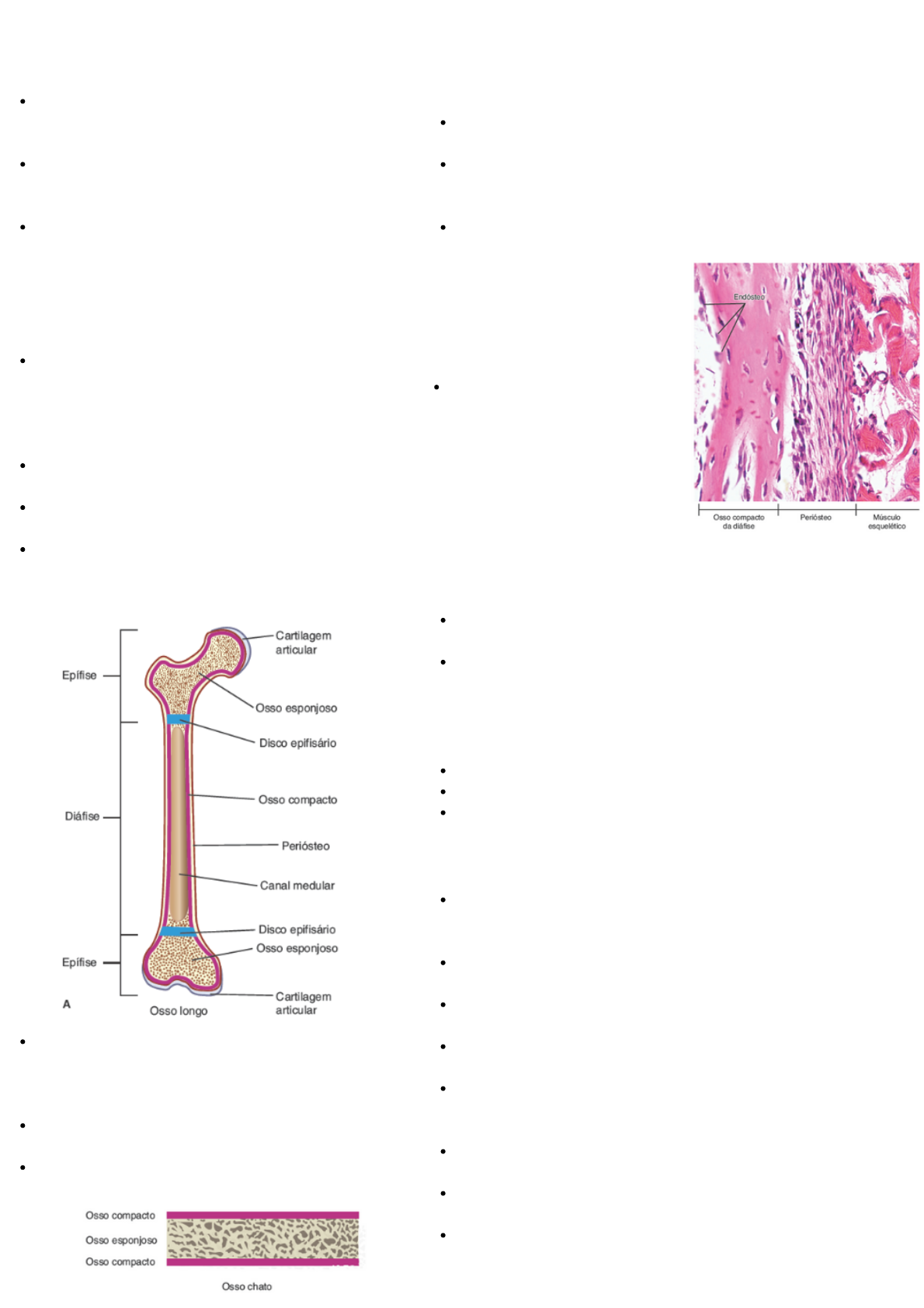 Tecido ósseo Características principais: Um tipo de tecido conjuntivo formado por células e matriz extracelular orgânica mineralizada. Dureza e resistência dos ossos: se dá pela grande quantidade de fibras de colágeno tipo I associadas a um sal de fosfato de cálcio. Os ossos estão em constante estado de remodelação e adaptação em resposta a forças que atuam sobre os ossos e a influências hormonais. Funções do tecido ósseo: Metabólica: atua como reservatório de íons como o cálcio e o fosfato, armazenando-os e liberando-os de maneira controlada para manter constante a sua concentração nos líquidos corporais. Dotar o corpo com um esqueleto axial e apendicular para sua sustentação. Proteger os órgãos vitais contidos nas caixas craniana e torácica e no canal raquidiano. Alojar a medula óssea hematopoiética. Disposição do tecido ósseo nos ossos: O tecido ósseo no interior das epífises é do tipo denominado osso esponjoso, revestido na superfície por uma delgada camada de osso compacto, chamado também de osso cortical. A diáfise é quase totalmente formada por uma camada de osso compacto. O osso da diáfise delimita um canal central, o canal medular. A camada mais externa do periósteo é formada principalmente por fibras colágenas e fibroblastos. A camada interna do periósteo, apoiada no tecido ósseo, é mais celularizada e contém células osteoprogenitoras e osteoblastos inativos. Vasos sanguíneos do periósteo se dirigem para o interior no tecido ósseo, irrigando-o. Periósteo: camada de tecido conjuntivo denso firmemente aderida ao osso. Reveste a parte externa do osso. importante participação no crescimento, na remodelação e na recuperação do osso após traumatismos mecânicos, além da nutrição do tecido ósseo pela existência de vasos sanguíneos em seu interior. Endósteo: camada delgada composta principalmente de osteoblastos inativos e células osteoprogenitoras. Reveste todas as superfícies internas do osso. Células do tecido ósseo Células da linhagem osteoblástica, composta das células osteoprogenitoras, dos osteoblastos e dos osteócitos. Células da linhagem osteoclástica, composta dos osteoclastos, formados pela fusão de precursores originados na medula hematopoética. originam-se das células-tronco mesenquimais. células achatadas que revestem a superfície do tecido ósseo. Nos períodos de formação e crescimento de ossos, dividem- se por mitoses e originam os osteoblastos. Células osteoprogenitoras: Osteoblastos: principais responsáveis pela formação de osso em decorrência de sua atividade de síntese e secreção do componente orgânico da matriz óssea: colágeno tipo I. Produzem também fatores de crescimento que influenciam a função de outras células do tecido ósseo. são capazes de concentrar fosfato de cálcio, participando da mineralização da matriz. Durante o processo da ossificação os osteoblastos apresentam intensa atividade de síntese e secreção. Quando estimulados, vários genes dos osteoblastos passam a ser expressos, resultando em sua diferenciação em osteócitos. Os osteoblastos sintetizam e secretam matriz orgânica que se deposita sobre a superfície óssea preexistente. A matriz recém-formada, ainda não mineralizada, recebe o nome de osteoide. Após continuada síntese de matriz, o osteoblasto acaba sendo totalmente envolvido pela matriz e passa a ser considerado um osteócito. Osteócitos: Os osteócitos são, portanto, osteoblastos que passaram a ser inteiramente envolvidos por matriz óssea e situam-se no interior do tecido ósseo. pós o processo de mineralização, a matriz orgânica adquire uma consistência rígida. Nessa matriz, os osteócitos ocupam pequenos espaços denominados lacunas, e cada lacuna contém apenas um osteócito. Várias proteínas são produzidas pelos osteócitos, destacando-se a osteocalcina, a osteopontina e a osteonectina Prolongamentos dos osteócitos: Os prolongamentos dos osteócitos também são envolvidos por matriz mineralizada e ocupam estreitos túneis ósseos denominados canalículos, que se comunicam com as lacunas. coordenam a manutenção e o crescimento do osso pelas intercomunicações de osteócitos de diferentes partes do osso, permitindo que essas células atuem como mecanossensores. A nutrição dos osteócitos depende, portanto, da extensa rede de canalículos intercomunicantes. Osteoclastos: São responsáveis pela reabsorção de tecido ósseo, desfazendo a matriz óssea. São derivados de precursores originados da medula hematopoética. Os osteoclastos apoiam-se sobre a superfície externa ou interna do tecido ósseo ou em túneis dilatados escavados no interior das peças ósseas. Em sua atividade de reabsorção de tecido ósseo, os osteoclastos geralmente se colocam sobre pequenas depressões da matriz, escavadas pela atividade dessas células, chamadas lacunas de Howship. Os osteoclastos exercem uma importante função para a manutenção do equilíbrio do volume ósseo do corpo. Os ossos passam por constante remodelação em resposta a cargas que eles sofrem e a influências hormonais. Durante a remodelação de um osso em um organismo sadio, há adição de tecido ósseo em um local do osso, que costuma ser contrabalançada pela reabsorção exercida pelos osteoclastos em outro local do osso, mantendo o volume ósseo constante. Importância dos osteoclastos na remodelação óssea e na homeostase do organismo: Matriz óssea A matriz óssea é constituída de um componente orgânico e de um componente inorgânico. Cerca de 95% da parte orgânica da matriz é formada por fibras colágenas constituídas, principalmente, de colágeno do tipo I, e o restante da matriz orgânica, por outros tipos de colágenos. O componente inorgânico representa aproximadamente 50% do peso da matriz óssea. O principal componente mineral consiste em nanocristais de hidroxiapatita, formados por fosfato de cálcio. Mecanismo de mineraliza