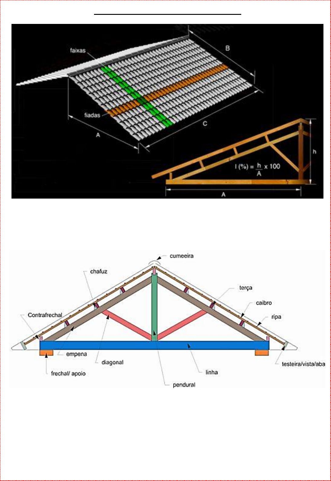 Cálculo de Inclinação de Telhado Nesse artigo vamos mostrar como fazer cálculo e desenho da inclinação de um telhado. O objetivo desse cálculo é determinar qual a altura da cumeeira e do pendural no caso de telhados de madeira. Antes de prosseguir, vamos relembrar as partes que compõem um telhado na ilustração abaixo (cortesia EW7): O grande determinante da inclinação de um telhado é o tipo de telha a ser utilizado. As telhas podem ser de cerâmica, concreto, fibrocimento, vidro, metálicas, galvanizadas, ecológicas (fibras naturais ou materiais reciclados) e de policarbonato. Cada uma delas tem diferentes especificações de inclinação mínima (para evitar o “retorno” de água) e máxima (para evitar que a telha “escorregue” do madeiramento). A inclinação pode ser expressa em porcentagem (%) ou graus (º) sendo a porcentagem a mais utilizada. Por exemplo, é comum ouvirmos que o telhado terá 25 % de inclinação. Para sabermos a inclinação das telhas seguimos a tabela abaixo: Com base na inclinação da telha que vai ser utilizada vamos partir para o desenho do telhado. O cálculo da inclinação (i) do telhado é uma fórmula simples onde multiplicamos a altura (h) por 100 e dividimos pelo comprimento da base (B). Por exemplo, supondo que escolhemos uma Telha Colonial que requer uma inclinação de 30% para um telhado de duas águas com 8,00 metros de comprimento. Como a cumeeira está no centro vamos utilizar 4,00 metros para base de nosso cálculo. Com essas medidas aplicadas na fórmula vamos ter uma altura de 1,20 metros. Fizemos aqui um exemplo para um telhado de duas águas mas para telhados com 3 ou 4 águas devemos fazer a mesma inclinação para todas, seguindo essa mesma fórmula. http://blog.construir.arq.br/wp-content/uploads/2014/06/Telhado-3.png http://blog.construir.arq.br/wp-content/uploads/2014/06/Telhado-2.png Para garantir o escoamento da água, a inclinação varia de acordo com o comprimento do telhado. Acompanhe abaixo o gráfico com as recomendações para telhas com inclinação de 30%, em função do comprimento do pano do telhado. Em todos os casos a inclinação mínima de 30% deve ser respeitada para evitar que o acúmulo de água de chuva sobre a cobertura cause vazamentos. Outro aspecto muito importante quando calculamos e desenhamos um telhado é a previsão do espaço da caixa d’água sob eles. Note que até então mostramos a altura da estrutura do telhado apenas. Esse espaço deve prever o acesso à caixa também e a construção das empenas para o fechamento da alvenaria. Em casos onde o aquecimento, elétrico ou solar fica sob o telhado esse espaço deve ser previsto. Um contato com o projetista hidráulico é essencial nessa fase. Às vezes os projetos hidráulicos podem exigir um espaço muito grande para a caixa d’água e a estética começa a ser comprometida. Para esses casos a melhor solução é a criação de uma torre para caixa d’água, independente do telhado. Fonte: Arq. José Eduardo Rendeiro http://blog.construir.arq.br/wp-content/uploads/2014/06/Telhado-9.jpg http://blog.construir.arq.br/wp-content/uploads/2014/06/Telhado-10.jpg