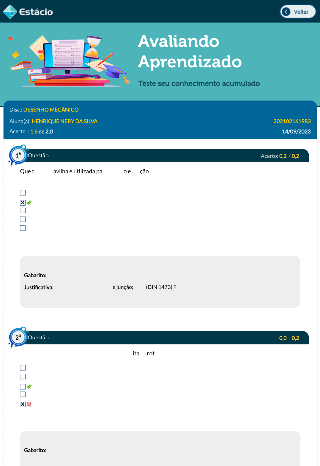 14/09/2023, 09:31 Estácio: Alunos https://simulado.estacio.br/alunos/ 1/6 Avaliando Aprendizado Teste seu conhecimento acumulado Disc.: DESENHO MECÂNICO Aluno(a): HENRIQUE NERY DA SILVA 202102161983 Acertos: 1,6 de 2,0 14/09/2023 Acerto: 0,2 / 0,2 Que tipo de cavilha é utilizada para �xação e junção em casos de aplicação de forças variáveis e simétricas, bordas de peças de ferro fundido? KS 9 KS 3 KS 6 KS 1 KS 7 Respondido em 14/09/2023 09:10:33 Explicação: Gabarito: KS 3 Justi�cativa: KS 1 (DIN 1471) Fixação e junção; KS 3 (DIN 1473) Fixação e junção em casos de aplicação de forças variáveis e simétricas, bordas de peças de ferro fundido; KS 6 e KS 7 - Ajustagem e �xação de molas e correntes; KS 9 - Utilizado nos casos em que se tem necessidade de puxar a cavilha do furo. Acerto: 0,0 / 0,2 Que elemento de máquina utilizamos para evitar a rotação relativa em eixos cônicos? Buchas Mancais Chavetas Guias Rolamentos Respondido em 14/09/2023 09:13:04 Explicação: Gabarito: Chavetas Questão1 a Questão2 a https://simulado.estacio.br/alunos/inicio.asp javascript:voltar(); 14/09/2023, 09:31 Estácio: Alunos https://simulado.estacio.br/alunos/ 2/6 Justi�cativa: Os eixos cônicos devem ser ajustados a um componente que possua um furo de encaixe cônico. A parte que se ajusta tem um formato cônico e é �rmemente presa por uma porca. Uma chaveta é utilizada para evitar a rotação relativa. Acerto: 0,2 / 0,2 Dados os valores, calcule as categorias de montagem dos elementos de um conjunto que são classi�cadas segundo a possibilidade de movimento relativo entre as peças que o constituem. Segundo aO IT máximo é 3. necessidade de funcionamento dos componentes haverá conjuntos furo/eixo que tenham liberdade de movimento, outros com se deslocam longitudinalmente de forma deslizante e outros �xos sob pressão para garantir a união das peças. a) Ajuste Móvel e móvel deslizante; b) Ajuste �xo e c) Ajuste incerto. o IT para um diâmetro com dn = 20 mm; as = +0,009 e ai = = 0,004? 8 11 6 12 5 Respondido em 14/09/2023 09:13:21 Explicação: De acordo com a tabela: 20 está entre 18 e 30, logo: Sendo assim, considerando a tabela de Relações de IT: O IT 6 tem tolerância de 10i. Acerto: 0,2 / 0,2 Um pro�ssional de engenharia que trabalhe com projetos de peças, deve compreender um desenho de conjunto mecânico. Este deve ser subdividido em diversos subconjuntos, de forma que a leitura do projeto se torne de fácil entendimento. Examinando a lista de peças da legenda da �gura abaixo, qual o diâmetro e a bitola do encosto móvel, respectivamente? Questão3 a Questão4 a 14/09/2023, 09:31 Estácio: Alunos https://simulado.estacio.br/alunos/ 3/6 25 e 16 mm 12,7 e 20 mm Engrenagem planetária 16 e 70 mm 6,35 e 80 mm Respondido em 14/09/2023 09:17:19 Explicação: Leitura direta da legenda: # 16 mm e Φ 25 mm Acerto: 0,2 / 0,2 No Desenho Técnico, nem todas as vistas estão paralelas aos planos , e . Quando isso ocorre, como fazemos para obter as arestas em verdadeira grandeza? Vistas auxiliares. Rebatimento para o 3º diedro. Rebatimento para o 1º diedro. Rotação do hexaedro básico. Vistas em corte. Respondido em 14/09/2023 09:22:37 Explicação: Gabarito: Vistas auxiliares. Justi�cativa: Em alguns casos, como os mostrados adiante, não se consegue que todos os planos do objeto �quem paralelos aos , e , quando, então, usa-se o artifício da vista ortográ�ca auxiliar, que na Geometria Descritiva é fundamentada pelas operações de rotação e rebatimento de planos, com o objetivo de se obter a "verdadeira grandeza" das arestas. Acerto: 0,2 / 0,2 O acoplamento é um conjunto mecânico usado na transmissão de movimento de rotação entre duas árvores ou eixo-árvores. Que tipo de acoplamento pode ser montado sem problemas de alinhamento? Com luvas de compressão Rígido com �anges π π ′ π ′′ π π ′ π ′′ Questão5 a Questão6 a 14/09/2023, 09:31 Estácio: Alunos https://simulado.estacio.br/alunos/ 4/6 Discos ou pratos Garras Per�ex Respondido em 14/09/2023 09:18:40 Explicação: Gabarito: Com luvas de compressão Justi�cativa: O acoplamento com luva de compressão ou de aperto facilita a manutenção de máquinas e equipamentos, além de ter a vantagem de não interferir no posicionamento das árvores; podendo ser montado e removido sem problemas de alinhamento. Acerto: 0,2 / 0,2 A norma brasileira prevê 18 qualidades de trabalho. Essas qualidades são identi�cadas pelas letras: IT seguidas de numerais. A cada uma delas corresponde um valor de tolerância. Qual o IT máximo usado para calibrar EIXOS? 3 16 5 11 4 Respondido em 14/09/2023 09:25:12 Explicação: De acordo com a �gura: O IT máximo é 3. Acerto: 0,0 / 0,2 Um pro�ssional de engenharia que trabalhe com projetos de peças, deve compreender um desenho de conjunto mecânico. Este deve ser subdividido em diversos subconjuntos, de forma que a leitura do projeto se torne de fácil entendimento. Que tipo de desenho permite instruções numéricas para a sequência de montagem? De Detalhes De Patente De Montagem De Conjunto Questão7 a Questão8 a 14/09/2023, 09:31 Estácio: Alunos https://simulado.estacio.br/alunos/ 5/6 Isométrico Respondido em 14/09/2023 09:28:35 Explicação: Nos desenhos de patente faz-se necessário o uso de vistas explodidas das peças separadas. Acerto: 0,2 / 0,2 Para adquirir os rebites adequados ao seu trabalho, é necessário que você conheça suas especi�cações, ou seja: que material vai unir; · o tipo de sua cabeça; · o diâmetro do seu corpo; · o comprimento a ser unido. de que material é feito; · o tipo de sua cabeça; · o diâmetro do seu corpo; · o comprimento a ser unido. que material vai unir; · o tipo de sua cabeça; · o diâmetro do furo; · o seu comprimento útil. de que material é feito; · o tipo de sua cabeça; · o diâmetro do seu corpo; · o seu comprimento útil. que material vai unir; · o 