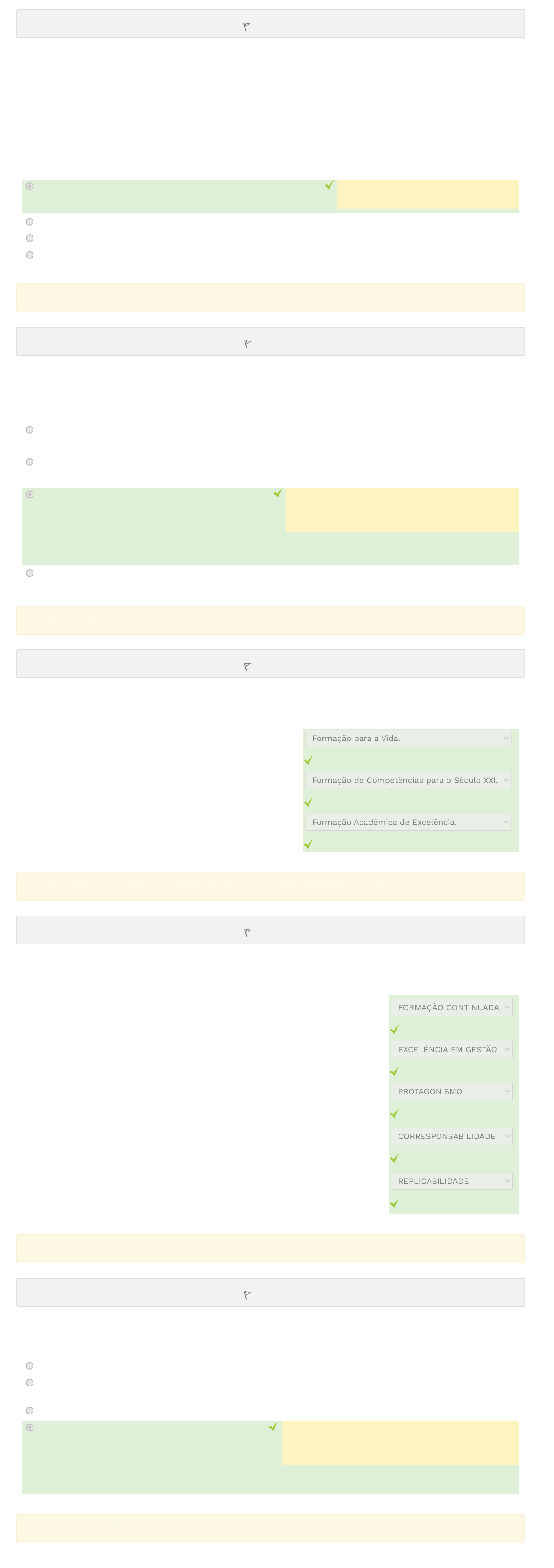 Página inicial Terminar revisão Iniciado em quinta, 14 set 2023, 17:10 Estado Finalizada Concluída em quinta, 14 set 2023, 17:22 Tempo empregado 11 minutos 39 segundos Notas 5,00/5,00 Avaliar 100,00 de um máximo de 100,00 Questão 1 Correto Atingiu 1,00 de 1,00 Marcar questão Sobre o Programa Ensino Integral (PEI), identi�que quais das a�rmações são falsas (F) e quais são verdadeiras (V) e selecione a alternativa que apresenta a sequência correta. ���Umas das premissas do PEI é a replicabilidade do Programa. ���Um dos diferenciais do PEI diz respeito às condições diferenciadas para o trabalho dos pro�ssionais que atuam no PEI, como o Regime de Dedicação Exclusiva (RDE). ���A implantação do PEI iniciou no Estado de São Paulo no ano de 2012. Depois desse período não houve mais expansão do Programa. ���O ideal formativo, o eixo formativo, os princípios e as premissas são elementos que compõem o PEI. Escolha uma opção: a. V-V-F-V Isso! Você identi�cou corretamente as a�rmações verdadeiras e as falsas. b. F-V-F-V c. V-F-F-V d. V-V-V-F Sua resposta está correta.Sua resposta está correta. Questão 2 Correto Atingiu 1,00 de 1,00 Marcar questão O Programa Ensino Integral (PEI) possui 4 (quatro) princípios que norteiam a educação integral. Um deles é a Pedagogia da Presença. Sobre esse princípio podemos a�rmar: Escolha uma opção: a. Incentiva os estudantes a serem personagens principais da prática educativa, potencializando a participação ativa e construtiva em diversos contextos. b. Nos traz um olhar sobre a importância do equilíbrio das relações do Logos com o Pathos, o Mytho e o Eros de forma harmônica e inteligente. c. A Pedagogia da Presença é um princípio no qual espera- se que os pro�ssionais exerçam sobre os estudantes uma in�uência construtiva: estar próximo, estar com alegria, sem oprimir nem inibir, sabendo afastar -se no momento oportuno, encorajando os estudantes a crescer e a agir com liberdade e responsabilidade. Resposta Correta. Essas são habilidades que o(a) educador(a) deve apresentar em sua atuação junto aos estudantes. d. Corresponde a Aprender a Conhecer, Aprender a Fazer, Aprender a Conviver e Aprender a Ser. Sua resposta está correta.Sua resposta está correta. Questão 3 Correto Atingiu 1,00 de 1,00 Marcar questão O Programa Ensino Integral tem como foco a formação integral do estudante, estruturada em três eixos formativos. Associe cada eixo formativo aos seus fundamentos: É o foco das ações do PEI, pois visa formar adultos éticos, responsáveis e conscientes de seus direitos e deveres. Prepara o estudante para enfrentar os desa�os e as mudanças do mundo contemporâneo de forma crítica, atuando positivamente em seu meio. Visa garantir a construção de conhecimentos para que os estudantes tenham acesso a uma educação de qualidade. Resposta Correta. Você compreendeu perfeitamente os fundamentos referentes a este eixo formativo.Resposta Correta. Você compreendeu perfeitamente os fundamentos referentes a este eixo formativo. Questão 4 Correto Atingiu 1,00 de 1,00 Marcar questão As Premissas do Modelo de Gestão do PEI são fundamentos para que as metas estabelecidas pela escola sejam alcançadas. Diante disso, associe a cada premissa o seu respectivo conceito. Corresponde ao reconhecimento da importância de se aperfeiçoar pro�ssionalmente, por meio do autodesenvolvimento e de outras estratégias formativas, para que possa desempenhar suas funções com qualidade. O foco está na conquista dos resultados estabelecidos no Plano de Ação da escola e pela Seduc – SP por meio do uso das ferramentas e dos instrumentos de gestão. Consiste em possibilitar a criação de espaços e ações que permitem tanto aos educadores quanto aos estudantes exercer sua autonomia na busca da resolução de problemas nos mais diversos contextos. De�ne o comprometimento, o envolvimento e a responsabilidade em todo o processo educacional para garantir o cumprimento dos objetivos, das metas e dos resultados desejados. Visa o compartilhamento das experiências exitosas, passíveis de multiplicação para as demais escolas da rede, contribuindo para a melhoria da qualidade de ensino e aprendizagem dos estudantes. Resposta Correta. Você compreendeu perfeitamente o conceito referente a esta premissa do PEI.Resposta Correta. Você compreendeu perfeitamente o conceito referente a esta premissa do PEI. Questão 5 Correto Atingiu 1,00 de 1,00 Marcar questão Sobre o conceito de educação integral é correto a�rmar que: Escolha uma opção: a. Os estudos sobre educação integral a�rmam que pode ser compreendida como sinônimo de tempo integral. b. Para que a educação integral aconteça é fundamental que o professor tome as decisões, pois o estudante é um ser passivo diante da realidade. c. Somente as escolas que fazem parte do PEI trabalham com o conceito de educação integral. d. De acordo com o Currículo Paulista, a educação integral ocorre quando se tem um olhar sistêmico sobre a formação do estudante para que este possa desenvolver competências e habilidades nas múltiplas dimensões: intelectual, física, socioemocional e cultural. Resposta Correta. A educação integral é aquela que compreende e desenvolve o estudante em suas múltiplas dimensões. Sua resposta está correta.Sua resposta está correta. ◄ 1.1 - Sobre a Educação Integral e o Programa Ensino Integral (PEI) Seguir para... 2.1 - Componentes Curriculares e Metodologias do Modelo Pedagógico ► Escola de Formação e Aperfeiçoamento dos Pro�ssionais da Educação do Estado de São Paulo "Paulo Renato Costa Souza" Rua João Ramalho, 1546 - Perdizes - CEP 05008-002 - São Paulo - SP - Brasil - (11) 3866-0400 NANCI ANA TEIXEIRA NUNES Atendimento Estrutura Meus cursos Busc InícioInício Meus cursosMeus cursos Da Educação Integral ao Ensino Integral - 2ª Edição/2023Da Educação Integral ao