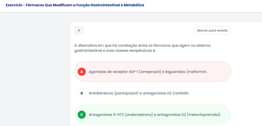Que Modificam a Função Gastrointestinal e Metabólica 1 Marcar para revisão A alternativa em que há correlação entre os fármacos que agem no sistema gastrointestinal e suas classes terapêuticas é: