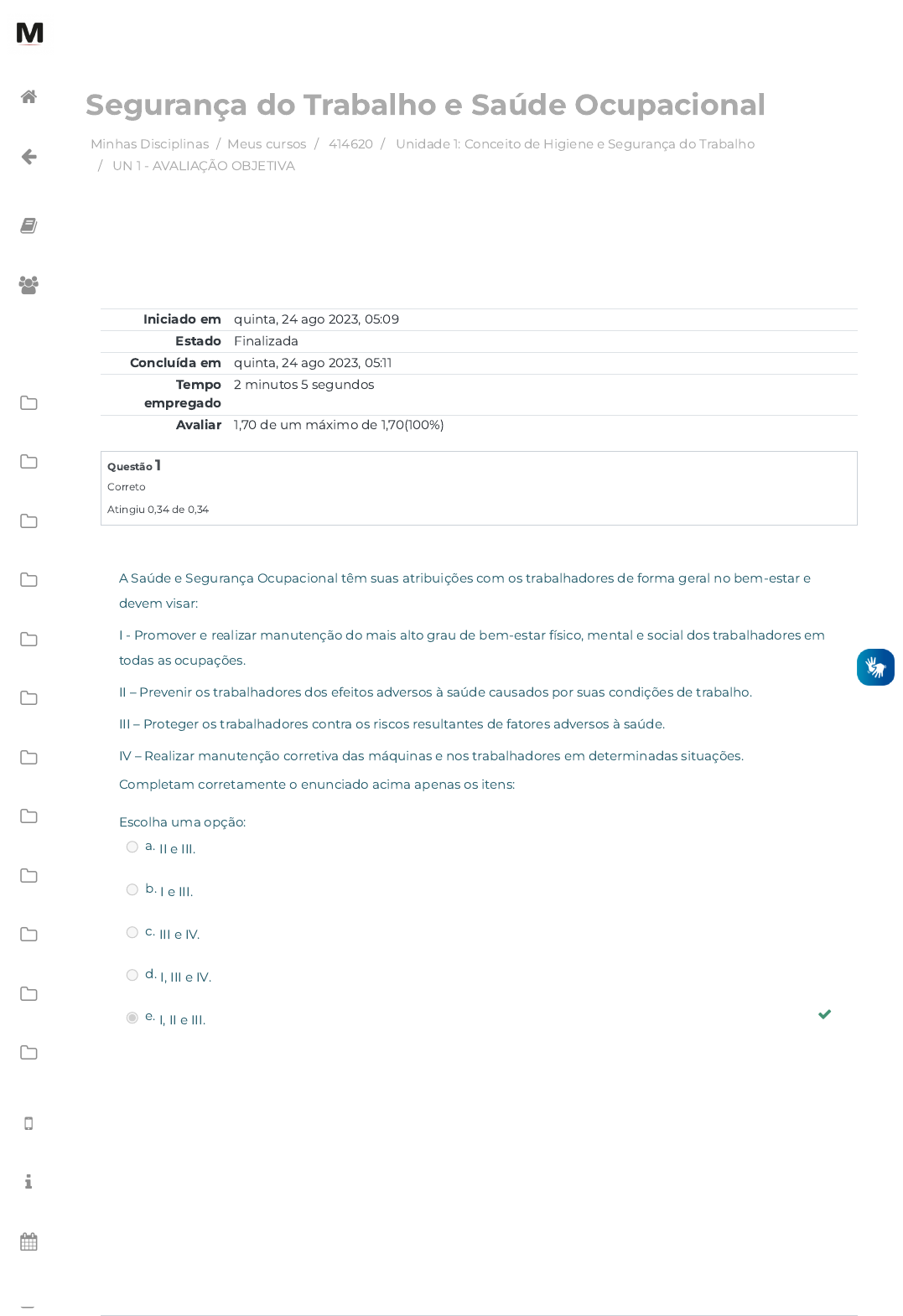 Minhas Disciplinas / Meus cursos / 414620 / Unidade 1: Conceito de Higiene e Segurança do Trabalho / UN 1 - AVALIAÇÃO OBJETIVA Segurança do Trabalho e Saúde Ocupacional Iniciado em quinta, 24 ago 2023, 05:09 Estado Finalizada Concluída em quinta, 24 ago 2023, 05:11 Tempo empregado 2 minutos 5 segundos Avaliar 1,70 de um máximo de 1,70(100%) Questão 1 Correto Atingiu 0,34 de 0,34 A Saúde e Segurança Ocupacional têm suas atribuições com os trabalhadores de forma geral no bem-estar e devem visar: I - Promover e realizar manutenção do mais alto grau de bem-estar físico, mental e social dos trabalhadores em todas as ocupações. II – Prevenir os trabalhadores dos efeitos adversos à saúde causados por suas condições de trabalho. III – Proteger os trabalhadores contra os riscos resultantes de fatores adversos à saúde. IV – Realizar manutenção corretiva das máquinas e nos trabalhadores em determinadas situações. Completam corretamente o enunciado acima apenas os itens: Escolha uma opção: a. II e III. b. I e III. c. III e IV. d. I, III e IV. e. I, II e III. https://avap.multivix.edu.br/my/ https://avap.multivix.edu.br/course/view.php?id=23729 https://avap.multivix.edu.br/course/view.php?id=23729§ion=2 https://avap.multivix.edu.br/mod/quiz/view.php?id=1524608 https://avap.multivix.edu.br/my/ https://avap.multivix.edu.br/course/view.php?id=23729 https://avap.multivix.edu.br/user/index.php?id=23729 https://avap.multivix.edu.br/course/view.php?id=23729§ion=1 https://avap.multivix.edu.br/course/view.php?id=23729§ion=2 https://avap.multivix.edu.br/course/view.php?id=23729§ion=3 https://avap.multivix.edu.br/course/view.php?id=23729§ion=4 https://avap.multivix.edu.br/course/view.php?id=23729§ion=5 https://avap.multivix.edu.br/course/view.php?id=23729§ion=6 https://avap.multivix.edu.br/course/view.php?id=23729§ion=7 https://avap.multivix.edu.br/course/view.php?id=23729§ion=8 https://avap.multivix.edu.br/course/view.php?id=23729§ion=9 https://avap.multivix.edu.br/course/view.php?id=23729§ion=10 https://avap.multivix.edu.br/course/view.php?id=23729§ion=11 https://avap.multivix.edu.br/course/view.php?id=23729§ion=12 https://avap.multivix.edu.br/hooks/portal/ https://avap.multivix.edu.br/mod/page/view.php?id=1252%2F%22%20target%3D%22_blank https://avap.multivix.edu.br/calendar/view.php/ https://avap.multivix.edu.br/local/staticpage/view.php?page=biblioteca https://avap.multivix.edu.br/ Questão 2 Correto Atingiu 0,34 de 0,34 Questão 3 Correto Atingiu 0,34 de 0,34 Veja a frase que está incompleta abaixo: As atividades ou operações que expõem os trabalhadores à níveis de ruído, contínuo ou intermitente, superiores aos limites determinados pelos órgãos competentes e sem proteção adequada, oferecerão risco _____________ grave e iminente. Agora, marque a alternativa que completa a frase adequadamente: Escolha uma opção: a. Físicos. b. Químicos. c. Acidentes. d. Mecânicos. e. Ergonômicos. Devido a evolução da tecnologia de informação, da globalização e o acirramento da competitividade, novos processos produtivos foram inseridos nos ambientes de trabalho, assim como novos materiais e equipamentos. A partir destas informações, marque a alternativa correta que apresenta a consequência desta crescente exposição dos trabalhadores: Escolha uma opção: a. Acidentes e doenças ocupacionais. b. Incidentes e doenças laboratoriais. c. Acidentes e doenças regenerativas. d. Acidentes e doenças degenerativas. e. Incidentes e doenças regenerativas. https://avap.multivix.edu.br/my/ https://avap.multivix.edu.br/course/view.php?id=23729 https://avap.multivix.edu.br/user/index.php?id=23729 https://avap.multivix.edu.br/course/view.php?id=23729§ion=1 https://avap.multivix.edu.br/course/view.php?id=23729§ion=2 https://avap.multivix.edu.br/course/view.php?id=23729§ion=3 https://avap.multivix.edu.br/course/view.php?id=23729§ion=4 https://avap.multivix.edu.br/course/view.php?id=23729§ion=5 https://avap.multivix.edu.br/course/view.php?id=23729§ion=6 https://avap.multivix.edu.br/course/view.php?id=23729§ion=7 https://avap.multivix.edu.br/course/view.php?id=23729§ion=8 https://avap.multivix.edu.br/course/view.php?id=23729§ion=9 https://avap.multivix.edu.br/course/view.php?id=23729§ion=10 https://avap.multivix.edu.br/course/view.php?id=23729§ion=11 https://avap.multivix.edu.br/course/view.php?id=23729§ion=12 https://avap.multivix.edu.br/hooks/portal/ https://avap.multivix.edu.br/mod/page/view.php?id=1252%2F%22%20target%3D%22_blank https://avap.multivix.edu.br/calendar/view.php/ https://avap.multivix.edu.br/local/staticpage/view.php?page=biblioteca https://avap.multivix.edu.br/ Questão 4 Correto Atingiu 0,34 de 0,34 Questão 5 Correto Atingiu 0,34 de 0,34 Veja a frase que está incompleta abaixo: Higiene do Trabalho trata da prevenção e diagnóstico de ________________ encontradas em vários ambientes de trabalho. Agora, marque a alternativa que completa a frase adequadamente: Escolha uma opção: a. Doenças laborais. b. Higiene e conservação. c. Limpeza do ambiente. d. Riscos eminentes. e. Acidentes de trabalho. A Higiene do trabalho é a ciência que atua no campo da saúde ocupacional. A segurança do trabalho opera e interfere nas condições ambientais laborais baseadas nas Normas Regulamentadoras. A partir deste conhecimento construído, pode-se dizer que: Escolha uma opção: a. Conceitos divisíveis e não são tratados como dois aspectos de um problema. b. Conceitos divisiveis e são tratados como um aspecto de um problema. c. Conceitos divisíveis e são tratados como dois aspectos de um problema. d. Conceitos indivisíveis e não são tratados como dois aspectos de um problema. e. Conceitos indivisíveis e são tratados como dois aspectos de um problema. ◄ Conteúdo Online Seguir para... Conteúdo Online ► https://avap.multivix.edu.br/mod/scorm/view.php?id=1524607&forceview=1 https://avap.multivix.edu.br/mod/scorm/view.php?id=152