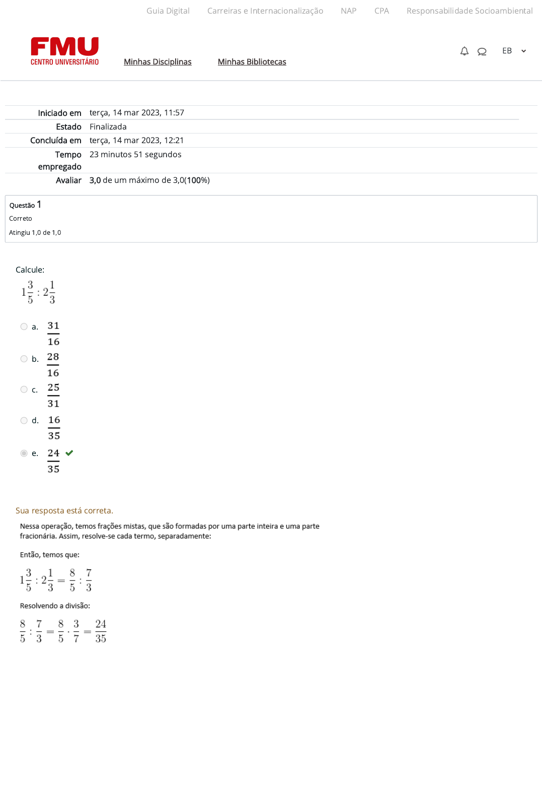 Iniciado em terça, 14 mar 2023, 11:57 Estado Finalizada Concluída em terça, 14 mar 2023, 12:21 Tempo empregado 23 minutos 51 segundos Avaliar 3,0 de um máximo de 3,0(100%) Questão 1 Correto Atingiu 1,0 de 1,0 Calcule: a. b. c. d. e. Sua resposta está correta. Guia Digital Carreiras e Internacionalização NAP CPA Responsabilidade Socioambiental Minhas Disciplinas Minhas Bibliotecas EB https://codely-fmu-content.s3.amazonaws.com/Moodle/GuiaDigital/Guia+digital/index.html https://carreiras.fmu.br/ https://codely-fmu-content.s3.amazonaws.com/Moodle/NAP/inicial/nap/fmu/index.html https://codely-fmu-content.s3.amazonaws.com/Moodle/CPA/landing_CPA/index.html https://portal.fmu.br/sustentabilidade https://ambienteacademico.com.br/ https://ambienteacademico.com.br/ https://ambienteacademico.com.br/course/view.php?id=236 Questão 2 Correto Atingiu 1,0 de 1,0 Você vai comprar um terreno que possui o formato de um quadrado e um perímetro com área medindo, em metros, 90 m². Considerando os chamados números irracionais os 90 m² podem ser expressos como: a. √10 metros b. 5√10 metros c. 7√10 metros d. 3√10 metros e. 12√10 metros Sua resposta está correta. Para calcular o perímetro, é necessário multiplicar por 4 um dos lados do terreno. Para identi�car um lado calcula-se a raiz quadrada da área, ou seja √90. Para tornar o cálculo mais simples consideramos que 90 = 9 ×10 e que √9 = 3, então o valor do lado será: 3√10. Multiplicando por 4 temos: 4 ×3√10 = 12√10 metros Guia Digital Carreiras e Internacionalização NAP CPA Responsabilidade Socioambiental Minhas Disciplinas Minhas Bibliotecas EB https://codely-fmu-content.s3.amazonaws.com/Moodle/GuiaDigital/Guia+digital/index.html https://carreiras.fmu.br/ https://codely-fmu-content.s3.amazonaws.com/Moodle/NAP/inicial/nap/fmu/index.html https://codely-fmu-content.s3.amazonaws.com/Moodle/CPA/landing_CPA/index.html https://portal.fmu.br/sustentabilidade https://ambienteacademico.com.br/ https://ambienteacademico.com.br/ https://ambienteacademico.com.br/course/view.php?id=236 Questão 3 Correto Atingiu 1,0 de 1,0 Um grupo de infantaria motorizada do exército brasileiro deve se deslocar em direção de um quartel que �ca a 512 quilômetros do seu ponto de partida. Contudo, o exército brasileiro mede distâncias em milhas. Sabendo-se que cada milha vale, aproximadamente, 1,6 quilômetro. Quantas milhas há nos 512 quilômetros que serão percorridos? a. 180 milhas b. 320 milhas c. 500 milhas d. 819 milhas e. 256 milhas Sua resposta está correta. Na questão temos uma divisão de um número inteiro por um número decimal. Para omitir a virgula, multiplicamos 1,6 x10, o que nos obriga a também multiplicar 512 x 10. Assim 5120/16= 320 Guia Digital Carreiras e Internacionalização NAP CPA Responsabilidade Socioambiental Minhas Disciplinas Minhas Bibliotecas EB https://codely-fmu-content.s3.amazonaws.com/Moodle/GuiaDigital/Guia+digital/index.html https://carreiras.fmu.br/ https://codely-fmu-content.s3.amazonaws.com/Moodle/NAP/inicial/nap/fmu/index.html https://codely-fmu-content.s3.amazonaws.com/Moodle/CPA/landing_CPA/index.html https://portal.fmu.br/sustentabilidade https://ambienteacademico.com.br/ https://ambienteacademico.com.br/ https://ambienteacademico.com.br/course/view.php?id=236
