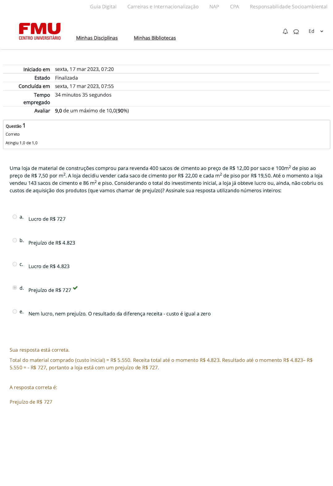 Iniciado em sexta, 17 mar 2023, 07:20 Estado Finalizada Concluída em sexta, 17 mar 2023, 07:55 Tempo empregado 34 minutos 35 segundos Avaliar 9,0 de um máximo de 10,0(90%) Questão 1 Correto Atingiu 1,0 de 1,0 Uma loja de material de construções comprou para revenda 400 sacos de cimento ao preço de R$ 12,00 por saco e 100m de piso ao preço de R$ 7,50 por m . A loja decidiu vender cada saco de cimento por R$ 22,00 e cada m de piso por R$ 19,50. Até o momento a loja vendeu 143 sacos de cimento e 86 m e piso. Considerando o total do investimento inicial, a loja já obteve lucro ou, ainda, não cobriu os custos de aquisição dos produtos (que vamos chamar de prejuízo)? Assinale sua resposta utilizando números inteiros: a. Lucro de R$ 727 b. Prejuízo de R$ 4.823 c. Lucro de R$ 4.823 d. Prejuízo de R$ 727 e. Nem lucro, nem prejuízo. O resultado da diferença receita - custo é igual a zero 2 2 2 2 Sua resposta está correta. Total do material comprado (custo inicial) = R$ 5.550. Receita total até o momento R$ 4.823. Resultado até o momento R$ 4.823– R$ 5.550 = - R$ 727, portanto a loja está com um prejuízo de R$ 727. A resposta correta é: Prejuízo de R$ 727 Guia Digital Carreiras e Internacionalização NAP CPA Responsabilidade Socioambiental Minhas Disciplinas Minhas Bibliotecas Ed https://codely-fmu-content.s3.amazonaws.com/Moodle/GuiaDigital/Guia+digital/index.html https://carreiras.fmu.br/ https://codely-fmu-content.s3.amazonaws.com/Moodle/NAP/inicial/nap/fmu/index.html https://codely-fmu-content.s3.amazonaws.com/Moodle/CPA/landing_CPA/index.html https://portal.fmu.br/sustentabilidade https://ambienteacademico.com.br/ https://ambienteacademico.com.br/ https://ambienteacademico.com.br/course/view.php?id=236 Questão 2 Incorreto Atingiu 0,0 de 1,0 Analise as assertivas a seguir: I) O grau de um polinômio é dado pelo maior coe�ciente de suas variáveis. II) O valor numérico de P(x) = 3x² – 4x + 2 quando x = 2 é 6. III) O polinômio p(x) = 4x³ + 2x² – 1 possui grau 4. Com base nelas, indique a alternativa correta: a. Somente a a�rmativa III é verdadeira. b. Somente as a�rmativas I e II são verdadeiras. c. Somente a a�rmativa I é verdadeira. d. Todas as a�rmativas são verdadeiras. e. Somente a a�rmativa II é verdadeira. Sua resposta está incorreta. A assertiva 1 é falsa, pois o que de�ne o grau de um polinômio é seu expoente, e não seu coe�ciente. A assertiva 2 é verdadeira, observe o cálculo: P(2) = 3 · 2² – 4 ⸳ 2 + 2, ou seja, P(2) = 12 – 8 + 2, ou P(2) = 6. A assertiva 3 é falsa, já que o grau do polinômio citado é 3. A resposta correta é: Somente a a�rmativa II é verdadeira. Guia Digital Carreiras e Internacionalização NAP CPA Responsabilidade Socioambiental Minhas Disciplinas Minhas Bibliotecas Ed https://codely-fmu-content.s3.amazonaws.com/Moodle/GuiaDigital/Guia+digital/index.html https://carreiras.fmu.br/ https://codely-fmu-content.s3.amazonaws.com/Moodle/NAP/inicial/nap/fmu/index.html https://codely-fmu-content.s3.amazonaws.com/Moodle/CPA/landing_CPA/index.html https://portal.fmu.br/sustentabilidade https://ambienteacademico.com.br/ https://ambienteacademico.com.br/ https://ambienteacademico.com.br/course/view.php?id=236 Questão 3 Correto Atingiu 1,0 de 1,0 Leia as a�rmativas e assinale as opções que as classi�ca corretamente como verdadeiras(V) ou falsas(F). 1 - Todo número natural, também é um número racional. 2 - Números racionais não podem ser escritos na forma de fração. 3 - Existem números que são inteiros, mas, não são naturais, ainda que sejam racionais. 4 - Um número racional pode ter in�nitas casas decimais. a. V-F-F-V b. F-F-F-V c. V-F-V-F d. F-F-V-F e. V-F-V-V Sua resposta está correta. Resposta correta: A assertiva 1 é verdadeira, pois os números naturais estão contidos no conjunto dos números racionais e podem ser escritos como uma fração entre dois números naturais, com denominador diferente de zero. A assertiva 2 é falsa, já que todo número racional pode ser escrito na forma de uma fração. A assertiva 3 é verdadeira, uma vez que os números negativos são inteiros e não são naturais, ainda que, possam ser expressos como uma fração. A assertiva 4 é verdadeira, pois um número racional pode ter in�nitas casas decimais, desde que, seja uma dízima periódica. A resposta correta é: V-F-V-V Guia Digital Carreiras e Internacionalização NAP CPA Responsabilidade Socioambiental Minhas Disciplinas Minhas Bibliotecas Ed https://codely-fmu-content.s3.amazonaws.com/Moodle/GuiaDigital/Guia+digital/index.html https://carreiras.fmu.br/ https://codely-fmu-content.s3.amazonaws.com/Moodle/NAP/inicial/nap/fmu/index.html https://codely-fmu-content.s3.amazonaws.com/Moodle/CPA/landing_CPA/index.html https://portal.fmu.br/sustentabilidade https://ambienteacademico.com.br/ https://ambienteacademico.com.br/ https://ambienteacademico.com.br/course/view.php?id=236 Questão 4 Correto Atingiu 1,0 de 1,0 Considerando o triângulo equilátero cujo lado mede 10 cm, qual a é medida de sua altura? a. 2√3 b. √3 c. 10√3 d. 5√3 e. 3√3 Sua resposta está correta. Sabe-se que um triângulo equilátero possui todos os lados com a mesma medida, sendo que sua altura é também sua bissetriz e mediana. Sabemos, ainda, que seus ângulos internos medem 60°. Usando a relação seno de 60°, teremos: A resposta correta é: 5√3 Guia Digital Carreiras e Internacionalização NAP CPA Responsabilidade Socioambiental Minhas Disciplinas Minhas Bibliotecas Ed https://codely-fmu-content.s3.amazonaws.com/Moodle/GuiaDigital/Guia+digital/index.html https://carreiras.fmu.br/ https://codely-fmu-content.s3.amazonaws.com/Moodle/NAP/inicial/nap/fmu/index.html https://codely-fmu-content.s3.amazonaws.com/Moodle/CPA/landing_CPA/index.html https://portal.fmu.br/sustentabilidade https://ambienteacademico.com.br/ https://ambienteacademico.com.br/ https://ambienteacademico.com.br/course/view.php?id=236 Q