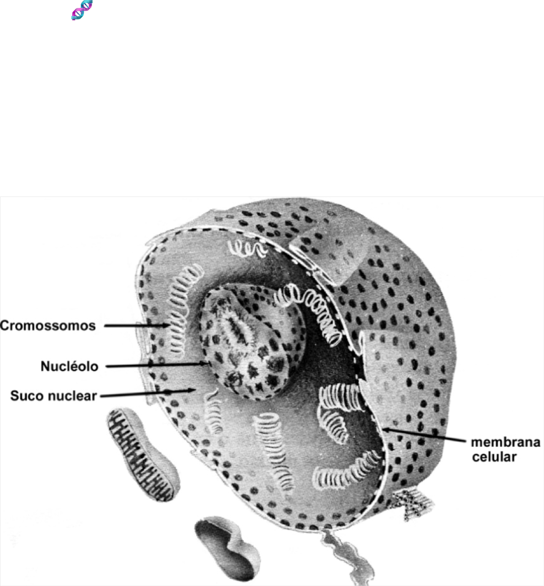 ● ● ● ● biologia ! Considerações Sobre o Núcleo É a estrutura responsável pelo comando de todas as funções celulares Contém os fatores hereditários (cromossomos) Em eucariontes é delimitado pela Membrana Nuclear ou Carioteca Anucleadas = sem núcleo (hemácias) Mononucleadas = 1 núcleo (a maioria das células) Binucleadas = 2 núcleo (Paramecium) Polinucleadas = Vários núcleos (Músculo estriado, Plasmodium) Membrana nuclear Envoltório nuclear Presente em células eucariontes Possui poros (annulli) Nucléolo Corpúsculo arredondado e esponjoso mergulhado no nucleoplasma Não há membrana envolvente Constituição: RNA ribossômico + proteínas ● ● ● Origem: regiões cromossômicas (organizadoras do nucléolo) O DNA dessas regiões origina o RNAr que forma o nucléolo Estruturas do Núcleo ORNAr associa-se a determinadas proteínas e origina o ribossomo O Nucléolo só é visível na intérfase celular O Nucléolo desaparece quando a célula entra em divisão Intérfase = Desespiralizados ou descondensados Composição: DNA + Proteínas HISTONA (Nucleoproteína) Tipos de Cromatina Eucromatina = Menos densa e cora-se pouco Heterocromatina = Mais densa e cora-se bastante Cromossomo •Forma de apresentação do material genético durante a divisão celular ● ● ● ● Classificação dos Cromossomos Quanto a Localização do Centrômero Metacêntrico: O centrômero encontra-se na região média e em conseqüência os braços cromossômicos possuem o mesmo tamanho. Submetacêntrico: O centrômero é encontrado mais próximo à uma das extremidades do segmento cromossômico, que em conseqüência possuem braços com tamanhos diferentes Acrocêntricos: O centrômero localiza-se em posição subterminal do segmento cromossômico, que conseqüentemente possuem braços totalmente diferentes. Telocêntrico: Cromossomos cujo centrômero tem posição terminal, possuindo assim