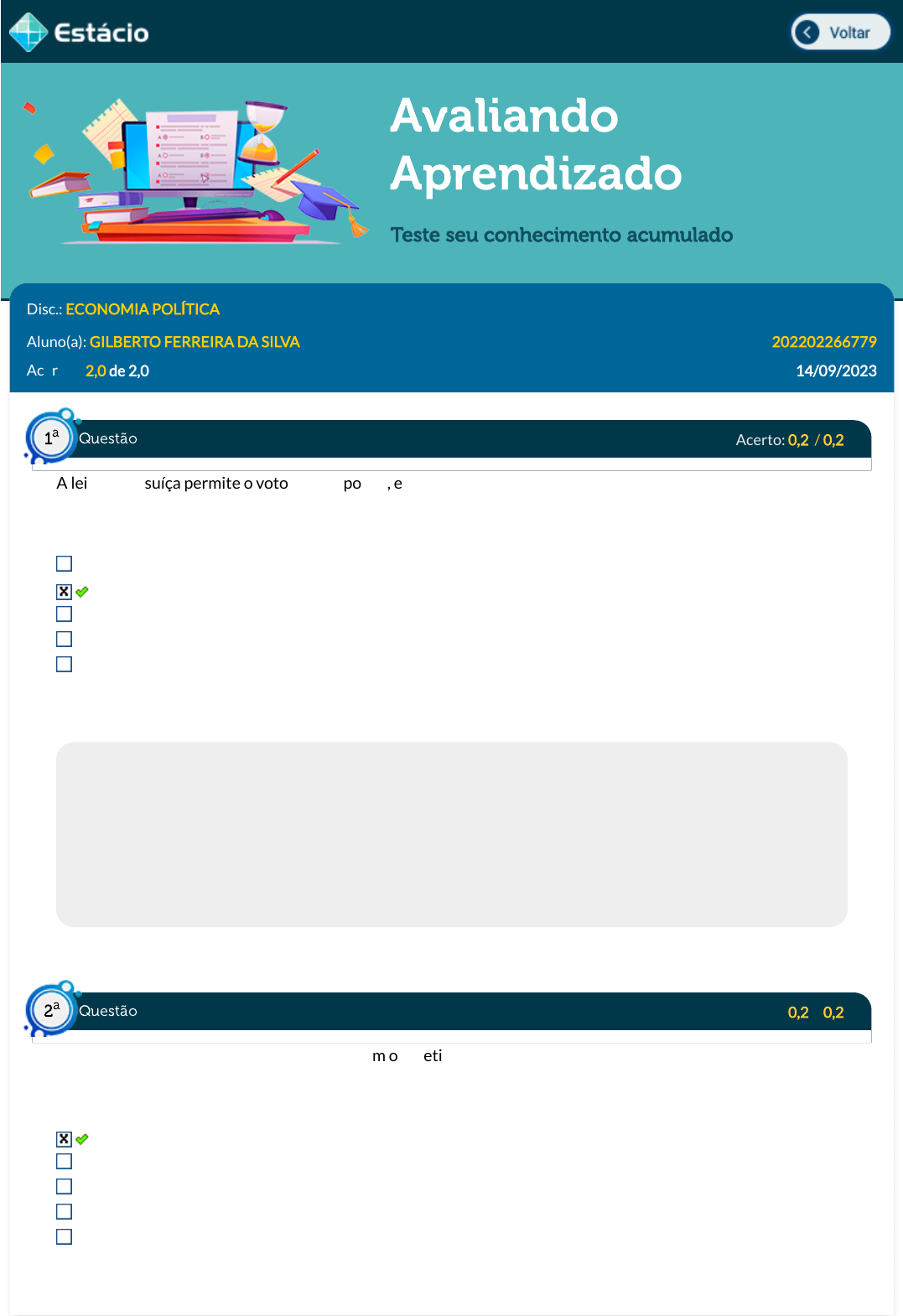 14/09/2023, 15:19 Estácio: Alunos https://simulado.estacio.br/alunos/ 1/6 Avaliando Aprendizado Teste seu conhecimento acumulado Disc.: ECONOMIA POLÍTICA Aluno(a): GILBERTO FERREIRA DA SILVA 202202266779 Acertos: 2,0 de 2,0 14/09/2023 Acerto: 0,2 / 0,2 A lei federal suíça permite o voto por via postal, em todas as eleições federais e referendos, e todos os cantões o permitem para problemas com as cédulas cantonais. Marque a alternativa que justi�ca o estudo realizado por Funk (2010) para os efeitos heterogêneos de participação em cantões com diferentes tamanhos de população. Em cidades menores, há menos postos de correio disponíveis Em cidades menores, o controle social é particularmente forte Em cidades maiores, o controle social é particularmente forte Em cidades maiores, os custos econômicos de votar são maiores por conta das longas �las Em cidades menores, os custos econômicos são menores por conta das menores distâncias Respondido em 14/09/2023 14:45:20 Explicação: A hipótese por trás da estratégia da autora é que estudos antropológicos apontam que o controle social é particularmente forte em comunidades pequenas e estreitas. Nesse sentido, as pessoas se conhecem mais e fofocam sobre quem cumpre seu dever cívico e quem não o faz, aumentando a pressão social nesses locais. As demais alternativas, embora plausíveis, não correspondem à hipótese da autora. FUNK, P. Social incentives and voter turnout: evidence from the swiss mail ballot system. Journal of the European Economic Association, v. 8 n. 5, p. 1077-1103, 2010. Consultado na internet em: 9 nov. 2021. Acerto: 0,2 / 0,2 A economia política desenvolveu modelos com o objetivo de explicar a relação entre desigualdade e redistribuição de renda. Sobre o modelo de Meltzer e Richard, qual a única alternativa que representa violações da segunda previsão do modelo, isto é, que mais demanda por redistribuição implica em mais gastos sociais? Corrupção por parte dos políticos Políticos não se candidatam com uma agenda redistributiva Corrupção por parte da população Os eleitores não expressam suas demandas por redistribuição Políticos demoram para responder às demandas por redistribuição Respondido em 14/09/2023 14:39:05 Questão1 a Questão2 a https://simulado.estacio.br/alunos/inicio.asp javascript:voltar(); 14/09/2023, 15:19 Estácio: Alunos https://simulado.estacio.br/alunos/ 2/6 Explicação: Diferente do que o modelo prevê, mais demanda por redistribuição não necessariamente implica em mais gastos sociais. É possível que fatores institucionais como corrupção por parte de políticos violem a segunda previsão do modelo. As demais alternativas não con�guram como violações da segunda previsão, pois mesmo que ocorressem, a segunda previsão poderia se sustentar. Acerto: 0,2 / 0,2 Bertrand e Mullainathan (2004) conduzem um experimento sobre a economia da discriminação no mercado de trabalho. A respeito desse estudo considere as a�rmativas abaixo. I. Os resultados encontrados indicam que empregadores respondem 50% a mais a currículos de pessoas brancas do que de pessoas negras, dado um mesmo nível de competência dos currículos. II. Os autores estimam que um nome branco proporciona a mesma quantidade de resposta para entrevista que um adicional de 8 anos de experiência para negros. III. Os resultados apontam que viver em um bairro mais rico não afeta as taxas de retorno da entrevista. São verdadeiras apenas as a�rmativas: I III II II e III I e II Respondido em 14/09/2023 15:16:15 Explicação: I é verdadeira. As autoras encontram uma grande diferença racial na resposta aos currículos. Aplicantes com nomes tipicamente brancos precisam mandar por volta de 10 currículos para serem chamados para entrevista, enquanto negros precisam enviar por volta de 15. Esta diferença de 50% é estatisticamente signi�cativa. II é verdadeira. Um nome branco proporciona a mesma quantidade de resposta para entrevista que um adicional de 8 anos de experiência III é falsa. Como as autoras atribuem aleatoriamente os endereços postais dos candidatos aos currículos, é possível estudar o efeito da vizinhança de residência sobre a probabilidade de retorno da chamada. Os resultados apontam que viver em um bairro mais rico (ou mais educado ou mais branco) aumenta as taxas de retorno da entrevista. BERTRAND, M.; MULLAINATHAN, S. Are Emily and Greg more employable than Lakisha and Jamal? A �eld experiment on labor market discrimination. American Economic Review, 2004, 94 (4): 991-1013. Acerto: 0,2 / 0,2 O modelo de agência política incorpora a possibilidade de reeleição se tornando um modelo dinâmico. Dentro desse contexto, analise as a�rmativas abaixo. I. O problema entre principal e agente não é afetado pelo esquema de remuneração do agente. II. Uma maior accountability por parte dos eleitores não leva a resultados mais alinhados com as preferências dos eleitores. III. A relação entre a performance de um político e suas chances de reeleição não dependem apenas das regras formais da democracia, mas também do comportamento e das estratégias de políticos e eleitores. Questão3 a Questão4 a 14/09/2023, 15:19 Estácio: Alunos https://simulado.estacio.br/alunos/ 3/6 São verdadeiras as a�rmativas: Apenas II e III. Apenas I. Apenas I e II. Apenas I e III. Apenas III. Respondido em 14/09/2023 15:12:07 Explicação: I - Como parte do problema entre principal e agente é que a ação que produz o resultado é não observada, condicionar a recompensa do agente com seu resultado produzido é uma forma de reduzir o risco moral, pois o agente terá incentivo de agir corretamente. II - Políticos, quando �scalizados pelos cidadãos, tendem a responder mais às preferências dos eleitores, uma vez que desejam ser reeleitos. III - As regras formais de regimes democráticos não têm como objetivo fazer uma ponte direta entre a performance de um polít