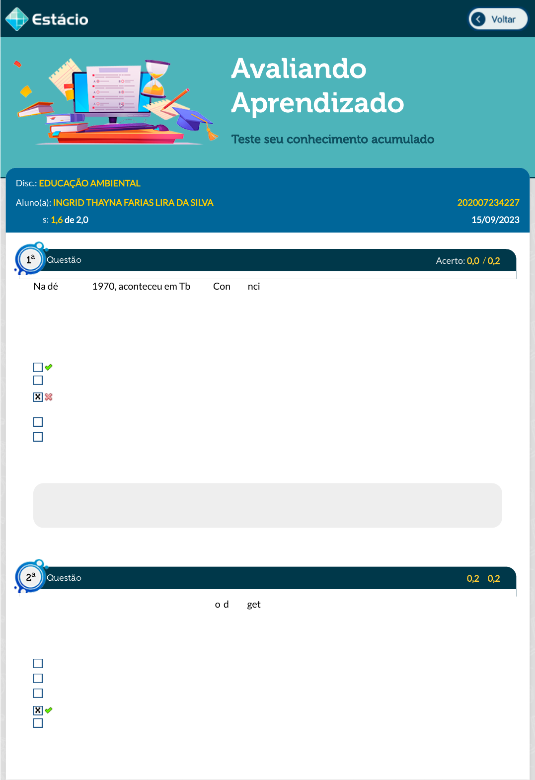 15/09/23, 20:40 Estácio: Alunos https://simulado.estacio.br/alunos/ 1/6 Avaliando Aprendizado Teste seu conhecimento acumulado Disc.: EDUCAÇÃO AMBIENTAL Aluno(a): INGRID THAYNA FARIAS LIRA DA SILVA 202007234227 Acertos: 1,6 de 2,0 15/09/2023 Acerto: 0,0 / 0,2 Na década de 1970, aconteceu em Tbilisi a Conferência Internacional de Educação Ambiental. Nesse evento, foram de�nidos os princípios norteadores da educação ambiental. Qual destas alternativas contém especi�camente alguns dos princípios de�nidos nessa conferência? Formação de cidadão, interdisciplinaridade e visão de totalidade do ambiente. Implantação do Sistema Brasileiro de Informações em Educação Ambiental. Visão de totalidade do ambiente, interdisciplinaridade e implantação do projeto denominado Protetores da vida. Metodologia participativa, interdisciplinaridade e combate ao trabalho escravo. Agricultura sustentável, gestão dos recursos naturais e redução das desigualdades sociais. Respondido em 15/09/2023 20:26:23 Explicação: Formação de cidadão, interdisciplinaridade e visão de totalidade do ambiente. Acerto: 0,2 / 0,2 A utilização de agroquímicos para o cultivo de vegetais com �ns alimentícios é uma realidade cada vez mais crescente no Brasil. Apesar dos agroquímicos resultarem em ganhos na produção e na consequente redução dos preços desses produtos para a população que os consome, existem impactos ambientais eminentes. A partir do exposto, escolha a opção que representa um dos males dos agrotóxicos para o meio ambiente. Poluição sonora. Atração de animais selvagem em busca de alimento. Redução de chuvas. Contaminação do lençol freático. Erosão do solo. Respondido em 15/09/2023 20:28:10 Questão1 a Questão2 a https://simulado.estacio.br/alunos/inicio.asp javascript:voltar(); 15/09/23, 20:40 Estácio: Alunos https://simulado.estacio.br/alunos/ 2/6 Explicação: Dentre os danos ambientais ocasionados pela utilização de agrotóxicos, a contaminação do lençol freático é um dos mais perigosos. Esse dano é silencioso e só é sentido muito tempo após a utilização da substância. Tal problemática se agrava pelo fato de o lençol freático ser um recurso natural compartilhado por vários seres humanos, e o consumo desses agroquímicos pela água contaminada pode causas diversas doenças. Todas as outras alternativas são impactos ambientais referentes a outras atividades humanas e não estão diretamente relacionadas com o uso de agrotóxico. Acerto: 0,2 / 0,2 Para a uma gestão comunitária saudável, os governos devem incentivar politicamente e/ou �nanceiramente outras camadas da sociedade. Desta forma, assinale verdadeiro (V) ou falso para medidas que devem ser adotadas por governos no incentivo da participação de populações indígenas na Gestão Comunitária do Meio Ambiente: I. Reconhecer e proteger terras indígenas. II. Reconhecer tradições culturais e conhecimento tradicional associado. III. Apoiar meios de produção sustentáveis. IV. Reconhecer a "soberania" de uso das terras e recursos naturais de forma sustentável. Marque a alternativa que apresenta a sequência correta. F-F-F-V F-F-F-F V-F-V-F F-V-F-V V-V-V-V Respondido em 15/09/2023 20:29:11 Explicação: Segundo a Agenda 21, governos de países e/ou provinciais deverão: (1) adotar políticas públicas referentes às terras e tradições indígenas; (2) reconhecer suas terras e as e protejam de quaisquer atividades ambientalmente incorretas; (3) reconhecer as tradições culturais e conhecimentos tradicionais na implementação de manejo ambiental destas regiões; (4) reconhecer a dependência de utilização dos recursos naturais de forma sustentável; (5) fortalecer mecanismos para solução de problemas relacionados ao manejo de terras; (6) apoiar meios de produção sustentáveis; (7) promover e intensi�car o intercambio de conhecimentos e experiências de manejo sobre o uso das terras e recursos naturais; entre outros. Desta forma, todas as frases são verdadeiras. Acerto: 0,0 / 0,2 (FUNDE/MG/2019 - adaptada) A Educação Ambiental compreende os processos por meio dos quais o indivíduo e a coletividade constroem valores sociais, habilidades e conhecimentos relacionados com a preservação ambiental e o desenvolvimento sustentável, sempre considerando a qualidade da vida humana, e deverá sempre �car vinculada aos processos de ensino e aprendizagem nas escolas. A partir do contexto acerca dos princípios básicos da Educação Ambiental avalie as seguintes a�rmativas: I- A educação ambiental deve garantir a continuidade e permanência do processo educativo. II- A educação ambiental possui como princípios o enfoque humanista, holístico, democrático e participativo. Questão3 a Questão4 a 15/09/23, 20:40 Estácio: Alunos https://simulado.estacio.br/alunos/ 3/6 III- A educação ambiental prediz um vínculo entre a ética, a educação, o trabalho e as práticas sociais. Assinale as alternativas que apresenta a(s) a�rmativa(s) correta(s). Apenas a II Apenas a III II e III I e II I, II e III Respondido em 15/09/2023 20:30:50 Explicação: O controle sob a manipulação dos problemas ambientais nos currículos escolares não é previsto dentre os princípios básicos da Educação Ambiental. Segundo a lei federal 9.795 Art.1º, são princípios básicos da educação ambiental: I- o enfoque humanista, holístico, democrático e participativo; II - a concepção do meio ambiente em sua totalidade, considerando a interdependência entre o meio natural, o socioeconômico e o cultural, sob o enfoque da sustentabilidade; III - o pluralismo de ideias e concepções pedagógicas, na perspectiva da inter, multi e transdisciplinaridade; IV - a vinculação entre a ética, a educação, o trabalho e as práticas sociais; V - a garantia de continuidade e permanência do processo educativo; VI - a permanente avaliação crítica do processo educativo; VII - a abordage