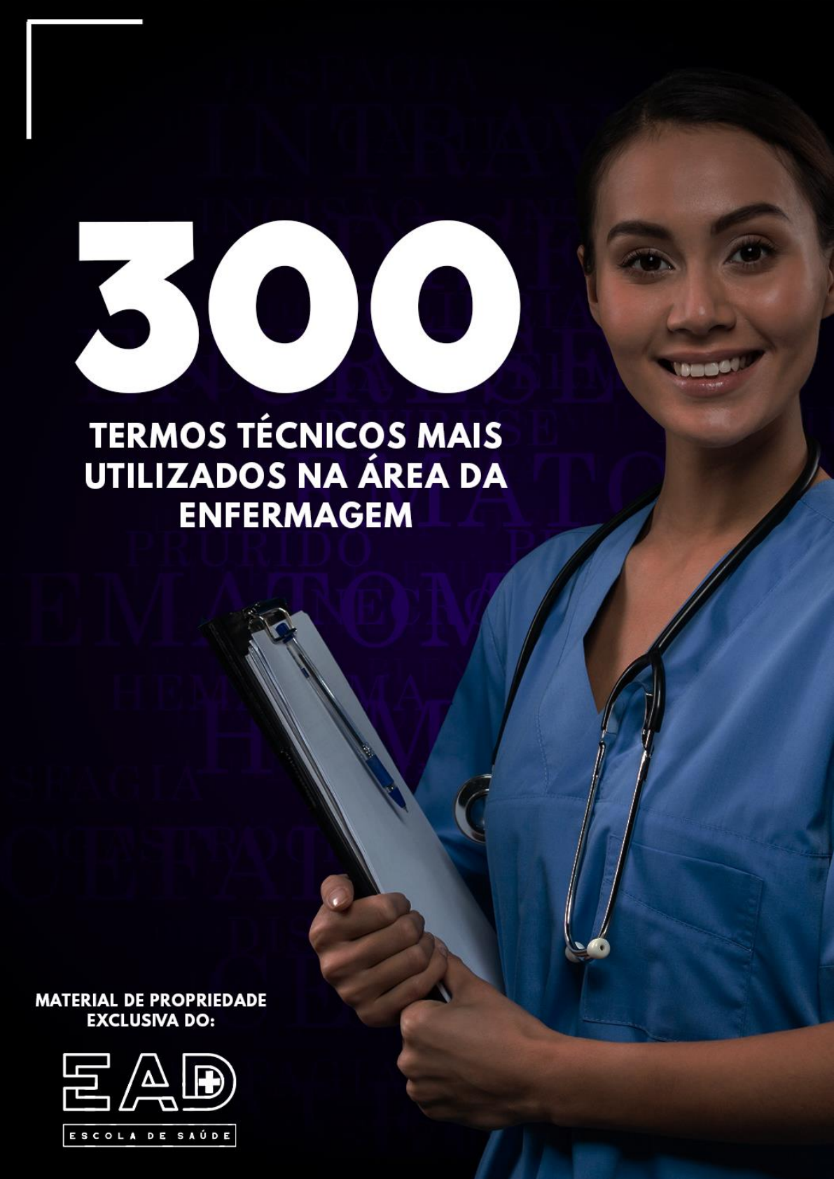 Este material foi produzido pela equipe do Enfermagem a Distância (o maior portal de atualização para Enfermagem da América Latina) com o objetivo de facilitar a compreensão, bem como esclarecer e simplificar os 300 termos mais utilizados dentro da Enfermagem. Esperamos que este material possa auxiliar estudantes e profissionais da enfermagem dentro das suas rotinas profissionais ou acadêmicas, de modo que possa ser consultado sempre que necessário. Abcesso: coleção de pus em cavidade anormal. Acrocórdons: também chamados de “pólipos cutâneos”, são crescimentos exagerados da pele normal que formam uma haste e são parecidos com pólipos. Afagia: impossibilidade de deglutir. Afasia: perda da palavra falada, escrita ou mímica, por alterações nos centros nervosos. Afonia: perda ou diminuição da voz por causas locais. Afecção: estado mórbido, enfermidade. Algesia: sensibilidade à dor. Algia: dor de origem subjetiva, sem lesão anatômica ou orgânica apreciável. Álgico: relativo à dor, doloroso. Analgesia: perda da sensibilidade para a dor, conservando a sensibilidade tátil. Alodinia: dor de estímulo que normalmente não provoca dor. Amaurose: cegueira. Amenorreia: ausência de menstruação. Analgesia: sensação de dor ausente. Anasarca: edema bilateral ou edema generalizado. Anciloglossia: encurtamento do frênulo da língua. Anestesia: ausência de sensibilidade tátil. Anisocoria: tamanho desigual das pupilas. Anorexia: perda do apetite. Anosmia: perda do olfato. Anóxia: estado que resulta da insuficiência de oxigênio para satisfazer as necessidades normais dos tecidos. Antissepsia: conjunto de meios destinados a afastar ou destruir os germes patogênicos e impedir infecção. Anúria: ausência de diurese. Apatia: falta de sentimento ou interesse, indiferença, insensibilidade. Apirexia: falta de febre, cessação da febre. Apneia: ausência de movimentos ventilatórios. Aproctia: Ausência ou imperfuração do orifício anal. Arritmia: irregularidade do ritmo cardíaco (número, intervalo e força das batidas). Arsenicismo: Envenenamento crônico pelo arsênio. Arterectomia: Extirpação de um segmento de artéria. Ascite: acúmulo anormal de líquidos dentro da cavidade peritoneal. Assepsia: conjunto de procedimentos que visam impedir a introdução de germes patogênicos em determinado organismo, ambiente e objetos Astenia: caracterizada por uma sensação generalizada de debilidade e falta de vitalidade, que se sente tanto a nível físico como intelectual (fadiga). Atresia: ausência ou fechamento do canal auditivo. Atrofia: perda de massa muscular. Bacteremia: presença de bactérias patogênicas no sangue. Bacteriófago: vírus que pode provocar a destruição das bactérias. Baqueteamento digital: conhecido também por unhas em “vidro de relógio” ou “hipocráticas”. Ocorre quando o ângulo do leito ungueal é maior que 180º. Comum em doenças que comprometem a circulação pulmonar. Binaural: com os dois ouvidos. Bípara: mulher que já ter dois partos. Blefarite: inflamação das pálpebras. Bócio: aumento de volume crônico da tireoide que ocorre em algumas regiões do mundo com dieta pobre em iodo. Bradicardia: pulsação lenta do coração (abaixo de 60bpm). Bradipnéia: respiração lenta. – Frequência ventilatória diminuída (< 12 rpm no adulto). Bradisfigmia: lentidão anormal do pulso. Broncoespasmo: espasmo dos músculos bronquiais. Caquexia: estado mórbido caracterizado por magreza extrema, perda de peso, sintomas de debilidade e anemia. Calázio: nódulo arredondado e saliente na pálpebra. É uma infecção ou um cisto de retenção da glândula de meibômio. Cefaléia: dor de cabeça intensa e douradora. Celulite: inflamação de tecido conjuntivo subcutâneo frouxo. Cianose: está relacionada à cor arroxeada da pele que significa diminuição da perfusão. Cistite: inflamação da bexiga. Cisto: cavidade encapsulada cheia de líquido na derme ou na camada subcutânea, elevando a pele sob tensão. Clister: enema, injeção de líquido no intestino, pelo ânus. Cloasma: é uma área acastanhada irregular de hiperpigmentação na face. Coiloníquia: unha em forma de colher. Coitarca: idade da primeira atividade sexual. Conjuntivite: inflamação da conjuntiva. Coma: estado de estupor profundo com perda total ou quase total da consciência, da sensibilidade e da motilidade voluntária. Consciência: estado geral que nos torna aptos a julgar, refletir e decidir. Costotomia: ressecção das costelas. Cricóide: em forma de anel. Cricotomia: incisão da cricóide. Criestesia: sensibilidade anormal do frio. Criopricipitado: fator do sangue para tratamento da hemofilia. Criptoquirdia: testículos não descidos. Cureta: instrumento em forma de colher para raspagem ou curetagem. Dacriocistite: inflamação do saco lacrimal. Desorientação: estado de confusão mental em que o indivíduo perde as noções de lugar e tempo. Diplegia: paralisia de partes similares nos dois lados do corpo. Paralisia bilateral. Diplopia: visão dupla dos objetos devido aos transtornos da coordenação dos músculos motores oculares. Disartria: dificuldade de formar palavras. Disfagia: deglutição dificultosa. Disfasia: dificuldade da compreensão ou expressão da linguagem. Dislalia: é um distúrbio da fala, caracterizado pela dificuldade em articular as palavras. Basicamente consiste na má pronúncia das palavras, seja omitindo ou acrescentando fonemas, trocando um fonema por outro ou ainda distorcendo-os ordenadamente. Dismenorreia: cólica menstrual. Dismetria: incapacidade controlar a distância, a força e a velocidade de uma ação muscular. Dispepsia: indigestão; dificuldade de digestão. Dispneia: falta de ar ou respiração laboriosa, dificultosa. Dissolvente: que dissolve outra substância. Distal: distante do corpo. Disúria: dor ou queimação ao urinar. Diurese: eliminação de urina. Dorsal: referente a dorso, costas. Dorsalgia