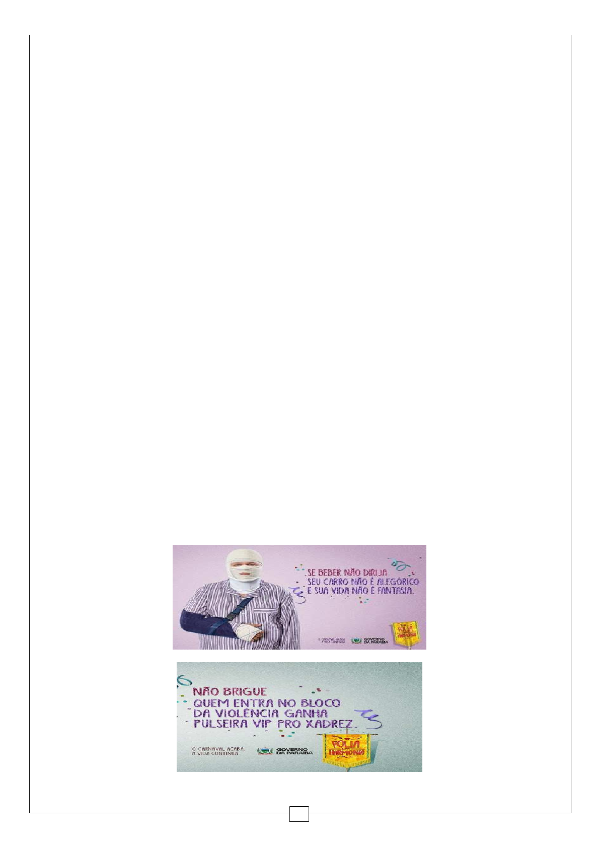 1 Português Canção amiga Eu preparo uma canção, em que minha mãe se reconheça todas as mães se reconheçam e que fale como dois olhos. [...] Aprendi novas palavras E tornei outras mais belas. Eu preparo uma canção que faça acordar os homens e adormecer as crianças. ANDRADE, C. D. Novos Poemas. Rio de Janeiro: José Olympio, 1948. (fragmento) QUESTÃO 01. Quais funções da linguagem podem ser identificadas no texto acima? ____________________________________________________________________________________________ ____________________________________________________________________________________________ ____________________________________________________________________________________________ ____________________________________________________________________________________________ ____________________________________________________________________________________________ Uma estratégia frequentemente adotada pelas agências de propaganda é a elaboração de campanhas publicitárias. Trata-se de um conjunto de anúncios de um mesmo anunciante que, preservando a identidade temática, tem o objetivo de prolongar e aumentar o impacto da mensagem veiculada. Analise a campanha do governo da Paraíba reproduzida a seguir para responder às questões que seguem. Anúncio I Anúncio II 2 QUESTÃO 02. As escolhas lexicais do Anúncio I remetem a dois elementos culturais que caracterizam o carnaval: carro alegórico e fantasia. Considerando que, no segundo período, eles constituem argumentos contra a combinação de álcool e direção, que traços de sentido de carro alegórico e de fantasia não devem ser associados aos substantivos carro e vida, conforme o enunciado? ____________________________________________________________________________________________ ____________________________________________________________________________________________ ____________________________________________________________________________________________ ____________________________________________________________________________________________ ____________________________________________________________________________________________ QUESTÃO 03. O Anúncio II também faz menção a um elemento característico de muitos carnavais, a pulseira VIP. Entretanto, o sentido dessa expressão é alterado pelo contexto da publicidade. Identifique os recursos verbais e os não verbais que geram essa alteração semântica. ____________________________________________________________________________________________ ____________________________________________________________________________________________ ____________________________________________________________________________________________ ____________________________________________________________________________________________ ____________________________________________________________________________________________ QUESTÃO 04. Leia o anúncio a seguir Explique que relação de sentido há entre os termos aperfeiçoamento e perfeição na construção da mensagem publicitária. ____________________________________________________________________________________________ ____________________________________________________________________________________________ ____________________________________________________________________________________________ ____________________________________________________________________________________________ ____________________________________________________________________________________________ INSTRUÇÃO: Leia o post a seguir, publicado na página do Ministério da Justiça em uma rede social e, em seguida, responda às questões. 3 QUESTÃO 05. A ideia principal do texto que compõe a propaganda é a defesa de que a imigração está no sangue dos brasileiros. Considerando que se trata de uma mensagem oficial do Ministério da Justiça, qual seria a intenção mais ampla dessa peça publicitária? ____________________________________________________________________________________________ ____________________________________________________________________________________________ ____________________________________________________________________________________________ ____________________________________________________________________________________________ ____________________________________________________________________________________________ QUESTÃO 06. Para tratar do tema da imigração, a propaganda se vale de uma frase em discurso direto e da imagem de um jovem, identificado com nome e idade. Explique o valor do emprego desses elementos como recurso argumentativo do texto. ____________________________________________________________________________________________ ____________________________________________________________________________________________ ____________________________________________________________________________________________ ____________________________________________________________________________________________ ____________________________________________________________________________________________ QUESTÃO 07. Essa publicidade recebeu uma enxurrada de críticas nas redes sociais quando foi publicada, porque o termo imigração abrandaria parte da história nacional e sua relação com outros povos que por aqui aportaram. Explique por que, apesar de tratar de imigração mais recente, a propaganda dá margem para essa interpretação eufemista do passado brasileiro. ____________________________________________________________________________________________ ____________________________________________________________________________________________ ____________________________________________________________________________________________ ____________________________________________________________________________________________ Retirada de www.eitapiula.net/2009/09/aurelio.jpg Nessa propaganda do dicionário Aurélio, a expressão “bom p