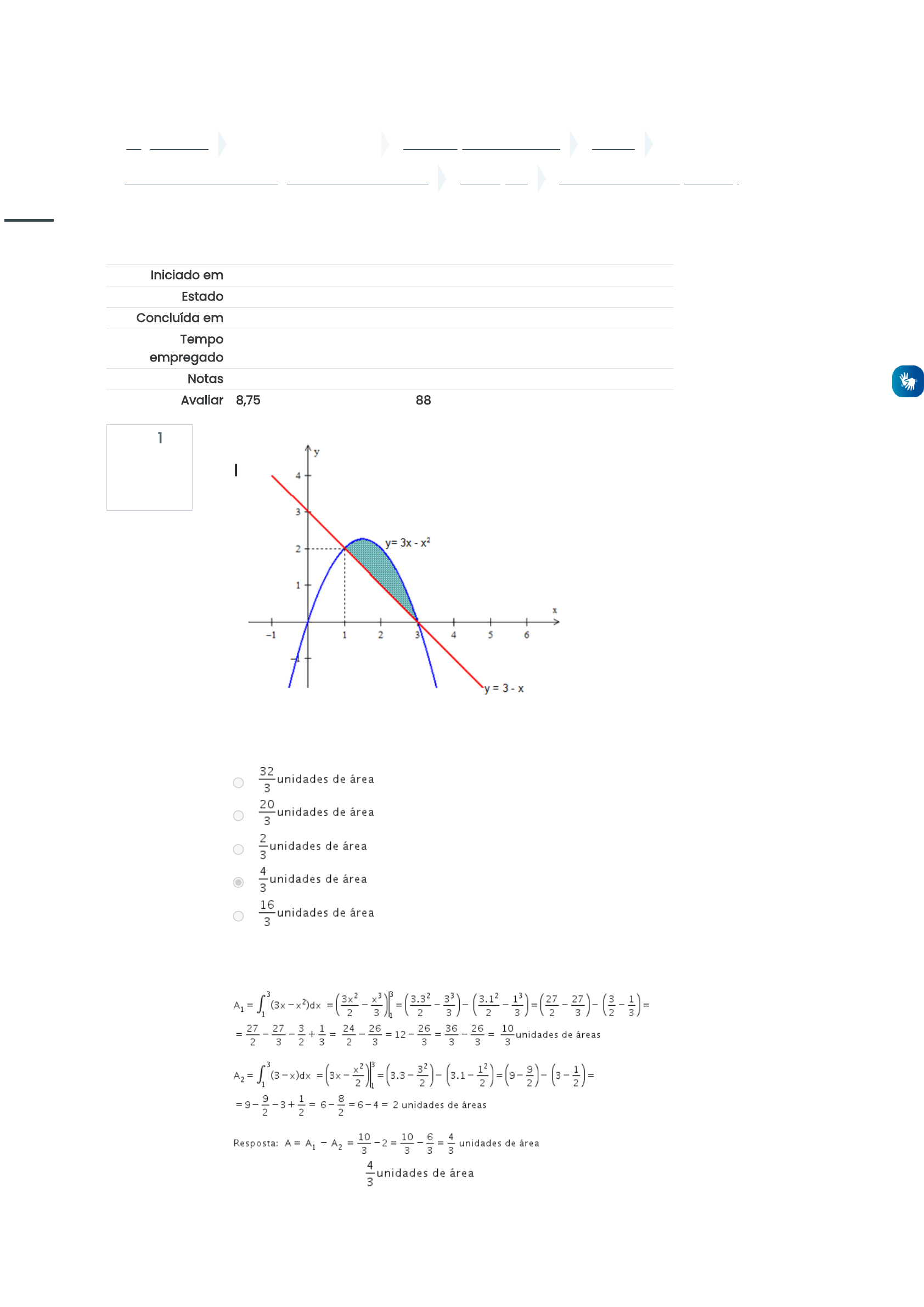 ... Página inicial Disciplinas e Espaços GRADUAÇÃO A DISTÂNCIA 2022-3 Cálculo Diferencial e Integral II - 2022_03_EAD_A Avaliações P1 -- Prova On-line (Acessar) Questão 1 Correto Atingiu 1,00 de 1,00 Iniciado em domingo, 11 set 2022, 21:37 Estado Finalizada Concluída em domingo, 11 set 2022, 22:17 Tempo empregado 40 minutos 53 segundos Notas 7,00/8,00 Avaliar 8,75 de um máximo de 10,00(88%) A área da região sombreada na figura acima é igual a: Escolha uma opção: Sua resposta está correta. A resposta correta é: https://ava.candidomendes.edu.br/moodle/ https://ava.candidomendes.edu.br/moodle/course/index.php?categoryid=8 https://ava.candidomendes.edu.br/moodle/course/index.php?categoryid=122 https://ava.candidomendes.edu.br/moodle/course/view.php?id=10500 https://ava.candidomendes.edu.br/moodle/course/view.php?id=10500§ion=4 https://ava.candidomendes.edu.br/moodle/mod/quiz/view.php?id=330766 javascript:void(0); https://ava.candidomendes.edu.br/moodle/user/index.php?id=10500 https://ava.candidomendes.edu.br/moodle/course/view.php?id=10500&stopjsnav=1 https://ava.candidomendes.edu.br/moodle/course/view.php?id=10500&datapref=1 https://ava.candidomendes.edu.br/moodle/ https://ava.candidomendes.edu.br/moodle/my/ https://ava.candidomendes.edu.br/moodle/course/view.php?id=10500 https://ava.candidomendes.edu.br/moodle/course/view.php?id=10509 https://ava.candidomendes.edu.br/moodle/course/view.php?id=10518 https://ava.candidomendes.edu.br/moodle/course/view.php?id=396 https://ava.candidomendes.edu.br/moodle/course/view.php?id=892 javascript:void(0); Questão 2 Correto Atingiu 1,00 de 1,00 Questão 3 Correto Atingiu 1,00 de 1,00 O volume do sólido de revolução gerado pela rotação, em torno do eixo x, da região sombreada na figura abaixo é: Escolha uma opção: Sua resposta está correta. A resposta correta é: Uma partícula move-se em linha reta e sua velocidade, em metros por segundo, no instante t é dada por v(t) = 2t - 5. Sabendo que s(t) é a posição da partícula no instante t e que s(1) = 2, é correto afirmar que a posição da partícula para t = 1,5s é de: Escolha uma opção: 1m 5,25m 3,25m 2,5m 0,75m Sua resposta está correta. A resposta correta é: 0,75m javascript:void(0); https://ava.candidomendes.edu.br/moodle/user/index.php?id=10500 https://ava.candidomendes.edu.br/moodle/course/view.php?id=10500&stopjsnav=1 https://ava.candidomendes.edu.br/moodle/course/view.php?id=10500&datapref=1 https://ava.candidomendes.edu.br/moodle/ https://ava.candidomendes.edu.br/moodle/my/ https://ava.candidomendes.edu.br/moodle/course/view.php?id=10500 https://ava.candidomendes.edu.br/moodle/course/view.php?id=10509 https://ava.candidomendes.edu.br/moodle/course/view.php?id=10518 https://ava.candidomendes.edu.br/moodle/course/view.php?id=396 https://ava.candidomendes.edu.br/moodle/course/view.php?id=892 javascript:void(0); Questão 4 Correto Atingiu 1,00 de 1,00 O volume do sólido de revolução gerado pela rotação, em torno do eixo y, da região sombreada na figura abaixo é: Escolha uma opção: Sua resposta está correta. A resposta correta é: javascript:void(0); https://ava.candidomendes.edu.br/moodle/user/index.php?id=10500 https://ava.candidomendes.edu.br/moodle/course/view.php?id=10500&stopjsnav=1 https://ava.candidomendes.edu.br/moodle/course/view.php?id=10500&datapref=1 https://ava.candidomendes.edu.br/moodle/ https://ava.candidomendes.edu.br/moodle/my/ https://ava.candidomendes.edu.br/moodle/course/view.php?id=10500 https://ava.candidomendes.edu.br/moodle/course/view.php?id=10509 https://ava.candidomendes.edu.br/moodle/course/view.php?id=10518 https://ava.candidomendes.edu.br/moodle/course/view.php?id=396 https://ava.candidomendes.edu.br/moodle/course/view.php?id=892 javascript:void(0); Questão 5 Correto Atingiu 1,00 de 1,00 Questão 6 Correto Atingiu 1,00 de 1,00 Escolha uma opção: Sua resposta está correta. A resposta correta é: Escolha uma opção: 16 2 8 Sua resposta está correta. A resposta correta é: 2 javascript:void(0); https://ava.candidomendes.edu.br/moodle/user/index.php?id=10500 https://ava.candidomendes.edu.br/moodle/course/view.php?id=10500&stopjsnav=1 https://ava.candidomendes.edu.br/moodle/course/view.php?id=10500&datapref=1 https://ava.candidomendes.edu.br/moodle/ https://ava.candidomendes.edu.br/moodle/my/ https://ava.candidomendes.edu.br/moodle/course/view.php?id=10500 https://ava.candidomendes.edu.br/moodle/course/view.php?id=10509 https://ava.candidomendes.edu.br/moodle/course/view.php?id=10518 https://ava.candidomendes.edu.br/moodle/course/view.php?id=396 https://ava.candidomendes.edu.br/moodle/course/view.php?id=892 javascript:void(0); Questão 7 Correto Atingiu 1,00 de 1,00 Escolha uma opção: Sua resposta está correta. As respostas corretas são: , , , , javascript:void(0); https://ava.candidomendes.edu.br/moodle/user/index.php?id=10500 https://ava.candidomendes.edu.br/moodle/course/view.php?id=10500&stopjsnav=1 https://ava.candidomendes.edu.br/moodle/course/view.php?id=10500&datapref=1 https://ava.candidomendes.edu.br/moodle/ https://ava.candidomendes.edu.br/moodle/my/ https://ava.candidomendes.edu.br/moodle/course/view.php?id=10500 https://ava.candidomendes.edu.br/moodle/course/view.php?id=10509 https://ava.candidomendes.edu.br/moodle/course/view.php?id=10518 https://ava.candidomendes.edu.br/moodle/course/view.php?id=396 https://ava.candidomendes.edu.br/moodle/course/view.php?id=892 javascript:void(0); Questão 8 Incorreto Atingiu 0,00 de 1,00 Escolha uma opção: Sua resposta está incorreta. A resposta correta é: javascript:void(0); https://ava.candidomendes.edu.br/moodle/user/index.php?id=10500 https://ava.candidomendes.edu.br/moodle/course/view.php?id=10500&stopjsnav=1 https://ava.candidomendes.edu.br/moodle/course/view.php?id=10500&datapref=1 https://ava.candidomendes.edu.br/moodle/ https://ava.candidomendes.edu.br/moodle/my/ https://ava.candidomendes.edu.br/moodle/course/view.php?id=10500 https://ava.candidomendes.edu