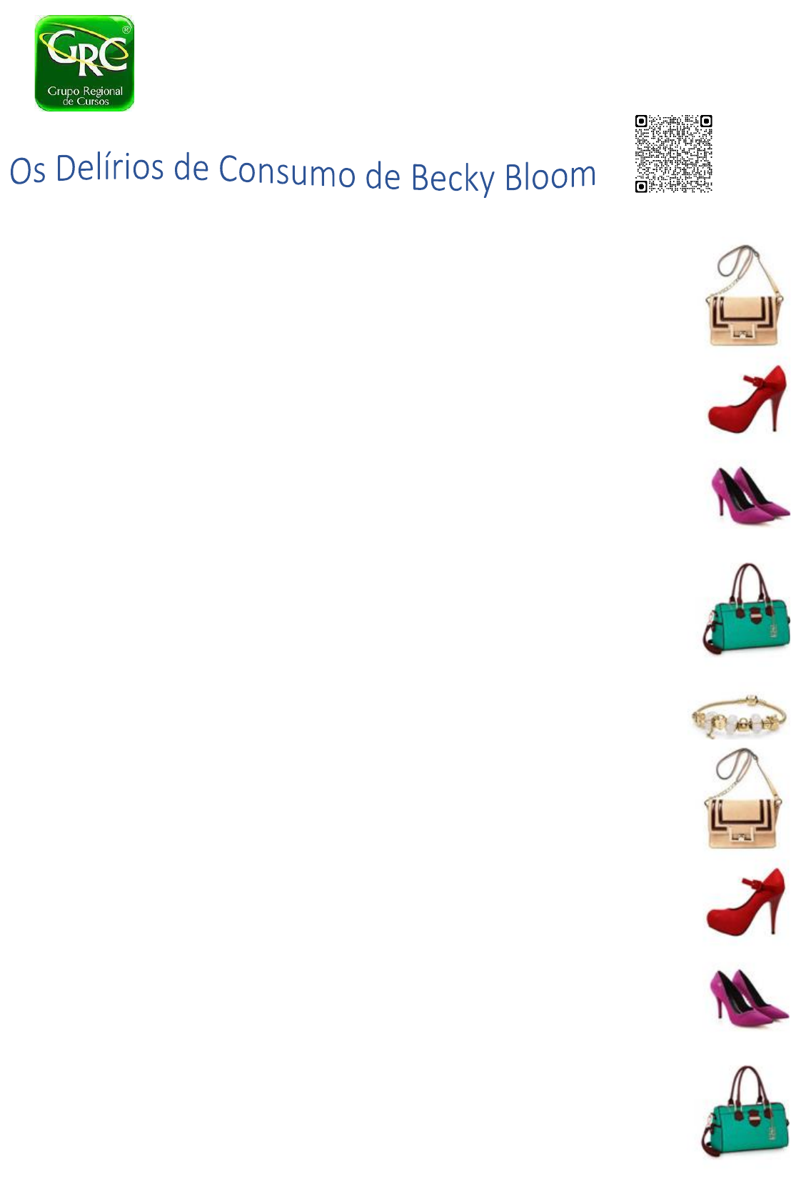 1.Este filme faz o alerta sobre diferentes tipos de persuasão que encontramos no nosso cotidiano. Quais são os meios de publicidade e estratégias mais utilizadas para nos convencer a gastar sempre mais? Faça uma pesquisa. 2. Qual é o alerta que esse longa transmite? Quais cuidados devemos ter dentro de uma sociedade tão consumista como a nossa? 3. Rebecca Bloomwood (Isla Fisher), é uma jovem jornalista que não consegue se controlar nas compras. Seus sete cartões de crédito são insuficientes para que ela compre as roupas que deseja adquirir. Seu quarto se parece com um provador de loja, inundado de peças, sapatos, bolsas, acessórios espalhados, e ela não se cansa de comprar mais. Você já passou ou passa por essa situação? Se Rebecca fosse uma pessoa próxima e íntima de você, qual atitude tomaria para ajudá-la a se controlar? Comente. 4.Porque o artigo que Rebecca escreveu para a revista de finanças, fez tanto sucesso entre as mulheres? 5.Comente sobre o poder persuasivo apresentado no filme, qual é o meio que os lojistas utilizam para convencer Rebecca a comprar sem medidas? 6.Você concorda que a propaganda é a alma do negócio? 7.Comente sobre a cena do filme que você mais gostou. 8.Após refletir sobre o filme e sobre sua vida de “consumo”, comente em qual cena você se enquadra melhor? Por quê? GRC – Grupo Regional de Cursos Aluno: ______________________________________________________________ Turma: ______ Dia da semana: _______________________________________