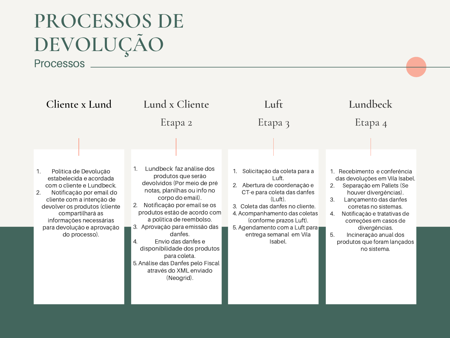 Etapa 1 Politica de Devolução estabelecida e acordada com o cliente e Lundbeck. Notificação por email do cliente com a intenção de devolver os produtos (cliente compartilhará as informações necessárias para devolução e aprovação do processo). 1. 2. Lundbeck faz análise dos produtos que serão devolvidos (Por meio de pré notas, planilhas ou info no corpo do email). Notificação por email se os produtos estão de acordo com a politica de reembolso. Aprovação para emissão das danfes. Envio das danfes e disponibilidade dos produtos para coleta. Análise das Danfes pelo Fiscal através do XML enviado (Neogrid). 1. 2. 3. 4. 5. Etapa 2 Etapa 3 Etapa 4 Solicitação da coleta para a Luft. Abertura de coordenação e CT-e para coleta das danfes (Luft). Coleta das danfes no cliente. Acompanhamento das coletas (conforme prazos Luft). Agendamento com a Luft para entrega semanal em Vila Isabel. 1. 2. 3. 4. 5. Processos Recebimento e conferência das devoluções em Vila Isabel. Separação em Pallets (Se houver divergências). Lançamento das danfes corretas no sistemas. Notificação e tratativas de correções em casos de divergências. Incineração anual dos produtos que foram lançados no sistema. 1. 2. 3. 4. 5. PROCESSOS DE DEVOLUÇÃO Cliente x Lund Lund x Cliente Luft Lundbeck FLUXO DEVOLUÇÃO Retorno ao cliente Incineração Notificação da Devolução Não Reembolsável Simplificado Lançamento das danfes no sistema Danfes e/ou fisicos com divergências Coleta dos produtos Sim Reembolsável Danfes e fisicos corretos Recebimento e conferência Danfes Corrigidas Notificação e tratativas com o cliente Cliente Lundbeck Luft Análise e retorno ao cliente dos Vencidos Não Reembolsável Sim Reembolsável Emissão das Danfes Solicitação das coletas Coletas dos produtos nos clientes e entrega em Vila Isabel Análise das Danfes pelo Fiscal Recebimento semanal em Vla Isabel Sim Divergência Não Divergência Correção das Danfes Lançamento das Danfes no sistema Incineração anual dos Produtos FLUXOGRAMA DEVOLUÇÃO Processo de pagamento de Vencidos Notificação dos vencidos (produto, Lote, Validade Qtd, NFO) Retorno no ato da entrega Trocas de emails com o cliente Envio de nova NFD e solicitação de coleta/reembolso Solicitação de ionformações e cancelamento de NFD