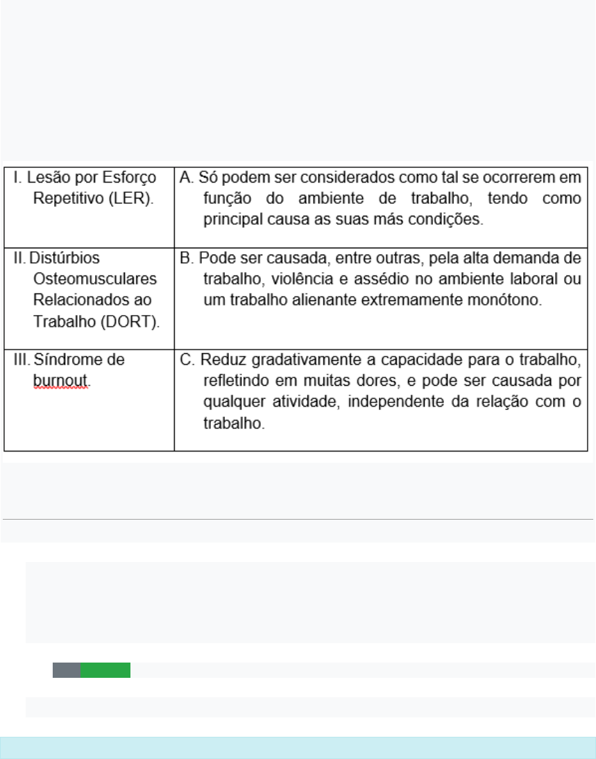 VENDO PROVA NOTA 10 -ERGONOMIA ANHANGUERA - Engenharia de Segurança do Trabalho R$ 10,00 WHATSAPP – 84 996671906 1) A maioria das pessoas passa a maior parte do dia trabalhando, por isso o ambiente de trabalho pode resultar em diversos problemas para a saúde do trabalhador. Tais doenças podem ser resultado de diversos fatores, por exemplo, a empresa não ter as condições físicas adequadas para realizar as atividades, nem possuir equipamentos de proteção e medidas de prevenção. Pensando nisso, leia e associe as duas colunas, conforme as doenças e os seus conceitos: Assinale a alternativa que traz a associação correta entre as duas colunas: Alternativas: • I – B; II – C; III – A. • I – C; II – B; III – A. • I – A; II – B; III – C. • I – C; II – A; III – B. checkCORRETO • I – A; II – C; III – B. Resolução comentada: Lesão por Esforço Repetitivo (LER) reduz gradativamente a capacidade para o trabalho, refletindo em muitas dores, e pode ser causada por qualquer atividade, independente da relação com o trabalho. Distúrbios Osteomusculares Relacionados ao Trabalho (DORT) só podem ser considerados como tal se ocorrerem em função do ambiente de trabalho, tendo como a principal causa as suas más condições. A síndrome de burnout pode ser causada, entre outras, pela alta demanda de trabalho, violência e assédio no ambiente laboral ou um trabalho alienante extremamente monótono. Código da questão: 65604 2) Há duas dimensões em relação ao__________: pode ser fonte de dimensões significativas ou pode ________ a percepção das informações significativas para o trabalhador. Em razão disso, uma inserção errada pode comprometer a confiabilidade das __________ . Por outro lado, a exposição ao ruído pode causar, entre outros, _____________ e/ou deterioração do aparelho auditivo. Assinale a alternativa que completa adequadamente as lacunas: Alternativas: • Calor; facilitar; informações; surdez. • Tempo; combater; medidas; náusea. • Ruído; dificultar; informações; fadiga auditiva. checkCORRETO • Frio; dificultar; ações; fadiga auditiva. • Ruído; amenizar; sugestões; tontura. Resolução comentada: o ruído pode ser fonte de dimensões significativas ou prejudicar a percepção dessas dimensões. O ergonomista deve compreender de qual ruído está diante para propor a solução ergonômica. Código da questão: 65608 3) No desempenho de sua atividade, e influenciados pelos diversos componentes, os trabalhadores se deparam com situações que podem desfavorecer sua integridade física e psíquica. Leia e associe as duas colunas de acordo com movimentos e lesões que podem surgir: Assinale a alternativa que traz a associação correta entre as duas colunas: Alternativas: • I – A; II – B; III – C. • I – A; II – C; III – B. • I – B; II – A; III – C. • I – C; II – B; III – A. • I – C; II – A; III – B. checkCORRETO Resolução comentada: a repetitividade está comumente relacionada às doenças osteomusculares dentro do espectro das LER e DORT. Já o levantamento inadequado de cargas pode causar lesões sérias, tais como a síndrome do interóssio anterior, síndrome do pronador redondo (que são neuropatias dos braços) e/ou tendinites (inflamações nos nervos e tendões). Por fim, as posturas inadequadas podem causar lesões em diversos locais, sendo mais comuns no abdômen, na lombar, coluna e nos ombros, o que pode favorecer uma possível fadiga muscular. Código da questão: 65610 4) Apesar da grande evolução legislativa em garantir a diminuição de riscos ocupacionais, por meio das normas regulamentares e do evidente resultado em números dessa evolução, temos ainda um número expressivo de trabalhadores afastados por incapacidade e doenças decorrentes do trabalho. Um dos exemplos de agente causador de doenças ocupacionais e sua correta relação são: Alternativas: • Agentes biológicos, como poeiras, fumos, névoas, neblinas, agrotóxicos, etc. • Agentes psicológicos retratados pela ausência de adaptação das condições de trabalho às características do trabalhador. • Agentes químicos, como as toxinas e os príons, capazes de provocar infecções, alergias ou toxidade em humanos. • Agentes ergonômicos, como os metais pesados, que podem causar o saturnismo, por exemplo, derivada da exposição ao chumbo. • Agentes físicos, como temperatura extrema, que podem ser calor ou frio, umidade, pressões anormais, ruído e vibração. checkCORRETO Resolução comentada: os agentes físicos, segundo a NR-09, podem ser definidos como as diversas formas de energia às quais os trabalhadores possam estar expostos. Eles são gerados por agentes capazes de modificar as propriedades físicas do meio ambiente, como calor, frio, umidade, ruído e vibração. A alternativa A trata do agente biológico e não químico. O erro da alternativa B e E é que os conceitos tratam de agentes químicos. O erro da alternativa C é que a definição trata de agente ergonômico. Código da questão: 65597 5) A maioria das doenças ocupacionais são derivadas de exposições a agentes físicos, químicos e/ou biológicos. Além disso, os agentes ergonômicos, por meio de esforços repetitivos, trabalho monótono e alienante, etc., contribuem para doenças ocupacionais como LER e DORT. Sobre esses agentes, analise as afirmativas a seguir e assinale-as com V (verdadeiro) ou F (falso): ( ) Os agentes físicos podem ser derivados de temperatura extrema, radiação ionizante e não ionizante, umidade, pressões anormais, ruído e vibração. ( ) Neblinas são consideradas agentes químicos e podem causar problemas respiratórios. ( ) A mordida e o ataque de animais domésticos, como cães, ou selvagens, como morcegos, se caracterizam como agentes ergonômicos. ( ) Os agentes ergonômicos podem ser caracterizados por um mobiliário com espaços insuficientes para movimentos