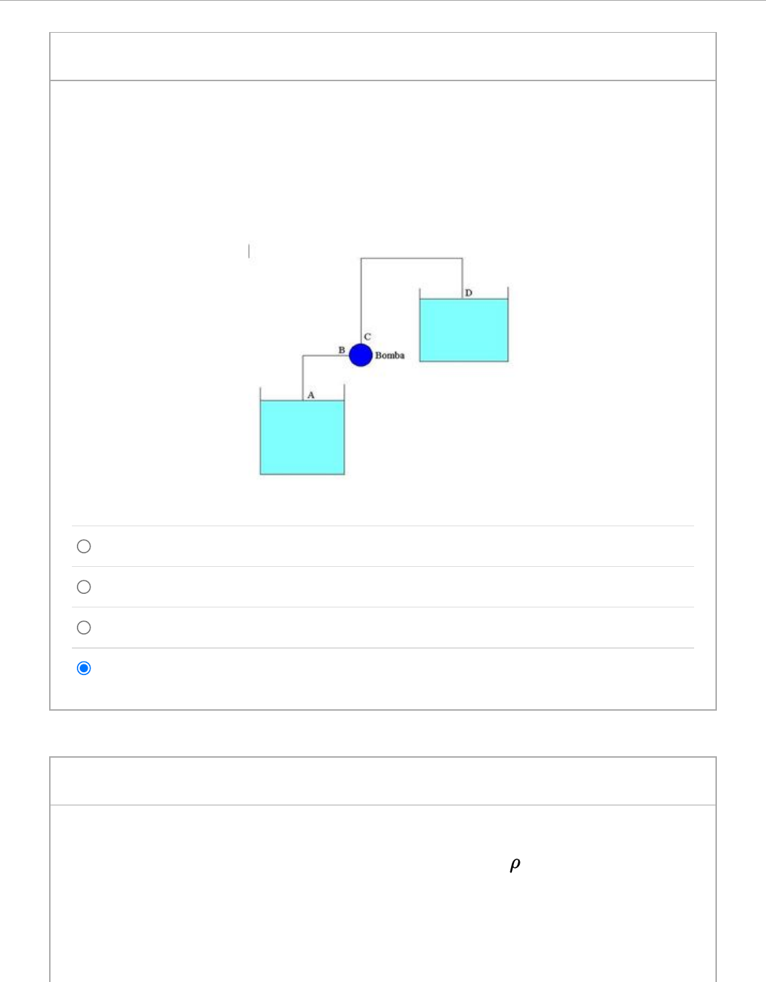 4/20/23, 1:14 PM Teste: ATIVIDADE OBJETIVA 9_1_2023 https://pucminas.instructure.com/courses/148999/quizzes/388693/take 1/8 ATIVIDADE OBJETIVA 9_1_2023 Iniciado: 20 abr em 12:56 Instruções do teste 0,4 ptsPergunta 1 15 m 10 m 30 m 20 m Uma bomba retira água de um reservatório e a eleva para um ponto situado 20 m acima, descarregando na atmosfera. As tubulações AB e CD têm um diâmetro de 10 cm. Desprezando as perdas de carga distribuídas nas tubulações AB e CD, determinar a energia fornecida pela bomba, em (m/s). 0,4 ptsPergunta 2 A bala de uma espingarda atinge um tanque de gasolina ( = 660 kg/m ), fazendo um furo a uma profundidade igual a 50 m abaixo da superfície livre da gasolina, como indicado na figura. O tanque está lacrado e possui uma pressão absoluta igual a 3 atm. Determinar a velocidade da gasolina ao sair pelo furo, em (m/s), é: 3 4/20/23, 1:14 PM Teste: ATIVIDADE OBJETIVA 9_1_2023 https://pucminas.instructure.com/courses/148999/quizzes/388693/take 2/8 0,399 m/s 3,99 m/s 399 m/s 39,9 m/s 0,4 ptsPergunta 3 407 m O nível da água em um tanque é de 20 m acima do solo. Uma mangueira está conectada à parte inferior do tanque, e o bocal no final da mangueira aponta diretamente para cima. A tampa do tanque é hermética e a pressão manométrica do ar acima da superfície da água é de 2 atm. O sistema está no nível do mar. Determinar a elevação máxima até a qual a corrente de água pode chegar em (m): 4/20/23, 1:14 PM Teste: ATIVIDADE OBJETIVA 9_1_2023 https://pucminas.instructure.com/courses/148999/quizzes/388693/take 3/8 4,07 m 40,7 m 0,407 m 0,4 ptsPergunta 4 46,14 kPa; 6,7165 kW 147,44 kPa; 6,7165 kW 147,44 kPa; 671,65 kW Uma máquina de escoamento permanente, conforme figura abaixo , recebe ar na seção (1 )e o descarrega nas seções (2) e (3). As propriedades de cada seção são as seguintes: SEÇÃO A (cm ) Q (L/s) T (°C) P (kPa) Z (cm) 1 371,6 2832 21 137,9 30,5 2 929 1133 38 206,84 121,9 3 232,3 1416 93 x 45,7 É fornecido trabalho para a máquina a uma taxa de 150 HP. Determinar a pressão P , em (kPa) e o calor transferido, em (W). 2 abs 3 4/20/23, 1:14 PM Teste: ATIVIDADE OBJETIVA 9_1_2023 https://pucminas.instructure.com/courses/148999/quizzes/388693/take 4/8 147,44 kPa; 67,165 kW 46,14 kPa; 67,165 kW 0,4 ptsPergunta 5 345867 Pa; 199047 Pa; - 147,1 W. 97747 Pa; 244567 Pa; -147,1 W; 199047 Pa; 345867 Pa; - 147,1 W; 244567 Pa; 97747 Pa; - 147,1 W; Água é bombeada de um reservatório (1) com 1 m de raio para um reservatório (4) de mesmas dimensões, com uma vazão mássica de 1 Kg/s. Sabendo que a bomba está localizada 10 m abaixo do nível do reservatório (1) e que toda a tubulação possui um raio de 1 in, determinar a pressão do fluido na entrada da bomba (2) em (Pa). Sabendo que a bomba está 25 m abaixo do reservatório (4), determinar a pressão de saída da bomba (3) em (Pa). Determinar a potência necessária para a bomba funcionar em (W). Considerar a massa específica da água igual a 998 kg/m . 3 0,4 ptsPergunta 6 4/20/23, 1:14 PM Teste: ATIVIDADE OBJETIVA 9_1_2023 https://pucminas.instructure.com/courses/148999/quizzes/388693/take 5/8 337,7 kW 3,377 kW 0,3377 kW 33,77 kW WHITE, Frank M. Mecânica dos Fluidos. 6. ed. Porto Alegre: AMGH, 2011 Quando a bomba da figura abaixo bombeia 220 m /h de água a 20°C do reservatório, a perda de carga total por atrito é de 5 m. O escoamento descarrega através de um bocal para a atmosfera . Determinar a potência da bomba em (kW) entregue para a água. Considerar: = 998 Kg/m 3 água 3 0,4 ptsPergunta 7 Um reservatório cilíndrico de exploração de água tem diâmetro interno igual a 3 m e altura de 3 m. Existe somente uma entrada com diâmetro igual a 10 cm, uma saída com diâmetro de 8 cm, e um dreno. Inicialmente o tanque está vazio quando a bomba de entrada é acionada, produzindo uma velocidade média na entrada de 5 m/s. Quando o nível do tanque atinge 0,7 m, a bomba de saída é acionada, causando uma vazão para fora do tanque na saída; a velocidade média na saída é 3 m/s. Quando o nível de água atinge 2 m, o dreno é aberto de tal 4/20/23, 1:14 PM Teste: ATIVIDADE OBJETIVA 9_1_2023 https://pucminas.instructure.com/courses/148999/quizzes/388693/take 6/8 0,024 m³/min 0,035 m³/min 1,45 m³/min 2,10 m³/min forma que o nível permanece em 2 m. Determinar a vazão no dreno, em (m /min).3 0,4 ptsPergunta 8 8,55 m 5,58 m 3,45 m 5,54 m OKIISHI, Theodore H. Fundamentos da Mecânica dos Fluidos, 2ed. São Paulo: Edgard Blucher, 2005 Uma tubulação de plástico, diâmetro igual a 50 mm é utilizada para sifonar água do tanque conforme figura. Se a diferença entre a pressão externa e a do escoamento for maior do que 25 kPa, a tubulação colapsará e o escoamento na tubulação será interrompido. Determinar a altura h, em (m), que este sifão opera. Desprezar os efeitos viscosos sobre o escoamento. 0,4 ptsPergunta 9 Um escoamento de água é bombeado com uma pressão de 2 atm. Determinar a maior altura em que uma caixa d’água pode ser colocada, para que o fluido 4/20/23, 1:14 PM Teste: ATIVIDADE OBJETIVA 9_1_2023 https://pucminas.instructure.com/courses/148999/quizzes/388693/take 7/8 1,035 m 20,69 m 10,35 m 31,04 m consiga se bombeado, em (m). O diâmetro da tubulação é constante. Considerar a massa específica da água igual a 998 kg/m .3 0,4 ptsPergunta 10 Em um tubo de Venturi horizontal, instala-se um manômetro diferencial de água. Desprezando as perdas de energia e supondo constante o peso específico do ar ( = 1,3kgf/m ) e os diâmetros do tubo (D = 500 mm, D = 300 mm), obter a diferença de pressão entre os pontos (1) e (2), em (Pa): 3 1 2 4/20/23, 1:14 PM Teste: ATIVIDADE OBJETIVA 9_1_2023 https://pucminas.instructure.com/courses/148999/quizzes/388693/take 8/8 Salvo em 13:14 8829 Pa 88,29 Pa 882,9 Pa 0,88 Pa Enviar teste