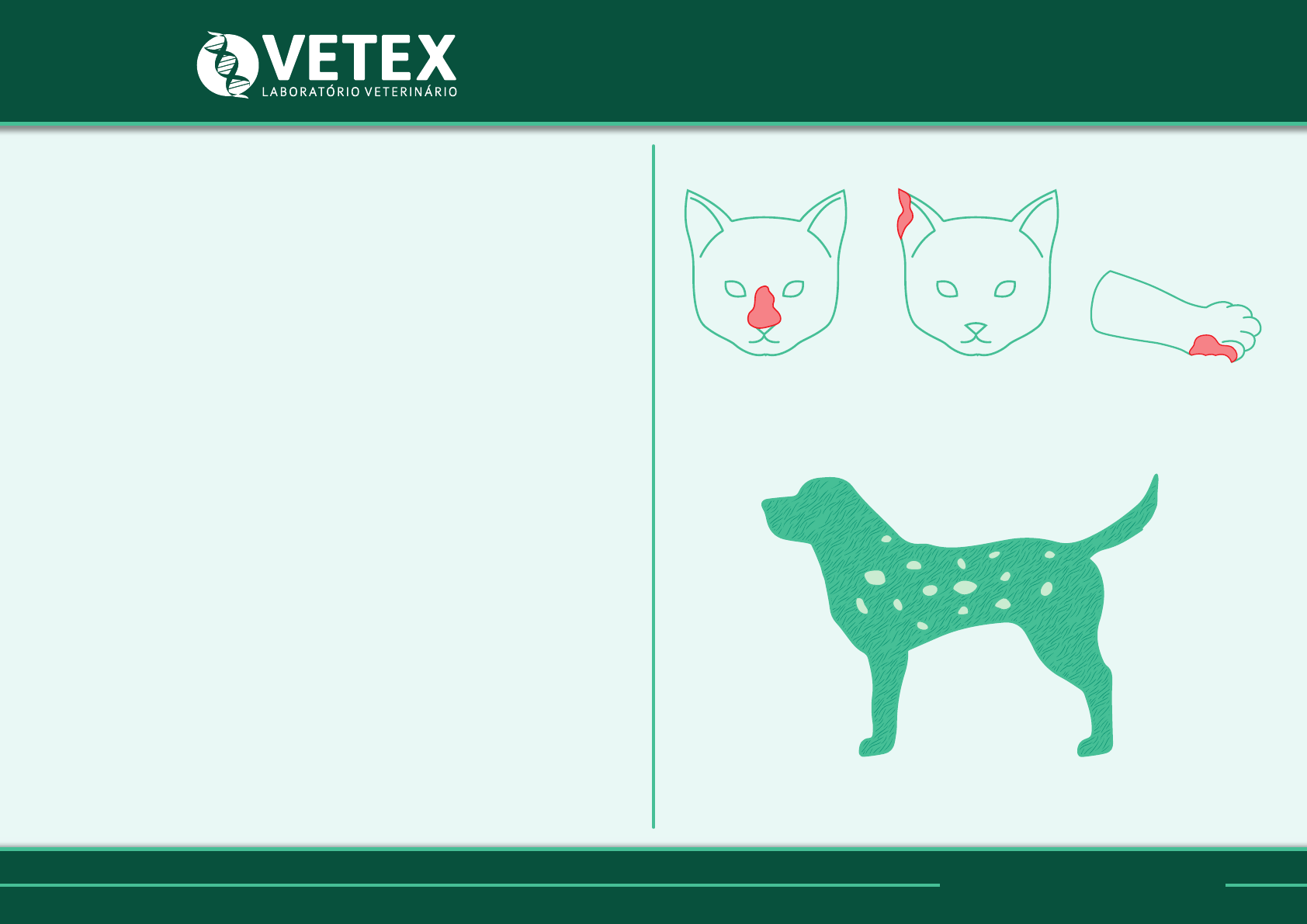 V E T E X . V E T . B R CULTURA FÚNGICA PARA DERMATÓFITOS E LEVEDURAS O exame de cultura fúngica para dermatófitos e leveduras possui como objetivo isolar os agentes causadores de lesões cutâneas ou de fluidos que acometem os animais. Tais enfermidades estão amplamente inseridas no cotidiano dos clínicos veterinários, principalmente envolvendo cães e gatos, sendo mais comuns as relacionadas com dermatites fúngicas, rinites fúngicas e dermatofitoses. Para obtenção de sucesso na cultura fúngica, faz-se necessário realizar alguns passos que auxiliem na análise pelo laboratório, sendo eles: HISTÓRICO CLÍNICO: Apesar de subestimado, o histórico clínico pode auxiliar grandemente na interpretação do resultado de cultura fúngica. É de suma importância ter a descrição das lesões, tempo de evolução, tratamentos realizados e até mesmo exames prévios (citologia, histopatologia, lâmpada de wood, etc.). COLETA E ENVIO DAS AMOSTRAS: Podem ser enviados pelos, raspados cutâneos, fragmentos cutâneos ou até mesmo outros fluidos (ex. lavado broncoalveolar e urina). O material deve ser acondicionado preferencialmente em frascos estéreis. É importante lembrar que a pele e o pelo dos animais são locais altamente contaminados e que podem servir de hospedagem para fungos ambientais, os quais poderão crescer juntamente com fungos patogênicos. FASE ANALÍTICA: Uma vez recebidas as amostras, essas são semeadas em 3 meios de cultura (Ágar D.T.M, Ágar Sabouraud glicose seletivo e Ágar BIGGY) e seu crescimento é acompanhado periodicamente. O tempo máximo de espera para crescimento fúngico é de 21 dias, porém alguns agentes podem apresentar crescimento em tempo menor. FASES PRÉ-ANALÍTICAS: Locais mais comuns para visualização de lesões ulcerativas, crostosas e/ou alopécicas usualmente encontradas em casos de esporotricose felina. Padrão lesional clássico de dermatofitose canina, com áreas circulares de alopecia podendo haver a formação de halos/colaretes. V E T E X . V E T . B R ESPOROTRICOSE É causado por fungos do gênero Sporothrix sp. que acomete animais e seres humanos, sendo considerada uma zoonose. Costuma ser uma infecção de pele e de tecido subcutâneo, mas pode se expandir para ossos e órgãos internos. O fungo está presente no ambiente, em materi- ais como solo, plantas, madeira, musgos, vegetais em decomposição, espinhos e farpas. A transmissão se dá por mordeduras, arranhaduras, aerossóis e penetração em pele danificada. A doença pode se apresentar tanto como uma única lesão de pele passível de regressão espontânea, até uma forma grave devido à disseminação por via sanguínea ou linfática, sendo a forma cutânea mais comum. O gato doméstico é mais susceptível a contaminação, além de apresentar uma evolução rápida da doença. Cães raramente são acometidos, mas quando o são, normalmente apresentam a forma cutânea. Sinais clínicos: dependerão da forma desenvolvida pela doença, e incluem: nódulos ulcerados e/ou exsudativos (com secreções) na pele e/ou mucosas, áreas de alopecia e lesões crostosas. Diagnóstico: para auxílio do diagnóstico, o laboratório VETEX fornece exames como: •Citologia •Cultura fúngica •Histopatológico DERMATOFITOSE É uma infecção oportunista que acomete pele, unhas e pelos. É causada pelos fungos do gênero Microsporum sp. e Trychophyton sp. e podem atingir cães, gatos, bovinos, equinos e humanos. A doença geralmente se expressa em situações de imunossupressão, perda da barreira protetora cutânea e umidade prolongada na pele, sendo transmitida através do contato direto. Sinais clínicos: alopecia, colarete epidérmico, exsudação da pele, eritema, descamação da pele, hiperpigmentação, prurido, hiperquera- tose e pústulas. Alguns animais podem ser assintomáticos. Diagnóstico: para auxílio do diagnóstico o laboratório VETEX fornece exames como: •Pesquisa de fungos em lâmina •Cultura fúngica •Histopatológico CULTURA FÚNGICA PARA DERMATÓFITOS E LEVEDURAS MALASSEZIOSE É causada por leveduras do gênero Malassezia sp., sendo essas presentes na microbiota cutânea de cães e gatos. Porém, quando alguma lesão na pele ou imunossupressão ocorre, uma multiplicação descontrolada das leveduras acontece, surgindo assim uma infecção. Sinais clínicos: prurido, alopecia, seborreia, descamação da pele, eritema, hiperqueratose, ulceração de pele, mau cheiro e hiperpigmen- tação. As lesões geralmente são observadas na região da face, conduto auditivo externo, porção ventral do pescoço, axilas, entre os dedos (interdigital) e ventre (abdômen). Diagnóstico: para auxílio do diagnóstico o VETEX fornece exames como: •Pesquisa de fungos em lâmina •Histopatológico •Citologia •Cultura fúngica ASPERGILOSE É causada pelos fungos do gênero Aspergillus sp., a infecção ocorre quando os esporos do fungo são inalados ou ingeridos. O animal saudável pode inalar os esporos sem se contaminar, mas em situações em que haja imunossupressão ou fatores debilitantes, pode apresentar a doença. Nos cães, pode manifestar-se sob três formas clínicas: aspergilose nasal (invasiva e não invasiva), aspergilose disseminada e aspergilose pulmonar (rara). A aspergilose nasal invasiva é a forma mais comum. As lesões da cavidade nasal e seios paranasais levam à destruição da mucosa, atingindo os tecidos moles periorbitais e ossos. A aspergilose disseminada geralmente acomete os discos intervertebrais, baço, coração, ossos, glomérulos renais e olhos. Geralmente há isolamento de Aspergillus sp. em amostras cutâneas, não sendo indicativo de dermatite fúngica por tal agente, visto que a pele é um local exposto e altamente contaminado. Sinais clínicos: as manifestações clínicas variam de acordo com o órgão afetado, a extensão das lesões, o tempo de evolução da doença e a resistência do hospedeiro. Diagnóstico: para auxílio 