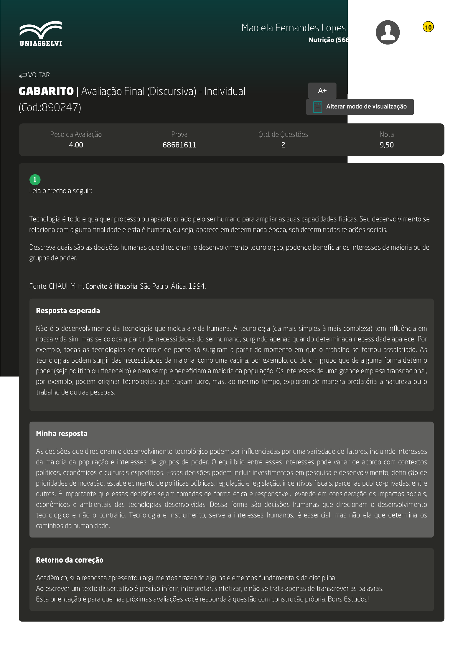 17/09/2023, 18:06 AVA https://ava2.uniasselvi.com.br/subject/grades-and-tests/answer-book/eyJ0ZXN0Ijp7InRlc3RDb2RlIjoiODkwMjQ3IiwiZGVzY3JpcHRpb24iOiJBdmFsaWHDp8OjbyBGaW5hbCAoRGlzY3Vyc2l2YSkgLSBJbmRpdmlkdW… 1/2 GABARITO | Avaliação Final (Discursiva) - Individual (Cod.:890247) Peso da Avaliação 4,00 Prova 68681611 Qtd. de Questões 2 Nota 9,50 Leia o trecho a seguir: Tecnologia é todo e qualquer processo ou aparato criado pelo ser humano para ampliar as suas capacidades físicas. Seu desenvolvimento se relaciona com alguma finalidade e esta é humana, ou seja, aparece em determinada época, sob determinadas relações sociais. Descreva quais são as decisões humanas que direcionam o desenvolvimento tecnológico, podendo beneficiar os interesses da maioria ou de grupos de poder. Fonte: CHAUÍ, M. H. Convite à filosofia. São Paulo: Ática, 1994. Resposta esperada Não é o desenvolvimento da tecnologia que molda a vida humana. A tecnologia (da mais simples à mais complexa) tem influência em nossa vida sim, mas se coloca a partir de necessidades do ser humano, surgindo apenas quando determinada necessidade aparece. Por exemplo, todas as tecnologias de controle de ponto só surgiram a partir do momento em que o trabalho se tornou assalariado. As tecnologias podem surgir das necessidades da maioria, como uma vacina, por exemplo, ou de um grupo que de alguma forma detém o poder (seja político ou financeiro) e nem sempre beneficiam a maioria da população. Os interesses de uma grande empresa transnacional, por exemplo, podem originar tecnologias que tragam lucro, mas, ao mesmo tempo, exploram de maneira predatória a natureza ou o trabalho de outras pessoas. Minha resposta As decisões que direcionam o desenvolvimento tecnológico podem ser influenciadas por uma variedade de fatores, incluindo interesses da maioria da população e interesses de grupos de poder. O equilíbrio entre esses interesses pode variar de acordo com contextos políticos, econômicos e culturais específicos. Essas decisões podem incluir investimentos em pesquisa e desenvolvimento, definição de prioridades de inovação, estabelecimento de políticas públicas, regulação e legislação, incentivos fiscais, parcerias público-privadas, entre outros. É importante que essas decisões sejam tomadas de forma ética e responsável, levando em consideração os impactos sociais, econômicos e ambientais das tecnologias desenvolvidas. Dessa forma são decisões humanas que direcionam o desenvolvimento tecnológico e não o contrário. Tecnologia é instrumento, serve a interesses humanos, é essencial, mas não ela que determina os caminhos da humanidade. Retorno da correção Acadêmico, sua resposta apresentou argumentos trazendo alguns elementos fundamentais da disciplina. Ao escrever um texto dissertativo é preciso inferir, interpretar, sintetizar, e não se trata apenas de transcrever as palavras. Esta orientação é para que nas próximas avaliações você responda à questão com construção própria. Bons Estudos! VOLTAR A+ Alterar modo de visualização 1 Marcela Fernandes Lopes Felix Nutrição (5662588) 10 17/09/2023, 18:06 AVA https://ava2.uniasselvi.com.br/subject/grades-and-tests/answer-book/eyJ0ZXN0Ijp7InRlc3RDb2RlIjoiODkwMjQ3IiwiZGVzY3JpcHRpb24iOiJBdmFsaWHDp8OjbyBGaW5hbCAoRGlzY3Vyc2l2YSkgLSBJbmRpdmlkdW… 2/2 Cientistas de todo mundo trabalham juntos sobre uma pergunta de ordem mundial: como conter o novo coronavírus? As hipóteses são várias: por meio de novos ou antigos medicamentos, vacinas e até mesmo medidas não farmacológicas, como o distanciamento social. No entanto, para verificar essas possibilidades, é preciso testar. Nesse sentido, a experimentação ganha um lugar de destaque ao trazer evidências que corroborem ou descartem tais ideias. No entanto, com a expectativa de encontrar respostas rápidas, desinformações têm circulado pelas redes sociais sobre possíveis medicamentos para a covid-19. No cenário político, figuras públicas tomadoras de decisões têm reforçado essas atitudes por meio de apostas em certos tratamentos sem respaldo científico, como é o caso da discussão a respeito da cloroquina, medicamento antimalarial cujos estudos não têm sido promissores para o novo coronavírus. Embora estejamos vivenciando uma situação inédita, o posicionamento favorável a algumas das propostas sem evidências fundamentadas é impensável. “Não se trata de dizer ‘eu acho que…’, e sim de demonstrar, à luz do conhecimento científico, como se pode e se deve resolver os problemas”, diz Carlos Alberto Lombardi Filgueiras, professor da Universidade Federal de Minas Gerais e notório por seus trabalhos sobre história da ciência. A partir do exposto, explique por que é necessário que se faça uma demonstração utilizando o método científico para buscar soluções para um problema. Fonte: SOTÉRIO, C. Como o método científico se aplica às pesquisas sobre o novo coronavírus. Revista com Ciência, maio 2020. Disponível em: https://bit.ly/41Lmj08. Acesso em: 26 jul. 2023. Resposta esperada A demonstração de uma solução para um problema, através do método científico, garante que as hipóteses propostas para solução passem por testes rigorosos, verificando se as evidências obtidas através da experimentação são suficientes para demonstrar que as hipóteses são verdadeiras. Minha resposta A aplicação do método científico na solução de problemas oferece uma garantia sólida de que as hipóteses propostas para a solução são submetidas a testes rigorosos e verificadas empiricamente. Esse processo assegura a confiabilidade das soluções apresentadas, uma vez que se baseiam em evidências objetivas e experimentação controlada, proporcionando uma abordagem confiável e robusta para resolver desafios em diversas áreas do conhecimento. Como na covid-19, utilizar o método cientifico foi muito importante. Ele nos ajuda a descobrir co
