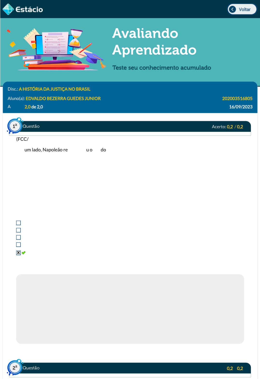 Avaliando Aprendizado Teste seu conhecimento acumulado Disc.: A HISTÓRIA DA JUSTIÇA NO BRASIL Aluno(a): EDVALDO BEZERRA GUEDES JUNIOR 202003516805 Acertos: 2,0 de 2,0 16/09/2023 Acerto: 0,2 / 0,2 (FCC/2019) Por um lado, Napoleão representou o �m do processo revolucionário iniciado em 1789, impondo a unidade das facções e um governo autoritário e personalista que nada tinha que ver com as aspirações dos revolucionários republicanos radicais de 1789. Por outro lado, transformou alguns princípios revolucionários em instituições e leis estáveis, como o Código Civil − que regulamentou a relação entre pessoas livres e iguais −, além de espalhar seus ideais por toda a Europa, com a força de seus exércitos. (Adaptado de: NAPOLITANO, Marcos et al. História para o Ensino Médio. São Paulo: Atual Editora, 2013, p. 374) Os "princípios revolucionários" da Revolução Francesa mencionados no texto in�uenciaram diretamente os defensores da luta contra o domínio português. O movimento ocorrido no século XVIII, composto por distintos setores sociais, incluindo homens livres e libertos, que se enquadrou nesse per�l foi a: Cabanagem. Revolução Praieira. Revolta dos Malês. Balaiada. Conjuração Baiana. Respondido em 16/09/2023 14:07:31 Explicação: Na manhã de 12 de agosto de 1798, a população de Salvador foi surpreendida pelo teor dos boletins manuscritos a�xados em prédios públicos, alguns dos quais com uma mensagem que convocava o povo baiano, favorável à República; era uma ordem, uma conclamação para uma necessária revolução. A informação foi acrescida pela convocação da população a participar do levante projetado pelo Partido da Liberdade: um grupo que se intitulava Anônimos Republicanos (MATTOSO, 1969). As autoridades dos dois lados do Atlântico não desconsideraram o peso dos termos veiculados nos boletins, liberdade, república e revolução, que naquela conjuntura compunham a cadência da Revolução Americana (1776), da Revolução Francesa (1789) e da revolução escrava em São Domingo (1791). MATTOSO, K. M. de Q. Presença francesa no movimento democrático baiano de 1798. Salvador: Itapuã, 1969. p. 150- 159. Acerto: 0,2 / 0,2 Questão1 a Questão2 a https://simulado.estacio.br/alunos/inicio.asp javascript:voltar(); O período joanino, marcado pelo momento da coroação de D. João VI no Brasil, é marcado em termos de justiça pela: Mediação de forças entre as estruturas coloniais e sua adequação a um novo momento. Fragilização dos juízes de paz, leigos, criando formas políticas em que Homens Bons passavam a ser os juízes, também chamados de coronéis. Aniquilamento das in�uências espanholas e inglesas do Brasil, criando uma estrutura mais nacionalista. Direcionamento à redução da importância da capital com a criação de tribunais em todo o Brasil. Fortalecimento da capital com a criação de uma instância máxima da justiça, o Tribunal da Relação. Respondido em 16/09/2023 14:30:50 Explicação: A resposta correta é: Mediação de forças entre as estruturas coloniais e sua adequação a um novo momento. Acerto: 0,2 / 0,2 (FUNCAB/2010 - Adaptada) O período da ditadura militar no Brasil vai de 1964 a 1985, sendo seu primeiro presidente o Marechal Humberto de Alencar Castelo Branco, indicado pela junta militar que governara o país na primeira quinzena após o golpe. Sobre o seu período presidencial, analise as a�rmativas abaixo, assinalando as ações realizadas durante a sua gestão. I. O Congresso Nacional foi convocado para a promulgação de nova Constituição, elaborada pelo Poder Executivo. II. Foi criado o bipartidarismo, sistema em que apenas dois partidos foram autorizados a funcionar o�cialmente: Movimento Democrático Brasileiro e Aliança Renovadora Nacional. III. No transcorrer desse período, houve forte contestação popular, culminando com a passeata dos "Cem Mil", promovida pela União Nacional dos Estudantes no estado do Rio de Janeiro. Marque a alternativa que apresenta as a�rmativas corretas. I, II e III. Apenas I e III. Apenas II e III. Apenas I. Apenas I e II. Respondido em 16/09/2023 14:13:55 Explicação: Os primeiros anos do regime também foram caracterizados pela edi�cação de seu aparato jurídico, o que daria aos governos militares autoridade para reprimir a sociedade civil e perseguir adversários políticos. Dentre os atos praticados, encontra-se a edição de atos instituicionais. ATO INSTITUCIONAL N° 1 (9 DE ABRIL DE 1964) Delineou os fundamentos da LSN, que seria publicada em março de 1967, e permitiu ao governo cassar direitos políticos por um prazo de dez anos, além de suspender a Constituição por seis meses. ATO INSTITUCIONAL N° 2 (27 DE OUTUBRO DE 1965) Foi formulado como uma resposta ao resultado das eleições realizadas no início de outubro de 1965, nas quais a oposição ao regime conseguiu importantes vitórias. As principais determinações do AI-2 foram o aumento do poder do chefe do Executivo, a extinção do pluripartidarismo e a regulamentação das eleições indiretas para o cargo de presidente e vice-presidente da República. Questão3 a ATO INSTITUCIONAL N° 3 (5 DE FEVEREIRO DE 1966) Seu principal objetivo era regular as eleições e o funcionamento da política formal. O AI-3 estabeleceu o bipartidarismo, segundo o qual seriam reconhecidos dois partidos políticos o�ciais: a Arena, o partido do governo, e o MDB, que seria a oposição institucional. O AI-3 ainda determinou que as escolhas dos governadores dos estados e dos prefeitos das capitais se dariam por indicação. Os governadores seriam indicados pelo presidente da República; os prefeitos das capitais, pelos governadores. ATO INSTITUCIONAL N° 4 (7 DE DEZEMBRO DE 1966) Suspendeu de�nitivamente a Constituição e convocou uma Assembleia Nacional Constituinte originária para a elaboração de uma nova. Todos esses atos institucionais prepararam o caminho para a promulga