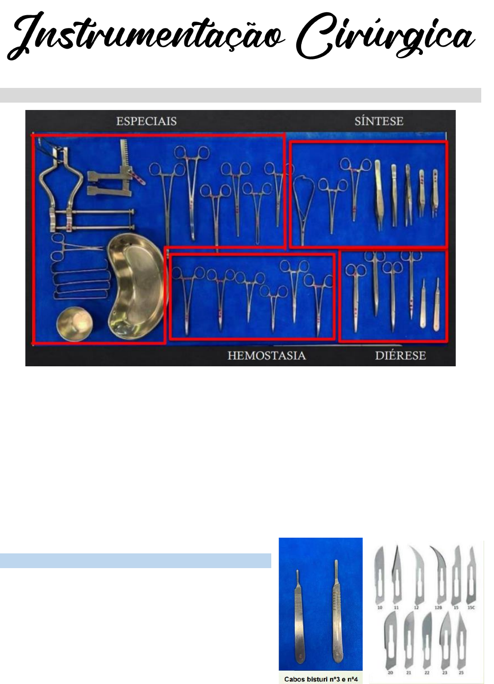 Técnica Operatória – Profa.: Adelina – 22/08/23 6º semestre – Katielle R. Bernardo 1 MESA CIRÚRGICA Qualquer procedimento cirúrgico (ato cruento) básico consta 3 etapas: Diérese, hemostasia e síntese. O instrumentador irá organizar todo o material, de maneira ordenada sequencialmente, seguindo as etapas supracitadas. Isto é, todos os materiais de mesma função devem estar juntos e sequencialmente organizados na mesa de instrumentação. Materiais móveis: fios cirúrgicos, gases, algodão. Deve ser reposto quando necessário pelo instrumentador cirúrgico Especiais: Materiais de preensão (responsáveis pela tração e manipulação de tecidos), bem como afastadores que mantém as bordas da incisão afastadas, são necessários para facilitar a manipulação de tecidos e órgãos internos e profundos. Devem estar dispostos entre o material de hemostasia e síntese. DIÉRESE: afastar os tecidos Incisão, Secção, Divulsão, Punção, Diltação, Serração Definição: toda manobra para criar descontinuidade de tecidos, ou seja, permitir, o acesso do cirurgião ao leito cirúrgico. • Instrumental corte: Bisturis e Tesouras o Bisturi: realizar a incisão cirúrgica Técnica Operatória – Profa.: Adelina – 22/08/23 6º semestre – Katielle R. Bernardo 2 ▪ Características: formado por cabo e lâmina. ▪ Bisturi 10+, cabo 3 → cortes pequenos ▪ Bisturi 20+, cabo 4 → cortes profundos *Mais usados: 20, 21 e 15 Como Montar o bisturi? o Tesouras: possuem função de seccionar, dissecar, divulsionar e desbridar tecidos. Além de cortar fios e gaze. ▪ Tipos de pontas das tesouras: retas (utilizadas em superfície e corte de fios); curvas (para profundidade – maior visibilidade – preferência dos cirurgiões); agudas (cortes precisos e delicados – não usar em cavidades); e rombas (uso em cavidades). • Tesoura de mayo (reta e curva): material mais grosseiro e fortes – para tecidos grosseiros, como a aponeurose. Dissecção e divulsão → tesoura que faz uma pressão mais forte. A sua porção funcional compreende cerca da metade da tesoura. • Tesoura Metzenbaum (reta e curva): material mais delicados – usados para tecidos mais delicados. Dissecção e divulsão . Porção funcional equivale a 1/3 do comprimento da tesoura. Maior proporção entre cabo e lâmina. Técnica Operatória – Profa.: Adelina – 22/08/23 6º semestre – Katielle R. Bernardo 3 o Tanto Mayo, quanto Metzenbaum podem ser usadas para divulsão, secção e deslocamento. E Não utilizá-las para corte de fios a fim de não danificar o material. Usa-se a Spencer, em geral, com a função de retirada de pontos. Obs.: Na montagem da mesa sempre vai do mais grosseiro para o mais delicado (para ter corte para os tecidos). o *curvo sempre é mais delicado HEMOSTASIA: parada do sangramento Definição: toda manobra para conter hemorragia • Hemostasia (sempre temos pinças hemostáticas do tipo reta e curva). Além das compressas. o Pinças hemostáticas são caracterizadas por possuir preensão contínua para suprimir sangramentos. Possuem garras estriadas que se mantêm presas em cremalheiras. Elas podem ser encontradas retas ou curvas, com ou sem dentes, com estrias transversais ou longitudinais Obs.: A chanfradura interna diferencia as pinças Obs.: Organização das principais pinças hemostáticas: são organizadas em ordem crescente de tamanho, com as curvas antes das retas e a ponta voltada para o instrumentador, com curvatura voltada para a mesa. (Ordem: Hasted, Kelly, Crile, Kocher, Rochester) • Pinça Halsted (pinças “mosquito” ou “Kellynho”): são as menores, delicadas, com estrias transversais em toda sua face de preensão. Usadas em pequenos vasos, em estruturas orgânicas nobres e pinçam fios finos para sutura. Estrias transversais preenchem apenas os 2/3 distais da parte funcional (na face de preensão). Não possuem dentes. Técnica Operatória – Profa.: Adelina – 22/08/23 6º semestre – Katielle R. Bernardo 4 • Pinça Kelly: são muito utilizadas, possuem ponta fina e se diferenciam pelo fato das ranhuras internas (estrias transversais) preencherem apenas os 2/3 distais da parte funcional (na face de preensão). Não possuem dentes. Como diferenciar Kelly x Halsted? • Pinça Crile: são parecidas com a Kelly, porém as ranhuras ocupam toda a parte funcional. É uma pinça longa. Como diferenciar Kelly e Crille? Técnica Operatória – Profa.: Adelina – 22/08/23 6º semestre – Katielle R. Bernardo 5 Como diferenciar Crile e Kelly? Como diferenciar Hasted, Kelly e Crille? • Pinça Kocher: apresenta estrias transversais em toda sua face preensora e dentes na ponta. São pinças longas usadas aos pares, para pinçamento do estômago e alças intestinais, apresentando as bordas para sutura. Usada mais como instrumento de preensão. o Pinça de Kocher: curva ou reta, atualmente se utiliza mais para preensão e para tracionar o tecido firmemente, evitando que escorregue. Tração de aponeurose. o Serve para apreensão (tecidos grosseiros para tracionar) → Pinça Kocher Técnica Operatória – Profa.: Adelina – 22/08/23 6º semestre – Katielle R. Bernardo 6 • Pinça Rochester: são pinças robustas, longas, com estrias transversais em toda a sua face de preensão. SÍNTESE: conecta tecidos próximos para a posterior cicatrização (sutura) Definição: manobra que permite a aproximação tecidual e acelera o processo de cicatrização. Sendo assim, a sutura é realizada com fios cirúrgicos. É a última etapa, união das bordas. • Preensão: Pinças de dissecção. Função: Preensão – consiste em agarrar e manipular tecidos. • Tipos de pinças de dissecção: o Pinça de dissecção do tipo anatômico ou sem dente. Chamada de pinça atraumática. A pinça possui estrias no sentido transversal na sua face interna. É utilizada para preensão de vasos e paredes de vasos (tecidos delicados). o Pinça de dissecção do tipo dente d