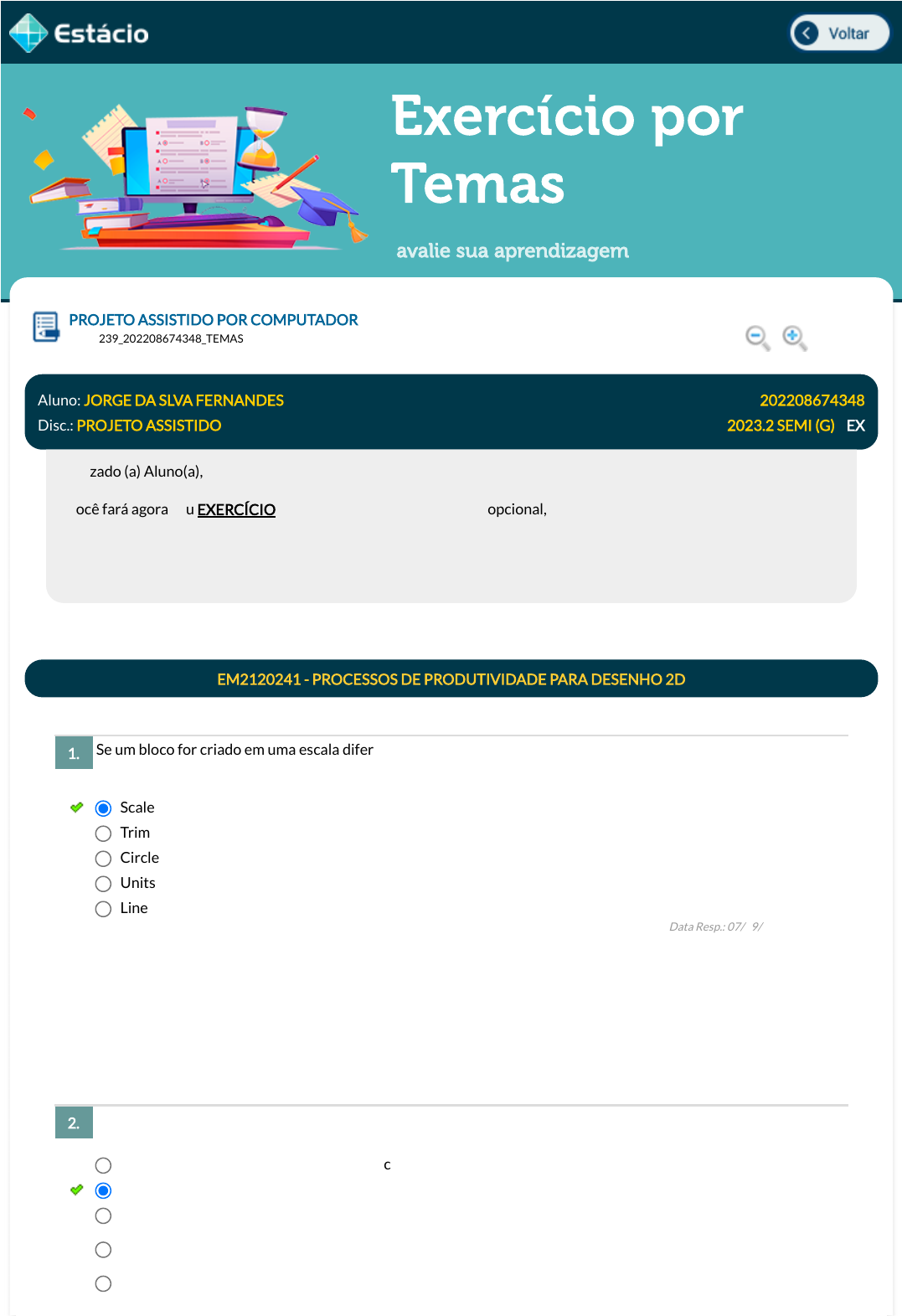 18/09/2023, 14:58 Estácio: Alunos https://simulado.estacio.br/alunos/ 1/4 Exercício por Temas avalie sua aprendizagem Se um bloco for criado em uma escala diferente da que estamos usando em nosso projeto, qual é o comando que deve ser utilizado para corrigir o problema? Em relação à criação e à inserção de blocos, assinale a alternativa correta: PROJETO ASSISTIDO POR COMPUTADOR Lupa DGT0239_202208674348_TEMAS Aluno: JORGE DA SLVA FERNANDES Matr.: 202208674348 Disc.: PROJETO ASSISTIDO 2023.2 SEMI (G) / EX Prezado (a) Aluno(a), Você fará agora seu EXERCÍCIO! Lembre-se que este exercício é opcional, mas não valerá ponto para sua avaliação. O mesmo será composto de questões de múltipla escolha. Após responde cada questão, você terá acesso ao gabarito comentado e/ou à explicação da mesma. Aproveite para se familiarizar com este modelo de questões que será usado na sua AV e AVS. EM2120241 - PROCESSOS DE PRODUTIVIDADE PARA DESENHO 2D 1. Scale Trim Circle Units Line Data Resp.: 07/09/2023 23:43:53 Explicação: A resposta certa é: Scale 2. A única forma de inserir um bloco é pelo comando Insert Block. Após inserir um bloco, é possível editá-lo, mudando seu formato, layer e outros atributos. Os blocos, ao serem inseridos, sempre se mantêm �xos na Layer Blocos. Os blocos devem ser feitos na escala do desenho corrente. Caso contrário, a escala de outros desenhos não poderá ser ajustada. Os blocos são elementos que não podem ser explodidos pelo comando Explode. Data Resp.: 07/09/2023 23:44:19 javascript:voltar(); javascript:voltar(); javascript:diminui(); javascript:aumenta(); 18/09/2023, 14:58 Estácio: Alunos https://simulado.estacio.br/alunos/ 2/4 Em relação ao comando Fillet, assinale a alternativa correta: Em relação ao AutoCAD, assinale a alternativa incorreta: Analise os símbolos apresentados a seguir: De acordo com a NBR 6492, esses símbolos representam, respectivamente: Explicação: A resposta certa é: Após inserir um bloco, é possível editá-lo, mudando seu formato, layer e outros atributos. 3. Pode criar uma quina de 90° entre duas linhas perpendiculares, caso esteja programado, no default, raio zero. Serve para criar linhas paralelas a uma distância preestabelecida. Só funciona para criar arcos ou quinas em linhas dentro de blocos. Funciona apenas em linhas que estão no layer de alvenaria. Só funciona para cortar linhas que se cruzam. Data Resp.: 07/09/2023 23:45:22 Explicação: A resposta certa é: Pode criar uma quina de 90° entre duas linhas perpendiculares, caso esteja programado, no default, raio zero. 4. O ideal na hora de inserir um bloco é já deixar o layer correspondente acionado para, depois, não precisar corrigir os elementos em layers errados. É importante colocar um texto com o nome dos ambientes para humanizar a planta. É muito mais prático desenhar todas as esquadrias que inserir seus respectivos blocos. Tentar desenhar os cômodos de forma isolada, um a um, é mais demorado e pode gerar mais imprecisões. Para fazer o projeto de uma planta baixa, os comandos Line, Offset e Trim são os mais usados. Data Resp.: 07/09/2023 23:46:18 Explicação: A resposta certa é: É muito mais prático desenhar todas as esquadrias que inserir seus respectivos blocos. 5. Indicação geográ�ca, cota de nível para projeções em corte, cota de nível para projeções em planta e seta indicativa da inclinação do telhado. Indicação geográ�ca, cota de nível para projeções em planta, cota de nível para projeções em corte e seta indicativa da inclinação do telhado. Indicativo do Azimute, cota de nível para projeções em planta, cota de nível para projeções em corte e seta indicativa da inclinação do telhado. Seta indicativa da inclinação do telhado, cota de nível para projeções em corte, cota de nível para projeções em planta e indicação geográ�ca. 18/09/2023, 14:58 Estácio: Alunos https://simulado.estacio.br/alunos/ 3/4 A norma que contém alguns símbolos essenciais para representação grá�ca arquitetônica é: O comando que corta linhas que se cruzam ao ser selecionado é: Em relação ao AutoCAD, assinale a alternativa incorreta: O comando que cria uma linha paralela a partir da sua primitiva, a uma distância imposta, é: Com relação à criação e à inserção de blocos, assinale a alternativa incorreta: Indicação geográ�ca, cota de nível para projeções em corte, cota de nível para projeções em planta e seta indicativa de curva de nível. 6. NBR 8196 NBR 6492 NBR 6023 NBR 10582 NBR 8404 7. Units Layers Line Scale Trim 8. Na Select Window, somente objetos inteiramente dentro da caixa de seleção serão selecionados. Para usar a seleção em laço, basta clicar na tela, mantendo o botão esquerdo do mouse pressionado, e abrir a seleção. O Select Crossing seleciona todos os elementos que estiverem dentro da caixa de seleção e os que forem tocados por sua borda. Uma forma prática de selecionar um ou mais elementos de uma só vez é utilizar a Select Window. Os objetos como blocos só podem ser selecionados pelo Select Crossing. Data Resp.: 07/09/2023 23:45:08 Explicação: A resposta certa é: Os objetos como blocos só podem ser selecionados pelo Select Crossing. 9. Fillet Trim Layer Move Offset 10. 18/09/2023, 14:58 Estácio: Alunos https://simulado.estacio.br/alunos/ 4/4 O comando para inserir os blocos é Insert Block. O comando para fazer um bloco novo é Block. Os blocos podem ser baixados de forma livre em sites de fabricantes e blogs de AutoCAD. Quando pegamos blocos de outras fontes, é interessante formatar suas layers e suas cores para que, depois de sua inserção no desenho �nal, eles já estejam formatados. Os comandos Ctrl+C e Ctrl+V não funcionam para copiar e colar blocos. Não Respondida Não Gravada Gravada Exercício por Temas inciado em 07/09/2023 23:43:34.