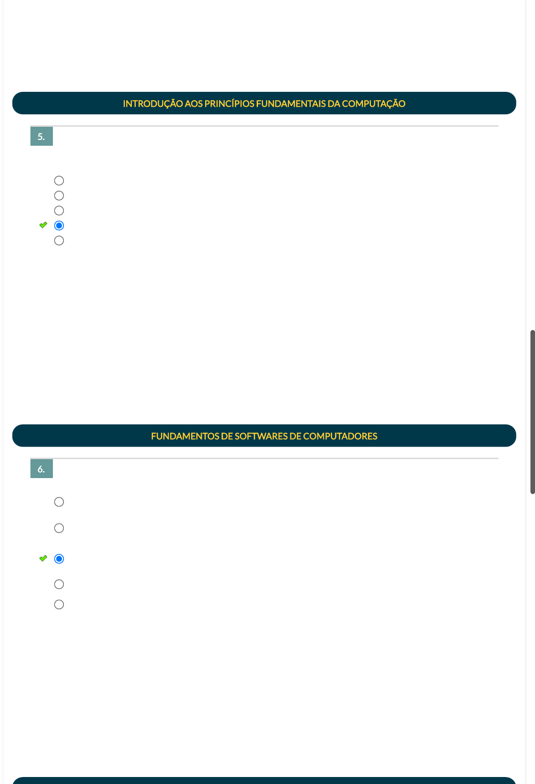 18/09/23, 14:17 Estácio: Alunos https://simulado.estacio.br/alunos/ 1/1 Linguagens de programação são conjuntos de símbolos, palavras e regras sintáticas que permitem ao programador escrever códigos. Qual é o objetivo da utilização de uma linguagem de programação na escrita de códigos para o computador? (AVALIA/2023) Existem vários tipos de softwares no mercado, alguns são livres e outros proprietários. É correto a�rmar que é uma característica do software proprietário: A resposta correta é: (0,0) e (5,4) INTRODUÇÃO AOS PRINCÍPIOS FUNDAMENTAIS DA COMPUTAÇÃO 5. Para que sejam utilizados somente os recursos principais da linguagem Para tornar os códigos mais chiques e chamativos Para tornar os códigos mais complexos Para que o computador compreenda o que fazer Para imprimir na tela instruções simpli�cadas Data Resp.: 18/09/2023 14:12:33 Explicação: As linguagens de programação fornecem uma forma de comunicação entre o programador e o computador. Através da utilização de uma linguagem de programação, o programador pode escrever códigos que o computador entenda e execute. O objetivo principal da utilização de uma linguagem de programação é garantir que o computador compreenda corretamente as instruções escritas pelo programador, possibilitando a realização de tarefas e a resolução de problemas complexos. FUNDAMENTOS DE SOFTWARES DE COMPUTADORES 6. a liberdade de executar o programa como você desejar, para qualquer propósito. a liberdade de distribuir cópias de suas versões modi�cadas. Desta forma, pode-se dar a toda a comunidade a chance de se bene�ciar com as mudanças. Mas sem acesso ao código-fonte, que é de propriedade do desenvolvedor. são os programas com um autor de�nido que negam o acesso livre ao código fonte, seja para modi�cá-lo, estudá-lo ou distribuí-lo. a liberdade de acessar o código-fonte, mas não pode modi�cá-lo, apenas disponibilizar novas ferramentas a partir do que já existe. a liberdade de redistribuir as cópias livremente do software. Data Resp.: 18/09/2023 14:12:58 Explicação: A resposta correta é "são os programas com um autor de�nido que negam o acesso livre ao código fonte, seja para modi�cá-lo, estudá-lo ou distribuí-lo." Isso é uma característica dos softwares proprietários, onde o código-fonte não é disponibilizado para que outras pessoas possam modi�cá-lo ou utilizá-lo. A propriedade intelectual é protegida e restrita ao autor ou a uma empresa.