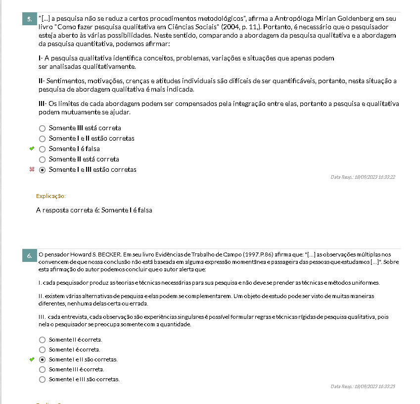 A pesquisa qualitativa identifica conceitos, problemas, variações e situações que apenas podem ser analisadas qualitativamente. Sentimentos, motivações, crenças e atítudes individuais são difíceis de ser quantificáveis, portanto, nesta situação a pesquisa de abordagem qualitativa é mais III- Os de cada abordagem podem ser compensados pela integração entre elas, portanto a pesquisa e qualitativa podem mutuamente se ajudar Somente III está correta Somente e estão corretas Somente é falsa Somente está correta Somente e III estão corretas