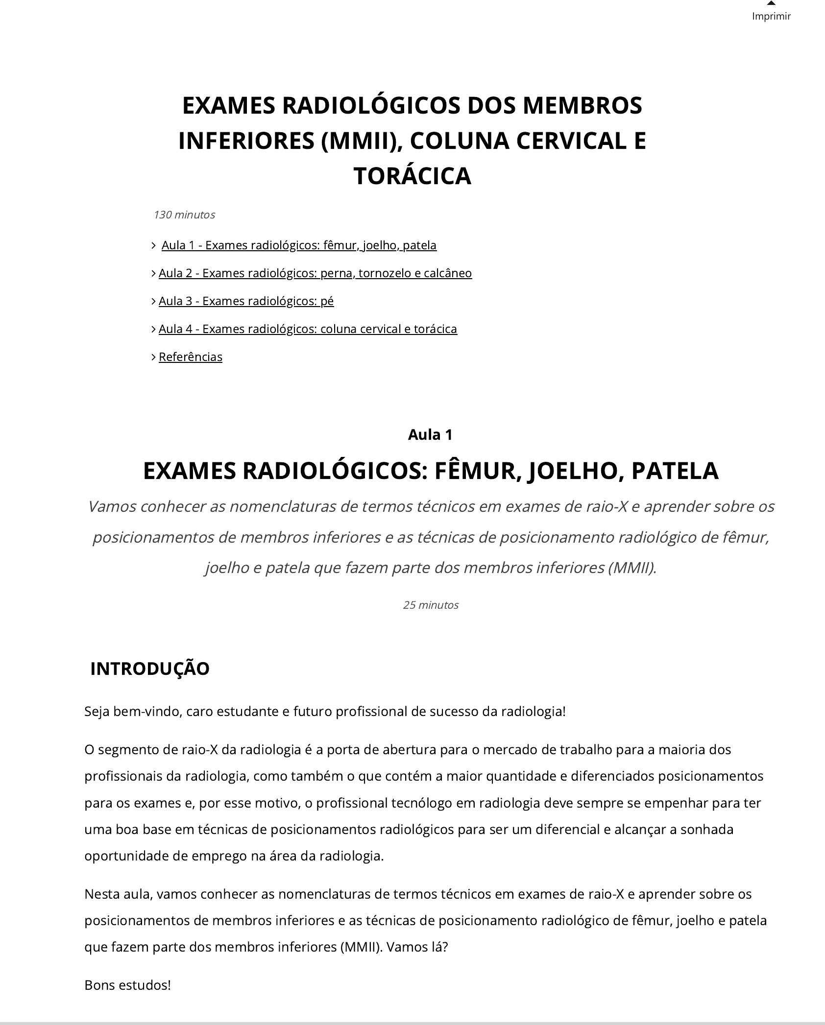 01/09/2023, 14:58 wlldd_231_u3_rad_conv https://www.colaboraread.com.br/integracaoAlgetec/index?usuarioEmail=eldasilva2791%40gmail.com&usuarioNome=ELDA+DA+SILVA+CARVALHO&disciplinaDescricao=&atividadeId=3679009&atividadeDescrica… 1/47 Imprimir INTRODUÇÃO Seja bem-vindo, caro estudante e futuro pro�ssional de sucesso da radiologia! O segmento de raio-X da radiologia é a porta de abertura para o mercado de trabalho para a maioria dos pro�ssionais da radiologia, como também o que contém a maior quantidade e diferenciados posicionamentos para os exames e, por esse motivo, o pro�ssional tecnólogo em radiologia deve sempre se empenhar para ter uma boa base em técnicas de posicionamentos radiológicos para ser um diferencial e alcançar a sonhada oportunidade de emprego na área da radiologia. Nesta aula, vamos conhecer as nomenclaturas de termos técnicos em exames de raio-X e aprender sobre os posicionamentos de membros inferiores e as técnicas de posicionamento radiológico de fêmur, joelho e patela que fazem parte dos membros inferiores (MMII). Vamos lá? Bons estudos! Aula 1 EXAMES RADIOLÓGICOS: FÊMUR, JOELHO, PATELA Vamos conhecer as nomenclaturas de termos técnicos em exames de raio-X e aprender sobre os posicionamentos de membros inferiores e as técnicas de posicionamento radiológico de fêmur, joelho e patela que fazem parte dos membros inferiores (MMII). 25 minutos EXAMES RADIOLÓGICOS DOS MEMBROS INFERIORES (MMII), COLUNA CERVICAL E TORÁCICA Aula 1 - Exames radiológicos: fêmur, joelho, patela Aula 2 - Exames radiológicos: perna, tornozelo e calcâneo Aula 3 - Exames radiológicos: pé Aula 4 - Exames radiológicos: coluna cervical e torácica Referências 130 minutos 01/09/2023, 14:58 wlldd_231_u3_rad_conv https://www.colaboraread.com.br/integracaoAlgetec/index?usuarioEmail=eldasilva2791%40gmail.com&usuarioNome=ELDA+DA+SILVA+CARVALHO&disciplinaDescricao=&atividadeId=3679009&atividadeDescrica… 2/47 INCIDÊNCIAS E PRINCIPAIS TERMOS TÉCNICOS DA SALA DE EXAMES Caro estudante, os exames de membros inferiores (MMII) são muito solicitados no diagnóstico por imagem, principalmente pelo motivo de fazerem parte da sustentação do nosso corpo. Antes de entrarmos com ênfase nos posicionamentos, é importante relembrarmos as nomenclaturas e a anatomia de cada parte que será realizada o exame. Vamos lá? Incidências radiológicas A incidência radiológica é a indicação do caminho do feixe de raio X, ou seja, ela indica a direção por onde ele é inserido até a sua saída. Saber o nome completo de cada uma das incidências e suas siglas é de suma importância, pois torna o trabalho do tecnólogo em radiologia mais ágil e previne erros de posicionamento e incidências. Veja abaixo a nomenclatura das principais incidências e suas siglas correspondentes. AP – Anteroposterior. PA – Póstero-anterior. P – Per�l. O – Oblíqua. OAD – Oblíqua Anterior Direita. OAE – Oblíqua Anterior Esquerda. OPD – Oblíqua Posterior Direita. OPE – Oblíqua Posterior Esquerda. Termos técnicos da sala de exames do raio-X A sala de exames é o local onde colocamos em prática todas as técnicas de posicionamento e realizamos os exames e suas incidências. O raio central é o feixe de raio X conhecido como RC, já a mesa e a estativa, utilizamos para os exames e ambas possuem linhas que nos auxiliam para o alinhamento adequado da estrutura a ser radiografada do paciente, com os chassis/receptores de imagens. Veja abaixo as siglas e o nome completo do raio central e das linhas de referência para alinhamento do exame: RC – Raio Central. LCM – Linha Central da Mesa. LCE – Linha Central da Estativa. Utilização do bucky O bucky é a gaveta que �ca uma abaixo da mesa e outra abaixo da estativa, para a realização de exames. Você deve se perguntar: é obrigatório utilizar o bucky? Se sim, quando devo ou não utilizar o bucky? Respondendo às suas perguntas: é obrigatório sim para a qualidade do exame, e uma ótima dica que sempre utilizo é a seguinte: 01/09/2023, 14:58 wlldd_231_u3_rad_conv https://www.colaboraread.com.br/integracaoAlgetec/index?usuarioEmail=eldasilva2791%40gmail.com&usuarioNome=ELDA+DA+SILVA+CARVALHO&disciplinaDescricao=&atividadeId=3679009&atividadeDescrica… 3/47 estruturas com espessura abaixo de 10 cm não utilizar o bucky, estruturas acima de 10 cm de espessura utilizar o bucky. Quanto maior a estrutura a ser radiografada, acima de 10 cm, é preciso do bucky para garantir a qualidade da imagem do exame. Não encontramos em todas as instituições o espessômetro para saber a medida exata das estruturas, porém através da observação delas conseguimos saber aproximadamente se possuem ou não a espessura para a utilização do bucky. Ossos dos membros inferiores - MMII O esqueleto humano tem a sua divisão em duas grandes partes: o esqueleto axial e o apendicular (esse último formado pelos membros). Os membros inferiores têm a função de garantir a locomoção, o equilíbrio e a sustentação do corpo. Os números de ossos totais dos MMII são de 62 ossos conectados no osso axial, através da cintura pélvica. POSICIONAMENTOS RADIOLÓGICOS: FÊMUR AP / PERFIL E JOELHO AP Incidências radiológicas do fêmur Fêmur AP Posicionamento do paciente: • Paciente em decúbito dorsal. • O fêmur deve ser centralizado na linha central da mesa (LCM). • Oferecer um travesseiro para o paciente colocar abaixo da cabeça. • Alinhar o fêmur para RC e a linha central da mesa (LCM). • Rodar a perna internamente aproximadamente 5° para uma AP verdadeira, como para um AP de joelho. Colimação: • Incluir as articulações por completo: coxofemoral e joelho. RC: • Centralizar em diá�se do fêmur. Veja na Figura 1 o posicionamento e na Figura 2 o exame �nalizado de fêmur em AP. Figura 1 | Posicionamento de fêmur em AP 01/09/2023, 14:58 wlldd_231_u3_rad_conv https://www.colaboraread.com.br/integracaoAlgetec/index?usuarioEmail