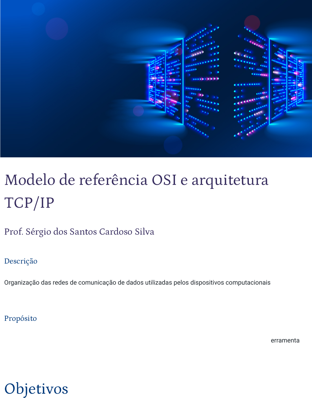 17/08/2023, 19:54 Modelo de referência OSI e arquitetura TCP/IP https://stecine.azureedge.net/repositorio/00212ti/00016/index.html# 1/39 Modelo de referência OSI e arquitetura TCP/IP Prof. Sérgio dos Santos Cardoso Silva Descrição Organização das redes de comunicação de dados utilizadas pelos dispositivos computacionais e os modelos e arquiteturas de redes empregados. Propósito Reconhecer como as redes de computadores estão organizadas e estruturadas para definir as ferramentas adequadas ao processo de troca de dados entre todos os dispositivos. Objetivos 17/08/2023, 19:54 Modelo de referência OSI e arquitetura TCP/IP https://stecine.azureedge.net/repositorio/00212ti/00016/index.html# 2/39 Módulo 1 Divisão da estrutura das redes em camadas Identificar o objetivo da divisão da estrutura das redes em camadas. Módulo 2 Camadas do modelo OSI Identificar as camadas do modelo OSI e suas funcionalidades. Módulo 3 Camadas da arquitetura TCP/IP Identificar as camadas da arquitetura TCP/IP e suas funcionalidades. Introdução Uma infinidade de serviços é oferecida por meio da internet, por exemplo, os governamentais, financeiros, educacionais, entre muitos outros que mudaram o comportamento humano. Ao ficarmos sem acesso à internet, sentimos como se estivéssemos em uma ilha deserta. Experimente colocar seu smartphone em modo avião durante um dia e perceba como se sentirá isolado. 17/08/2023, 19:54 Modelo de referência OSI e arquitetura TCP/IP https://stecine.azureedge.net/repositorio/00212ti/00016/index.html# 3/39 Mas, para que todos esses serviços possam funcionar, um conjunto de funcionalidades complexas e difíceis de implementar deve ser disponibilizado pelos dispositivos que compõem uma rede. Portanto, desde o início das redes de comunicação de dados, foram pensadas formas de otimizar o processo da transmissão de dados. 1 - Divisão da estrutura das redes em camadas Ao �nal deste módulo, você será capaz de identi�car o objetivo da divisão da estrutura das redes em camadas. 17/08/2023, 19:54 Modelo de referência OSI e arquitetura TCP/IP https://stecine.azureedge.net/repositorio/00212ti/00016/index.html# 4/39 Vamos começar! Arquitetura em camadas Modelo em camadas A internet é um conjunto de redes de computadores que permite a troca de informações entre dispositivos computacionais. Para que essa troca seja realizada de forma eficiente, devem ser estabelecidas regras de comunicação. Essas regras são os protocolos de rede, que devem garantir que a comunicação ocorra de forma confiável, segura, eficaz, no momento certo e para a pessoa certa. De maneira intuitiva, percebemos que satisfazer a todos esses requisitos não é uma tarefa fácil. São muitas regras que devem ser implementadas para garantir a efetividade da comunicação, tornando o processo de troca de dados entre computadores uma tarefa extremamente complexa. Por causa dessa complexidade, os engenheiros e projetistas de redes do passado pensaram em formas de facilitar o desenvolvimento das regras nos dispositivos computacionais. Eles utilizaram um princípio básico de resolução de diversos outros problemas: a técnica de dividir para conquistar. Na técnica dividir para conquistar, os projetistas dividem o problema em problemas menores e resolvem cada um de forma isolada. Se cada pequeno problema for resolvido, o grande problema será resolvido. 17/08/2023, 19:54 Modelo de referência OSI e arquitetura TCP/IP https://stecine.azureedge.net/repositorio/00212ti/00016/index.html# 5/39 Para que essa divisão ocorresse de forma simplificada, os projetistas dividiram a organização das redes de computadores em camadas, sendo cada camada responsável por cuidar de determinada regra ou protocolo necessário ao processo de comunicação. A quantidade de camadas utilizadas depende de como as funcionalidades são divididas. Quanto maior a divisão, maior o número de camadas que serão empilhadas, numerando da mais baixa, camada 1, para a mais alta, camada n. As camadas se inter-relacionam da seguinte maneira: a camada superior utiliza os serviços oferecidos por outra imediatamente inferior, portanto, a camada 3 utiliza os serviços oferecidos pela camada 2. De forma contrária, podemos dizer que a camada inferior oferece serviços para outra imediatamente superior, logo, a camada 2 oferece serviços para a camada 3. Elementos da camada As camadas são formadas por três elementos principais: Serviço É o conjunto de funcionalidades que uma determinada camada oferece. Por exemplo, uma camada pode ser responsável pela verificação de erros na transmissão, por determinar o endereço de um computador, entre outras funcionalidades. O serviço diz o que a camada faz e não como ela faz. Protocolo Responsável por como a camada faz. Assim, o protocolo é a implementação do serviço da camada, ou seja, executa as regras para que os erros possam ser corrigidos ou para que um computador possa ser identificado. "Um conjunto de camadas e protocolos é a arquitetura de rede e o conjunto de protocolos utilizados por determinado sistema é uma pilha de protocolos." (TANENBAUM, 2011, p. 38) 17/08/2023, 19:54 Modelo de referência OSI e arquitetura TCP/IP https://stecine.azureedge.net/repositorio/00212ti/00016/index.html# 6/39 Interface Para que uma camada possa utilizar a camada imediatamente inferior, é necessário que haja um ponto de comunicação entre ambas, chamado interface. Por meio dela, uma camada pode utilizar o serviço de outra, passando informações para a camada vizinha. Os elementos da camada Onde, exatamente, tudo isso é implementado no computador? O que está implementado são os protocolos e interfaces, que podem estar desenvolvidos em um hardware, como uma placa de rede, ou em um software, como no sistema operacional da máquina. Agora que os elementos da camada foram apresentados, é possível entender dois conceitos importantes da arquitetura de redes: Comunicação Vertical e Co