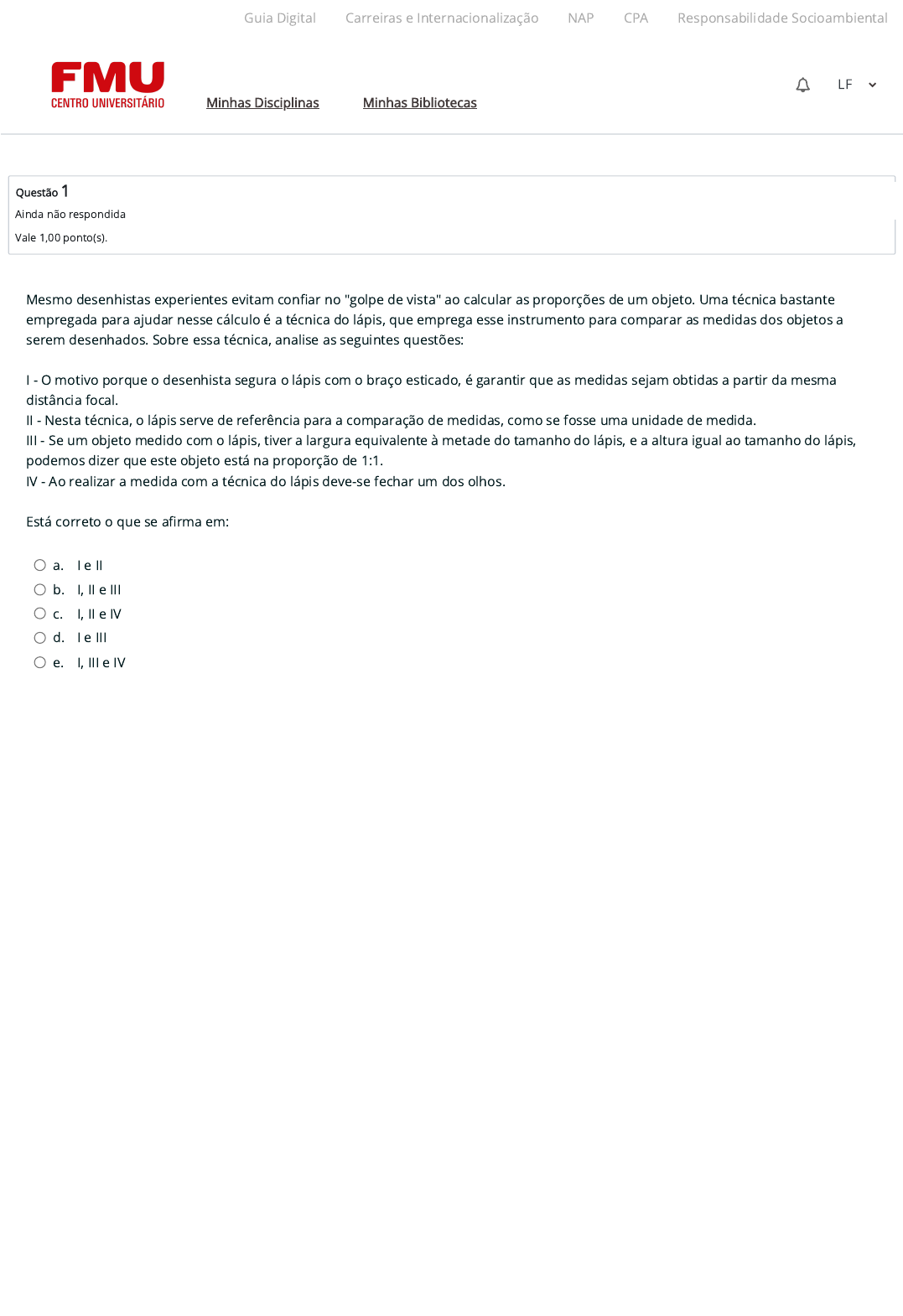 17/09/2023, 21:42 Atividade 2 (A2) https://ambienteacademico.com.br/mod/quiz/attempt.php?attempt=2870881&cmid=1095810 1/7 Questão 1 Ainda não respondida Vale 1,00 ponto(s). Mesmo desenhistas experientes evitam con�ar no "golpe de vista" ao calcular as proporções de um objeto. Uma técnica bastante empregada para ajudar nesse cálculo é a técnica do lápis, que emprega esse instrumento para comparar as medidas dos objetos a serem desenhados. Sobre essa técnica, analise as seguintes questões: I - O motivo porque o desenhista segura o lápis com o braço esticado, é garantir que as medidas sejam obtidas a partir da mesma distância focal. II - Nesta técnica, o lápis serve de referência para a comparação de medidas, como se fosse uma unidade de medida. III - Se um objeto medido com o lápis, tiver a largura equivalente à metade do tamanho do lápis, e a altura igual ao tamanho do lápis, podemos dizer que este objeto está na proporção de 1:1. IV - Ao realizar a medida com a técnica do lápis deve-se fechar um dos olhos. Está correto o que se a�rma em: a. I e II b. I, II e III c. I, II e IV d. I e III e. I, III e IV Guia Digital Carreiras e Internacionalização NAP CPA Responsabilidade Socioambiental Minhas Disciplinas Minhas Bibliotecas LF https://codely-fmu-content.s3.amazonaws.com/Moodle/GuiaDigital/Guia+digital/index.html https://carreiras.fmu.br/ https://codely-fmu-content.s3.amazonaws.com/Moodle/NAP/inicial/nap/fmu/index.html https://codely-fmu-content.s3.amazonaws.com/Moodle/CPA/landing_CPA/index.html https://portal.fmu.br/sustentabilidade https://ambienteacademico.com.br/ https://ambienteacademico.com.br/ https://ambienteacademico.com.br/course/view.php?id=236 17/09/2023, 21:42 Atividade 2 (A2) https://ambienteacademico.com.br/mod/quiz/attempt.php?attempt=2870881&cmid=1095810 2/7 Questão 2 Ainda não respondida Vale 1,00 ponto(s). Questão 3 Ainda não respondida Vale 1,00 ponto(s). Observe a fotogra�a e o desenho abaixo: Fotogra�a: fcafotodigital / 123RF https://www.istockphoto.com/br/foto/copo-de-vinho-e-aberta-meia-garrafa-de-vinho-completo-gm925732144-254030525 / Desenho: Marcio Lopes Com base na análise da fotogra�a e do desenho acima, em relação à proporção, classi�que as seguintes a�rmativas como verdadeiras ou falsas. I - O desenho está proporcional, ou seja, as relações entre as medidas foram mantidas. II - O desenho da garrafa está desproporcional, pois a relação entre a largura e a altura está incorreta. III - No desenho da taça, a proporção entre a haste e o bojo está incorreta. IV - Em relação à altura, a proporção entre a garrafa e a taça está correta, mas em relação à largura não. A sequência correta é a que consta da alternativa: a. F, V, V, V b. V, V, F, F c. V, F, V, F d. F. V, F, V e. V, F, F, V O valor matemático da proporção áurea equivale a, aproximadamente, 1,6180. Esse é o chamado número áureo. Ele é representado pela letra grega phi, em homenagem ao matemático grego Phideas. Sobre o número áureo analise as a�rmativas abaixo: I - No segmento áureo, o valor 1,6180 é obtido dividindo o segmento maior pelo menor e a reta inteira pelo segmento maior. II - A divisão do valor da reta inteira pelo valor do segmento menor resulta em 1,6180. III - O número áureo foi descoberto pelo matemático italiano Leonardo Fibonacci. IV - Se, no segmento áureo, o valor do segmento maior for 21, o valor do segmento menor será próximo de 13. A alternativa que contém as a�rmativas corretas é: a. II, III e IV b. I, II e IV c. I, II e III d. I e IV e. I e III Guia Digital Carreiras e Internacionalização NAP CPA Responsabilidade Socioambiental Minhas Disciplinas Minhas Bibliotecas LF https://codely-fmu-content.s3.amazonaws.com/Moodle/GuiaDigital/Guia+digital/index.html https://carreiras.fmu.br/ https://codely-fmu-content.s3.amazonaws.com/Moodle/NAP/inicial/nap/fmu/index.html https://codely-fmu-content.s3.amazonaws.com/Moodle/CPA/landing_CPA/index.html https://portal.fmu.br/sustentabilidade https://ambienteacademico.com.br/ https://ambienteacademico.com.br/ https://ambienteacademico.com.br/course/view.php?id=236 17/09/2023, 21:42 Atividade 2 (A2) https://ambienteacademico.com.br/mod/quiz/attempt.php?attempt=2870881&cmid=1095810 3/7 Questão 4 Ainda não respondida Vale 1,00 ponto(s). Observe a �gura: Figura: Fachada da catedral de Notre-Dame Fonte: ELAM, K. Geometria do Design: estudos sobre proporção e composição. Tradução: Claudio Marcondes. São Paulo: Cosac Naify, 2010, p. 21 A imagem acima mostra o emprego da proporção áurea no desenho da catedral de Notre-Dame em Paris, cuja construção teve início no ano de 1.163. Com base na observação da imagem e no conteúdo estudado, analise as seguintes questões: I - A fachada da catedral de Notre-Dame é composta por vários retângulos áureos. II - O quadrado circunscrito no retângulo áureo dita a forma da maior parte da fachada, que �ca abaixo das torres. III - A linha que corta o centro do círculo existente na região central da fachada divide o lado do quadrado na proporção áurea. IV - A fachada da catedral de Notre-Dame é perfeitamente simétrica, por isso ela é uma exemplo do uso da proporção áurea na arquitetura. Está correto o que se a�rma em: a. II e IV b. II e III c. I, II e III d. II, III e IV e. I e II Guia Digital Carreiras e Internacionalização NAP CPA Responsabilidade Socioambiental Minhas Disciplinas Minhas Bibliotecas LF https://codely-fmu-content.s3.amazonaws.com/Moodle/GuiaDigital/Guia+digital/index.html https://carreiras.fmu.br/ https://codely-fmu-content.s3.amazonaws.com/Moodle/NAP/inicial/nap/fmu/index.html https://codely-fmu-content.s3.amazonaws.com/Moodle/CPA/landing_CPA/index.html https://portal.fmu.br/sustentabilidade https://ambienteacademico.com.br/ https://ambienteacademico.com.br/ https://ambienteacademico.com.br/course/view.php?id=236 17/09/2023, 21:42 Atividade 2 (A2) https://ambientea