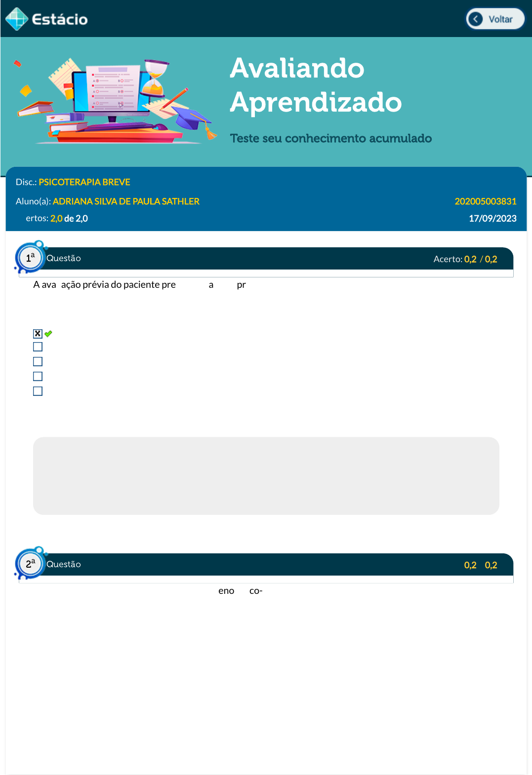 Avaliando Aprendizado Teste seu conhecimento acumulado Disc.: PSICOTERAPIA BREVE Aluno(a): ADRIANA SILVA DE PAULA SATHLER 202005003831 Acertos: 2,0 de 2,0 17/09/2023 Acerto: 0,2 / 0,2 A avaliação prévia do paciente precisa ser a mais profunda possível no caso de processos de psicoterapia breve, utilizando dados das entrevistas, testes e também exames de outros pro�ssionais, mas não deve soar como um interrogatório. Sobre essa fase inicial, é importante: Examinar as capacidades egóicas A livre expressão e atenção �utuante Basicamente esteja medicado Certi�car-se que o paciente já passou por algum atendimento psicoterápico Tenha um diagnóstico psiquiátrico Respondido em 17/09/2023 13:40:22 Explicação: Fundamental avaliar as capacidades egóicas - seus aspectos adultos e faculdades básicas, como memória, inteligência, atenção, raciocínio, percepção. Associação livre do paciente e atenção �utuante do analista são propostas da psicanálise. Não há necessidade de ter sido atendido no passado; nem chegar com diagnóstico ou medicado, pois podem ser encaminhados paralelamente havendo necessidade Acerto: 0,2 / 0,2 Segundo a psicoterapia breve de base fenomenológico-existencial, a existência é vista como a evolução da pessoa durante seu tempo de vida. A vida é entendida como um �uxo onde as manifestações do comportamento latente, dá conta da expressão da essência através do comportamento observável. Dentro desse enfoque, avalie as a�rmações. I. Para Heidegger, a existência é ser no tempo. II. O futuro está eternizado e representa o que a pessoa foi. Não muda mais. III. O processo terapêutico fenomenológico-existencial visa a correção das falhas de interpretação do real que levaram ao sofrimento. É correto o que se a�rma em: Questão1 a Questão2 a https://simulado.estacio.br/alunos/inicio.asp javascript:voltar(); II e III, apenas. I, II e III. I, apenas. II, apenas. I e III, apenas. Respondido em 17/09/2023 14:18:48 Explicação: Como a existência é ser no tempo. O passado está eternizado e representa o que a pessoa foi. Não muda mais. Então, o que muda é o entendimento sobre o ocorrido, e uma correção das falhas que levaram ao sofrimento. A a�rmativa II é falsa. As a�rmativas I e III são verdadeiras. Acerto: 0,2 / 0,2 Na abordagem psicanalítica breve, observa-se que há convergências com a psicanálise tradicional e singularidades que levam em consideração a brevidade de tempo e o estabelecimento de um contexto focal. Considerando as a�rmativas abaixo, avalie cada uma sobre se é verdadeira ou falsa. Em seguida marque a única opção de resposta verdadeira. FONTE: QUINET, A. (1991) As 4 + 1 Condições da Análise. 8ª Edição, Rio de Janeiro: Jorge Zahar Editores. I - Na avaliação inicial o psicoterapeuta deve promover a fala do paciente de modo que possa saber se sua técnica é adequada à demanda trazida por ele. II - Para Freud, a etapa da avaliação inicial tem como objetivo estabelecer uma ligação entre o paciente e seu processo terapêutico e à pessoa do analista (Quinet, 1991). III - Quinet (1991) apresenta três funções das entrevistas iniciais. A primeira, é a função sintomal indicando que a demanda não deve ser aceita em sua forma bruta como descrita. A segunda, é a função prognóstica que diz respeito à estimativa de sucesso do processo terapêutico. E a terceira função é a função contra transferencial que libera o terapeuta para interferir na fala do paciente promovendo o contexto para o curso da terapia ser de fato breve. São verdadeiras ambas I e II e a a�rmativa III é falsa. Apenas as a�rmativas II e III são verdadeiras. Apenas as a�rmativas I e III são verdadeiras. Apenas a a�rmativa I é verdadeira. Apenas a a�rmativa II é verdadeira. Respondido em 17/09/2023 14:20:26 Explicação: É verdadeiro que na avaliação inicial o psicoterapeuta deve promover a fala do paciente e que a etapa da avaliação inicial tem como objetivo estabelecer uma ligação entre o paciente e seu processo terapêutico. Contudo Quinet (1991) apresenta três funções das entrevistas iniciais. A primeira, é a função sintomal (sinto-mal). Refere-se a que a demanda não deve ser aceita em sua forma bruta como descrita. Deve passar pelo crivo do analista que com sua experiência destacará os sintomas relevantes para o mal-estar do paciente. A segunda, é a função diagnóstica que diz respeito ao enquadramento em categorias adequadas para �ns de encontrar melhores modos de lidar com o sofrimento do paciente. E, por �m, a terceira função é a função transferencial. Questão3 a Acerto: 0,2 / 0,2 Pensamentos sobre morte e ideações suicidas fazem parte do conjunto de sintomas que podem estar presentes em uma pessoa com depressão. Qual o procedimento recomendado, caso seja observado este sintoma em um paciente? Avaliar o potencial desta ideação e coloca-lo como objetivo principal e imediato visando diminuir o risco do paciente. Buscar o principal problema em alguma área da vida que pode motivando tais pensamentos. Evitar o tema para que não corra o risco de incentiva-lo. Deixar o paciente à vontade para continuar no tema se desejar . Interromper imediatamente o tratamento e encaminhar a um psiquiatra. Respondido em 17/09/2023 14:36:53 Explicação: Ao identi�car um mínimo traço de humor deprimido em seu paciente veri�que já na primeira sessão se existem ideações suicidas, e caso haja avalie a intensidade deste ideação e atue neste tema visando mitigar esta ideação suicida. Abordar o tema suicídio, desde que feito com respeito e acolhimento, não incentiva o paciente a faze-lo. Acerto: 0,2 / 0,2 Em se tratando de Psicoterapia Breve, que tem como principais características se focal e tempo limitado de tratamento, como pode-se entender a prática de avaliação psicológica e o planejamento terapêutico com relação a efeitos iatrogênicos? Não ex