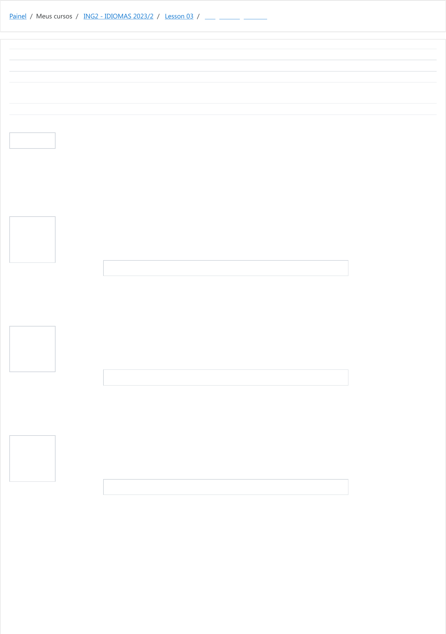 Painel / Meus cursos / ING2 - IDIOMAS 2023/2 / Lesson 03 / "-ing" Ending Sounds Informação Questão 1 Correto Atingiu 1,00 de 1,00 Questão 2 Correto Atingiu 1,00 de 1,00 Questão 3 Correto Atingiu 1,00 de 1,00 Iniciado em terça, 19 set 2023, 10:28 Estado Finalizada Concluída em terça, 19 set 2023, 10:32 Tempo empregado 3 minutos 46 segundos Notas 15,00/15,00 Avaliar 10,00 de um máximo de 10,00(100%) You studied that when you have the suffix "-ing" at the end of a word, the letter "g" is not pronounced. Listen to the words and write them according to what you hear. Resposta: working A resposta correta é: working Resposta: living A resposta correta é: living Resposta: studying A resposta correta é: studying https://moodle.ifsul.edu.br/novohamburgo/my/ https://moodle.ifsul.edu.br/novohamburgo/course/view.php?id=357 https://moodle.ifsul.edu.br/novohamburgo/course/view.php?id=357#section-5 https://moodle.ifsul.edu.br/novohamburgo/mod/quiz/view.php?id=56696 Questão 4 Correto Atingiu 1,00 de 1,00 Questão 5 Correto Atingiu 1,00 de 1,00 Questão 6 Correto Atingiu 1,00 de 1,00 Questão 7 Correto Atingiu 1,00 de 1,00 Questão 8 Correto Atingiu 1,00 de 1,00 Questão 9 Correto Atingiu 1,00 de 1,00 Resposta: cooking A resposta correta é: cooking Resposta: speaking A resposta correta é: speaking Resposta: walking A resposta correta é: walking Resposta: reading A resposta correta é: reading Resposta: writing A resposta correta é: writing Resposta: listening A resposta correta é: listening Questão 10 Correto Atingiu 1,00 de 1,00 Questão 11 Correto Atingiu 1,00 de 1,00 Questão 12 Correto Atingiu 1,00 de 1,00 Questão 13 Correto Atingiu 1,00 de 1,00 Questão 14 Correto Atingiu 1,00 de 1,00 Questão 15 Correto Atingiu 1,00 de 1,00 Resposta: riding A resposta correta é: riding Resposta: finding A resposta correta é: finding Resposta: drinking A resposta correta é: drinking Resposta: asking A resposta correta é: asking Resposta: calling A resposta correta é: calling Resposta: watching A resposta correta é: watching ◄ Routine in the Past Seguir para... I lost my wallet ► https://moodle.ifsul.edu.br/novohamburgo/mod/quiz/view.php?id=56694&forceview=1 https://moodle.ifsul.edu.br/novohamburgo/mod/url/view.php?id=56697&forceview=1