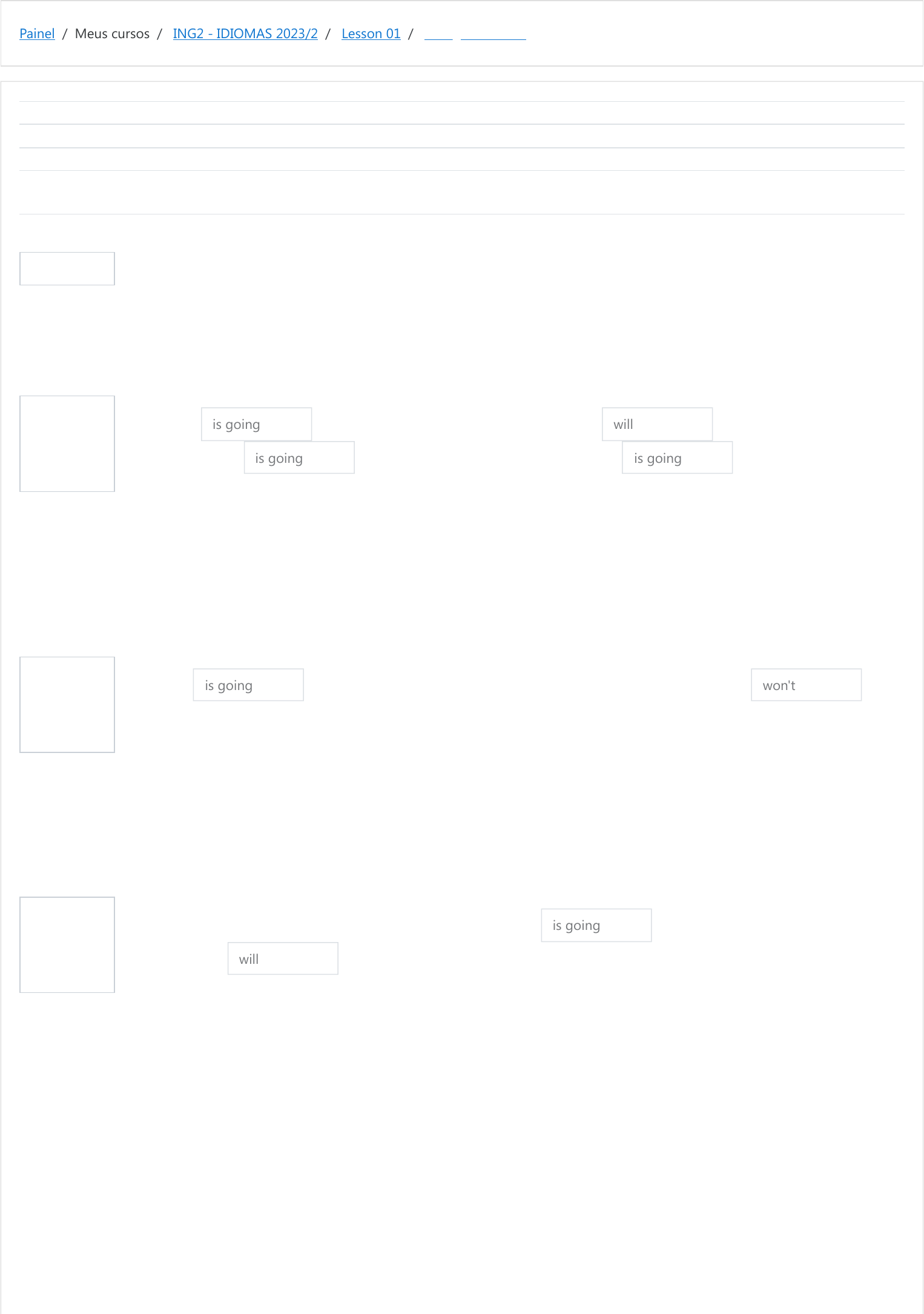 Painel / Meus cursos / ING2 - IDIOMAS 2023/2 / Lesson 01 / Going to or Will? Informação Questão 1 Correto Atingiu 2,00 de 2,00 Questão 2 Correto Atingiu 2,00 de 2,00 Questão 3 Correto Atingiu 2,00 de 2,00 Iniciado em terça, 19 set 2023, 08:54 Estado Finalizada Concluída em terça, 19 set 2023, 08:57 Tempo empregado 3 minutos 4 segundos Avaliar 10,00 de um máximo de 10,00(100%) Read the texts and complete them with Going to or Will using the correct form - affirmative, negative or interrogative. Carlton to Canada. He goes on board and when he take his seat he meets Bruno. Carlton to attend his father's funeral and Bruno to study in Vancouver. is going will is going is going A resposta correta é: Carlton [is going] to Canada. He goes on board and when he [will] take his seat he meets Bruno. Carlton [is going] to attend his father's funeral and Bruno [is going] to study in Vancouver. Bruno to study and probably visit many interesting places. However, Carlton have time to do it. is going won't A resposta correta é: Bruno [is going] to study and probably visit many interesting places. However, Carlton [won't] have time to do it. Bruno got a little embarrassed when he discovered why Carlton to take that flight and suddenly he thinks: "I be sympathetic and talk about when I lost my grandpa". is going will A resposta correta é: Bruno got a little embarrassed when he discovered why Carlton [is going] to take that flight and suddenly he thinks: "I [will] be sympathetic and talk about when I lost my grandpa". https://moodle.ifsul.edu.br/novohamburgo/my/ https://moodle.ifsul.edu.br/novohamburgo/course/view.php?id=357 https://moodle.ifsul.edu.br/novohamburgo/course/view.php?id=357#section-3 https://moodle.ifsul.edu.br/novohamburgo/mod/quiz/view.php?id=56652 Questão 4 Correto Atingiu 2,00 de 2,00 Questão 5 Correto Atingiu 2,00 de 2,00 Carlton: I got a phone call from a girl saying she was my father's friend. At first, I thought to myself: you believe it Carlton? ... But she had pictures and letters from him. Bruno: to meet her? Carlton: I probably do it. will are you going will A resposta correta é: Carlton: I got a phone call from a girl saying she was my father's friend. At first, I thought to myself: [will] you believe it Carlton? ... But she had pictures and letters from him. Bruno: [are you going] to meet her? Carlton: I [will] probably do it. Carlton tells Bruno that he to stay long in Canada and be at B&B House. Bruno gave him his business card, but Carlton thinks he need it. is not going is going to won't A resposta correta é: Carlton tells Bruno that he [is not going] to stay long in Canada and [is going to] be at B&B House. Bruno gave him his business card, but Carlton thinks he [won't] need it. ◄ What are they going to do? Seguir para... Talking about the future ► https://moodle.ifsul.edu.br/novohamburgo/mod/quiz/view.php?id=56651&forceview=1 https://moodle.ifsul.edu.br/novohamburgo/mod/quiz/view.php?id=56653&forceview=1
