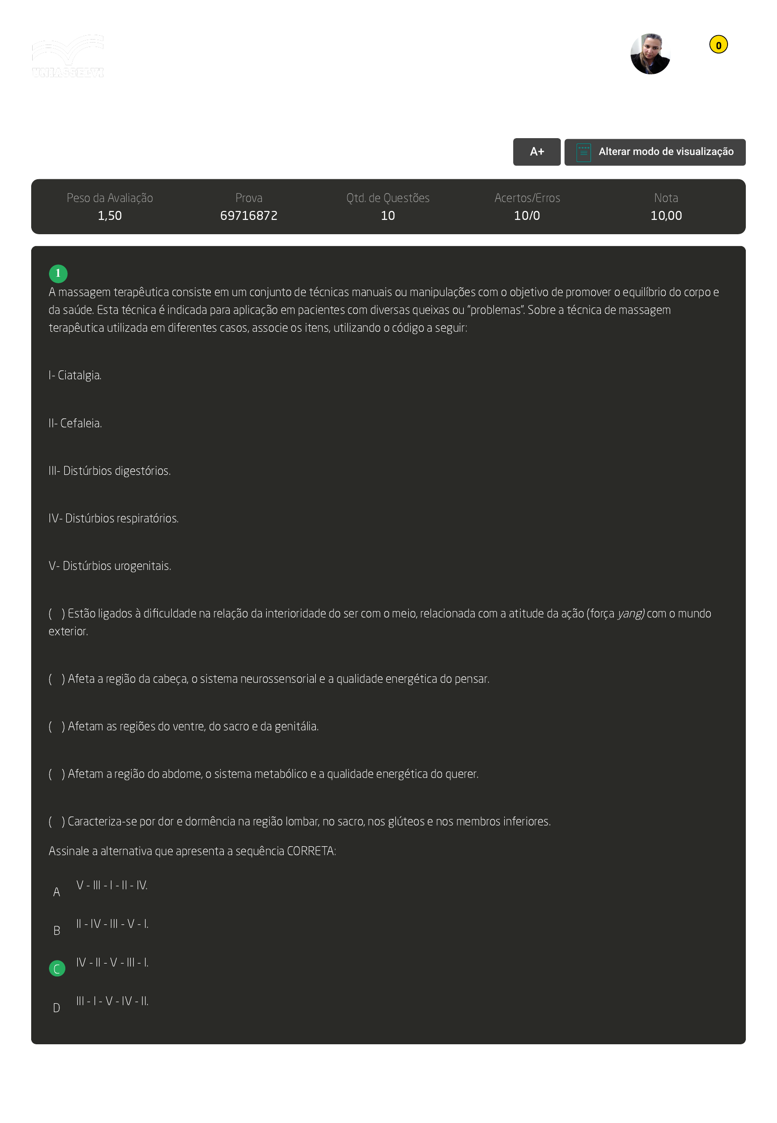 GABARITO | Avaliação I - Individual (Cod.:885252) Peso da Avaliação 1,50 Prova 69716872 Qtd. de Questões 10 Acertos/Erros 10/0 Nota 10,00 A massagem terapêutica consiste em um conjunto de técnicas manuais ou manipulações com o objetivo de promover o equilíbrio do corpo e da saúde. Esta técnica é indicada para aplicação em pacientes com diversas queixas ou “problemas”. Sobre a técnica de massagem terapêutica utilizada em diferentes casos, associe os itens, utilizando o código a seguir: I- Ciatalgia. II- Cefaleia. III- Distúrbios digestórios. IV- Distúrbios respiratórios. V- Distúrbios urogenitais. ( ) Estão ligados à dificuldade na relação da interioridade do ser com o meio, relacionada com a atitude da ação (força yang) com o mundo exterior. ( ) Afeta a região da cabeça, o sistema neurossensorial e a qualidade energética do pensar. ( ) Afetam as regiões do ventre, do sacro e da genitália. ( ) Afetam a região do abdome, o sistema metabólico e a qualidade energética do querer. ( ) Caracteriza-se por dor e dormência na região lombar, no sacro, nos glúteos e nos membros inferiores. Assinale a alternativa que apresenta a sequência CORRETA: A V - III - I - II - IV. B II - IV - III - V - I. C IV - II - V - III - I. D III - I - V - IV - II. VOLTAR A+ Alterar modo de visualização 1 Irene de Lima Kluppel Terapias Integrativas e Complementares (3889193) 0 O profissional terapeuta, ao realizar uma massagem relaxante, deve atentar-se em manter o cliente bem posicionado e confortável durante toda a sessão de massagem. Isso é fundamental para o sucesso do tratamento. Sobre as três posições mais comuns determinadas para massagem, assinale a alternativa CORRETA: A Decúbitos genopeitoral, dorsal e ventral. B Decúbitos ventral, dorsal e lateral. C Decúbitos pronal, ventral e dorsal. D Decúbitos supino, pronal e dorsal. Existem diferentes tipos de edema, e sua formação pode ocorrer por diversos fatores. Os mais comuns são por ficar em pé ou sentado por muito tempo, inatividade física, período menstrual ou pré-menstrual e gestação. Sobre as modificações durante o período gestacional, avalie as asserções a seguir e a relação proposta entre elas: I- O edema periférico é uma das manifestações mais comuns e duráveis nas grávidas. PORQUE II- A etiologia inclui a retenção de sódio e água, além das alterações circulatórias causadas pelo útero gravídico sobre a circulação da veia cava inferior. Assinale a alternativa CORRETA: A A asserção I é uma proposição verdadeira, e a II é uma proposição falsa. B As asserções I e II são proposições verdadeiras, mas a II não é uma justificativa da I. C As asserções I e II são proposições verdadeiras, e a II é uma justificativa da I. D A asserção I é uma proposição falsa, e a II é uma proposição verdadeira. Hipócrates (considerado o pai de medicina) viveu entre 460 e 370 antes de Cristo. Ele é considerado um dos homens mais importantes na história da medicina, sendo pioneiro em muitas descobertas. Sobre a história da massagem, avalie as asserções a seguir e a relação proposta entre elas: I- O filósofo Hipócrates associou a clareza das palavras, juntamente aos elementos (terra, ar, fogo e água) e à mobilidade dos tecidos, como uma maneira do corpo se curar ou de estimular a autocura. PORQUE II- Acreditava-se que ele se comunicava em segredo com os deuses. Assinale a alternativa CORRETA: A A asserção I é uma proposição verdadeira, e a II é uma proposição falsa. 2 3 4 Irene de Lima Kluppel Terapias Integrativas e Complementares (3889193) 0 B As asserções I e II são proposições verdadeiras, e a segunda é uma justificativa da I. C As asserções I e II são proposições falsas. D As asserções I e II são proposições verdadeiras, mas a II não é uma justificativa da I. A massagem manual pode ser empregada para fins estéticos, terapêuticos ou relaxantes, cada um dos métodos com suas manobras diferenciadas e efeitos adversos. Sobre os movimentos de massagem, avalie as asserções a seguir e a relação proposta entre elas: I- A manobra de trigger points é uma técnica sueca que realiza movimentos de deslizamentos sobre os tecidos. PORQUE II- Considerada um movimento de início da massagem, essa manobra pode ser superficial ou profunda. Assinale a alternativa CORRETA: A As asserções I e II são proposições falsas. B A asserção I é uma proposição verdadeira, e a II é uma proposição falsa. C As asserções I e II são proposições verdadeiras, e a II é uma justificativa da I. D As asserções I e II são proposições verdadeiras, mas a II não é uma justificativa da I. A gestação é um momento único na vida da mulher, exige muitas modificações físicas que acabam por, muitas vezes, sobrecarregar o corpo. Sobre como o profissional terapeuta pode intervir de forma segura e eficaz no cuidado com a gestante, analise as sentenças a seguir: I- É de suma importância que a gestante tenha a liberação do pai da criança, a fim de minimizar possíveis riscos inerentes ao estado de saúde. II- É fundamental que ocorra a escolha correta dos cosméticos antes de atender a gestante, até mesmo um planejamento específico para cada trimestre. III- É recomendado utilizar óleos vegetais e óleos essenciais para lubrificar e tratar a pele das gestantes, a fim de minimizar o aparecimento das estrias. Assinale a alternativa CORRETA: A As sentenças I e II estão corretas. B As sentenças I e III estão corretas. C As sentenças II e III estão corretas. D Somente a sentença II está correta. 5 6 Irene de Lima Kluppel Terapias Integrativas e Complementares (3889193) 0 As massagens possuem suas particularidades. Dentre elas, temos: a massagem relaxante, a massagem terapêutica e a massagem na gestão, cada uma com um objetivo específico de tratamento. Com base nesses três tipos, associe os itens, utilizando o código a seguir: 