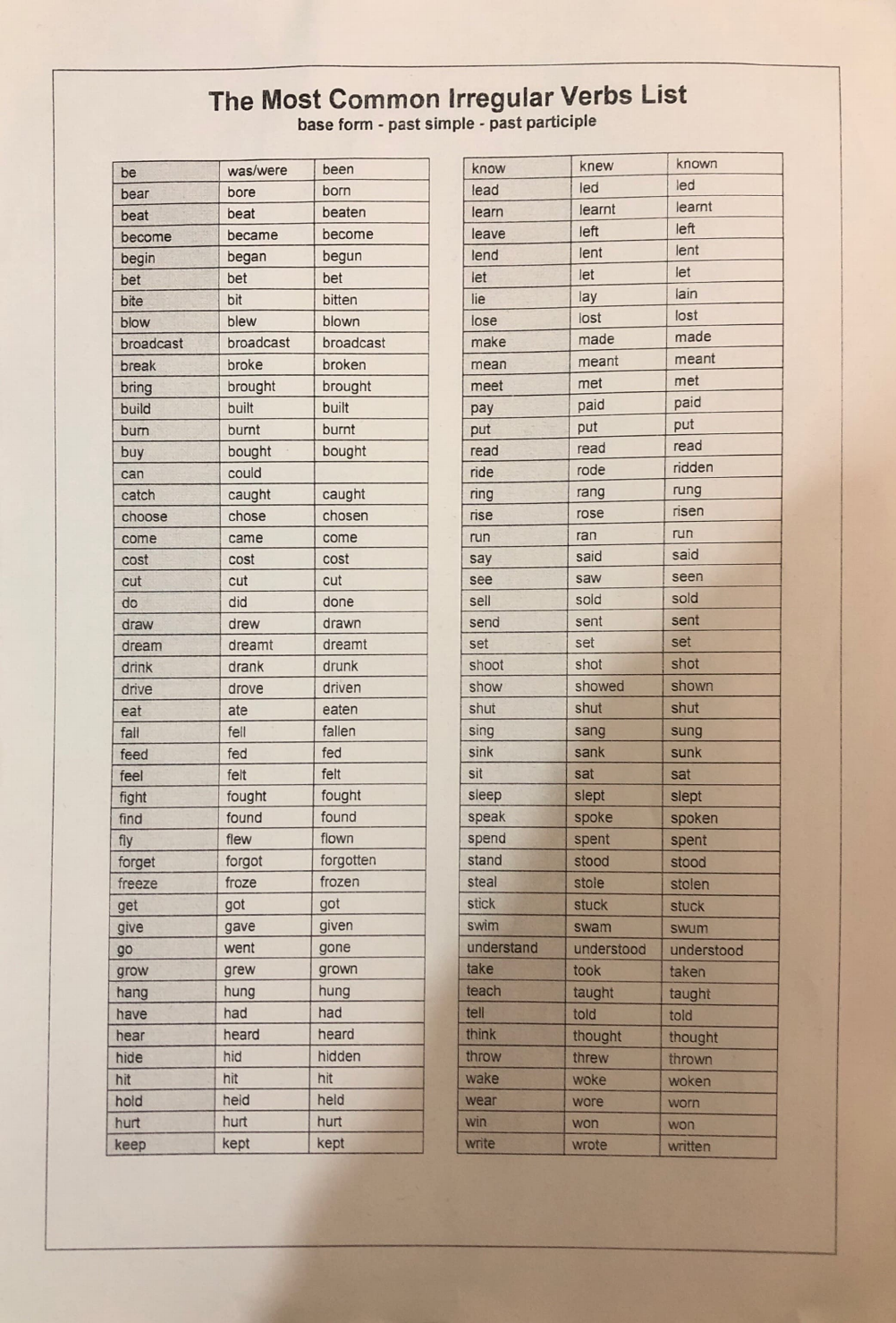 The Most Common Irregular Verbs List base form - past simple - past participle be was/were been know knew known bear bore born lead led led beat beat beaten learn learnt learnt become became become leave left left begin began begun lend lent lent bet bet bet let let let bite bit bitten lie lay lain blow blew blown lose lost lost broadcast broadcast broadcast make made made break broke broken mean meant meant bring brought brought meet met met build built built pay paid paid bum burnt burnt put put put buy bought bought read read read can could ride rode ridden catch caught caught ring rang rung choose chose chosen rise rose risen come came come run ran run cost cost cost say said said cut cut cut see saw seen do did done sell sold sold draw drew drawn send sent sent dream dreamt dreamt set set set drink drank drunk shoot shot shot drive drove driven show showed shown eat ate eaten shur shut shut fall fell fallen sing sang sung feed fed fed sink sank sunk feel felt felt sit sat sat fight fought fought sleep slept slept find found found speak spoke spoken fly flew flown spend spent spent forget forgot forgotten stand stood stood freeze froze frozen steal stole stolen get got got stick stuck stuck give gave given swim swam swum go went gone understand understood understood grow grew grown take took taken hang hung hung teach taught taught have had had tell told told hear heard heard think thought thought hide hid hidden throw threw thrown hit hit hit wake woke woken hold held held wear wore wom hurt hurt hurt win won won keep kept kept write wrote written saheedadeyemi Bookmarks