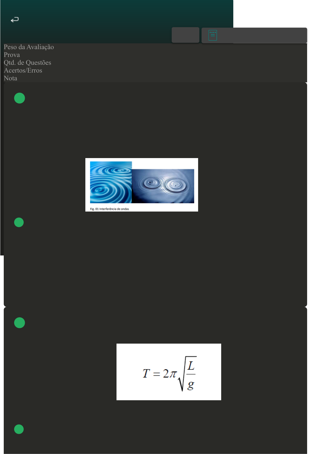 19/09/2023, 14:18 Avaliação I - Individual about:blank 1/4 Prova Impressa GABARITO | Avaliação I - Individual (Cod.:888370) Peso da Avaliação 1,50 Prova 69673496 Qtd. de Questões 10 Acertos/Erros 10/0 Nota 10,00 O fenômeno da interferência é típico de movimentos oscilatórios quando superpostos e, em particular, movimentos ondulatórios. Ele pode ocorrer com qualquer tipo de onda e se manifesta quando da superposição de duas ou mais ondas. Para observar tal efeito basta respingar água em alguns pontos de uma piscina contendo água. Com base nos estudos sobre os movimentos ondulatórios, a respeito do fenômeno da interferência, assinale a alternativa CORRETA: FONTE: https://edisciplinas.usp.br/pluginfile.php/190541/mod_resource/content/1/Interfer%C3%AAncia.pdf. Acesso em: 21 ago. 2020. A Quando duas ondas de mesma amplitude sofrem interferência destrutiva, ocorre aniquilação. B Quando duas ondas com amplitudes diferentes sofrem interferência construtiva, as amplitudes são somadas, e a onda resultante mantém o sentido de propagação da onda que possuía maior amplitude. C Na interferência destrutiva, as ondas encontram-se com fases iguais. D O fenômeno da interferência só ocorre com ondas unidimensionais. O período de oscilação de um pêndulo simples pode ser calculado pela equação demonstrada em anexo, onde L é o comprimento do pêndulo e g a aceleração da gravidade do local onde o pêndulo se encontra. Supondo que um relógio de pêndulo marca, na Terra, a hora exata, é correto afirmar que, se este relógio for levado para a Lua: A Seu comportamento é imprevisível, sem o conhecimento de sua massa. B Atrasará, pois o campo gravitacional lunar é diferente do terrestre. VOLTAR A+ Alterar modo de visualização 1 2 19/09/2023, 14:18 Avaliação I - Individual about:blank 2/4 C Não haverá alteração no seu período, pois o campo gravitacional lunar é igual ao campo gravitacional terrestre. D Não haverá alteração no período de seu pêndulo, pois o tempo na Lua passa da mesma maneira que na Terra. [Laboratório Virtual - Ondas Mecânicas] O comprimento de onda da luz emitida por um laser é de 735 nm no ar, onde a velocidade de propagação de ondas eletromagnéticas é de 3,0x108 m/s. Com base nessas informações, pode-se afirmar que a velocidade de propagação e a frequência da luz emitida por esse laser, em um meio onde o comprimento de onda é 540 nm, são, respectivamente: A 2,9 x 108 m/s e 5,55 x 1012 Hz. B 1,53 x 108 m/s e 1,96 x 1015Hz. C 2,20 x 108 m/s e 4,07 x 1014 Hz. D 1,36 x 108 m/s e 2,50 x 1014 Hz. Em uma mola ideal pendurada no teto, foi colocado um corpo de massa igual a 10 kg, que causou uma deformação na mola igual a 50 cm. Posteriormente, a massa de 10 kg foi substituída por uma massa de 12,5 kg. Nessa nova condição, o sistema foi posto para oscilar. Admitindo que a aceleração da gravidade g = 10 m/s2, assinale a alternativa CORRETA que apresenta o período de oscilação do movimento, considerando pi=3: A 2,25 segundos. B 3 segundos. C 1,5 segundos. D 2 segundos. O movimento harmônico simples é o movimento oscilatório ocorrido quando a aceleração e a força resultante são proporcionais e opostas ao deslocamento. A equação abaixo permite calcular o período do oscilador harmônico simples, quando conhecemos a massa e a constante elástica do sistema. Para o período do MHS, analise as seguintes afirmativas: I- Quanto maior a massa oscilante, maior será o período de oscilação e menor a frequência de oscilação. II- Quanto menor o valor da constante elástica da mola, menor será o período. III- A amplitude de oscilação não influencia no período de oscilação. Assinale a alternativa CORRETA: A Somente a afirmativa I está correta. 3 4 5 19/09/2023, 14:18 Avaliação I - Individual about:blank 3/4 B As afirmativas I e III estão corretas. C Somente a afirmativa II está correta. D As afirmativas I e II estão corretas. Quando um distúrbio é gerado em algum ponto do meio, as partes que se movimentam atuam sobre as partes vizinhas, transmitindo parte desse movimento e fazendo com que essas partes se afastem temporariamente de sua posição de equilíbrio. Dessa maneira, o distúrbio é transmitido para novas porções do meio, gerando uma propagação do movimento. Com relação à propagação de ondas, analise as sentenças a seguir: I- Ondas sonoras precisam de um meio material para se propagar. II- As ondas eletromagnéticas não precisam de um meio material para se propagar. III- As ondas luminosas são constituídas pelas oscilações de um campo elétrico e de um campo magnético. Assinale a alternativa CORRETA: A Somente a sentença I está correta. B As sentenças I, II e III estão corretas. C Somente a sentença III está correta. D Somente a sentença II está correta. [Laboratório Virtual - Ondas Mecânicas] A velocidade do som no ar, ao nível do mar, em condições normais de pressão e com temperatura de 20 ºC é de 343 m/s. O estado físico dos materiais influencia na velocidade do som, sendo que se propaga mais rapidamente nos sólidos, depois nos líquidos, e mais lento nos gases. Sobre o que acontece com a velocidade do som à medida que a frequência sonora aumenta, assinale a alternativa CORRETA: A Pode variar. B Aumenta. C Permanece a mesma. D Diminui. Para descrever uma onda, e o movimento de qualquer elemento dela, precisamos de uma função que forneça a forma da onda. Essa função pode ser tomada como sendo seno ou cosseno, pois ambas fornecem a mesma forma para a onda. Sobre a equação usada para descrever uma onda progressiva, 6 7 8 19/09/2023, 14:18 Avaliação I - Individual about:blank 4/4 analise as afirmativas a seguir: I- A equação da onda progressiva é usada para descrever a amplitude, a frequência e o comprimento de onda. II- No instante inicial t=0 s, podemos supor y=0 e x=0. III- O fator (kx-wt) é chamado de velocidade de grupo da onda. Assinale a alte