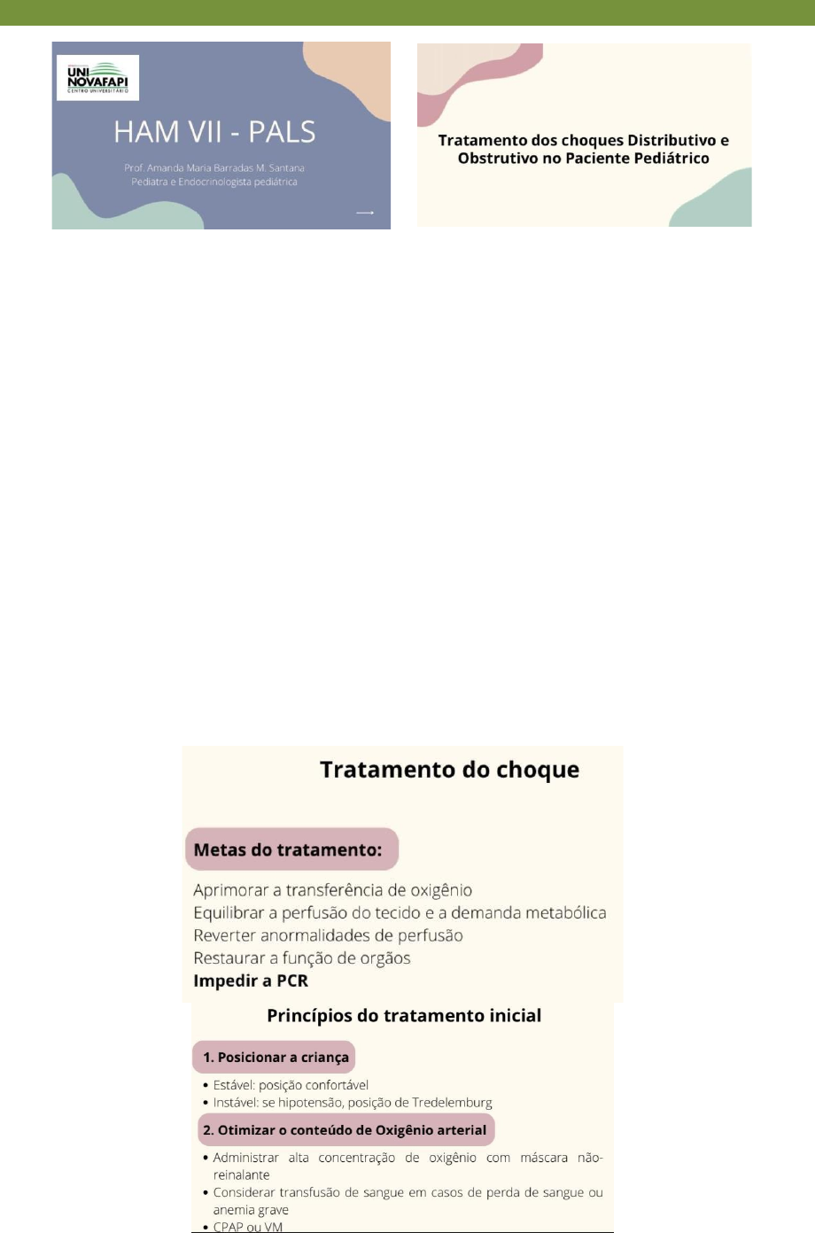 TRANSCRIÇÃO DE CHOQUE DISTRIBUTIVO E OBSTRUTIVO PEDIÁTRICO Vamos falar sobre os tratamentos dos choques distributivos e obstrutivos. Revisão rapidamente: Choque é uma condição que a gente tem uma diminuição da distribuição adequada do oxigênio e dos nutrientes, a meta principal do tratamento é reestabelecer esse fluxo e a perfusão dos tecidos, restaurando as funções dos órgãos. Vamos reposicionar a criança, se estiver instável colocar em uma posição que melhore o retorno venoso para melhorar a pressão, vamos dar aporte de oxigênio - como é uma criança que está mais grave, optamos por uma máscara não reinalante, que tem um aporte de oxigênio mais alto - acima de 95% - vamos estabelecer o acesso vascular, de preferência venoso, mas se não for possível, podemos abrir mão do acesso intraósseo, e um dos pilares principais do tratamento do choque é a ressuscitação volêmica a feita com cristalóides isotônicos 20ml/kg a princípio e pode ficar repetindo até 3 vezes em geral. Só uma ressalva, que os choques cardiogênicos e obstrutivos, como o fluxo não vai está adequado, seja por uma disfunção miocárdica, seja pela obstrução, temos que fazer uma infusão de um volume menor, 5 - 10ml para não fazer uma sobrecarga de volume. Sempre monitorizar todos os parâmetros e sempre ficar reavaliando para ver se precisa de novas intervenções. Além disso vamos fazer exames laboratoriais, dependendo da necessidade, principalmente em choque séptico - exames para buscar distúrbios metabólicos associados, hemograma, gasometria para ver acidose metabólica. Em alguns casos vamos precisar de um suporte farmacológico, como por exemplo em um choque séptico do tipo distributivo que precisa de uma droga vasoativa quando apenas volume não é suficiente, ou no caso de choque cardiogênico, onde precisamos de drogas que melhorem o inotropismo (capacidade de contração da musculatura cardíaca), ou que dilatem as coronárias para irrigar melhor o coração e melhorar a contratilidade. Hoje iremos focar nos tratamentos dos choques distributivos e obstrutivos, vocês já viram os outros dois com a professora Brenda. Então, relembrando o choque distributivo, não temos diminuição da volemia mas temos uma hipovolemia relativa porque o sangue está estagnado pela vasodilatação sistêmica que acontece no próprio mecanismo da sepse, da anafilaxia, no choque neurogênico. Os 3 tipos principais: Choque Séptico; Choque Anafilático; Choque Neurogênico. O Choque Séptico é secundário a uma infecção, o próprio microorganismo libera toxinas, que ativam mediadores inflamatórios e levam a vasodilatação, aumento da permeabilidade e vai caracterizar a sobrecarga reduzida não pela diminuição da volemia, mas pela estagnação do sangue. Outra característica muito importante é que a pós carga não está aumentada, como nos outros tipos de choque, como no hipovolêmico, cardiogênico - principalmente nos choques frios, temos aumento da resistência vascular sistêmica e isso causa um aumento da pós carga como um mecanismo compensatório - Isso não vemos no choque distributivo, em nenhum dos 3 tipos, essa pós carga vai estar variada. Então qual vai ser o tratamento do Choque Séptico? Qual a meta de tratamento? - Restabelecer a estabilidade hemodinâmica e Controlar essa infecção. Vamos, assim como em todos os choques, administrar oxigênio, fazer ventilação de suporte, monitorização - Vamos fazer uma administração agressiva de fluidos com cristalóide isotônico, 20 ml/kg, repetir quando necessário, em geral até 3 vezes - sempre monitorizando a questão da sobrecarga de volume (auscultando para ver se não tem estertores - que seria edema pulmonar), olhar se há hepatomegalia, edema de membros inferiores, olhar se tem sobrecarga sistêmica, e antibioticoterapia na 1ª hora, fundamental no choque séptico - lembrar sempre de fazer cultura e aí iniciar o antibiótico, mas não espera esse resultado para iniciar, isso vai melhorar muito o prognóstico. Se a criança for refratária a essa ressuscitação volêmica, vamos lançar a mão de drogas vasoativas, a droga que vamos usar vai depender das características do choque. De uma forma simples: - Choque Frio: Epinefrina; - Choque Quente: Noraepinefrina. OBS: Lembrando que epinefrina é o mesmo que adrenalina e noraepinefrina é o mesmo que noradrenalina. Noraepinefrina causa vasoconstrição, e como o Choque Séptico vasodilata (os mediadores inflamatórios causam essa vasodilatação sistêmica), então a noraepinefrina causa vasoconstrição e melhora o inatropismo. Já a Epinefrina, dependendo da dose, ela tem mais ação de aumentar apenas o inotropismo, por isso é mais usada no Choque Frio. Se for refratário a drogas vasoativas, temos que lembrar que a criança pode evoluir com Insuficiência Adrenal, nesse caso vamos dar Hidrocortisona, em uma dose de insuficiência adrenal que seria 2 mg/kg. Aqui vemos o fluxograma que eu mostrei no PALS: - Tempo 0: identificar o choque, principalmente por alterações da perfusão, mas também pode ser por alterações do estado mental - Vamos fazer suporte ventilatório, obter acesso venoso ou intraósseo. - Dentro dos primeiros 5 minutos: Iniciar ressuscitação volêmica (bolus 20 ml/kg), no PALS ele coloca para repetir 4 vezes ou mais, mas em geral repetimos 3 vezes; quando a criança não responde a 60 ml/kg (lembrar que nunca fazemos de uma vez, 20 em 20, avaliando cada vez) sempre observar sobrecarga, atentar para distúrbios metabólicos, hipoglicemia, hipocalcemia, que podem contribuir para não melhora desse paciente, e iniciar a antibioticoterapia na 1ª hora. Se o choque for refratário a fluidoterapia, vamos optar por uma droga vasoativa (lembrar das diferenças se for para choque frio ou quente). Professora falou que não é necessário saber dose. Lembrar que a droga vasoativa não é uma droga que fazemos só 1 vez, é uma droga contínua,